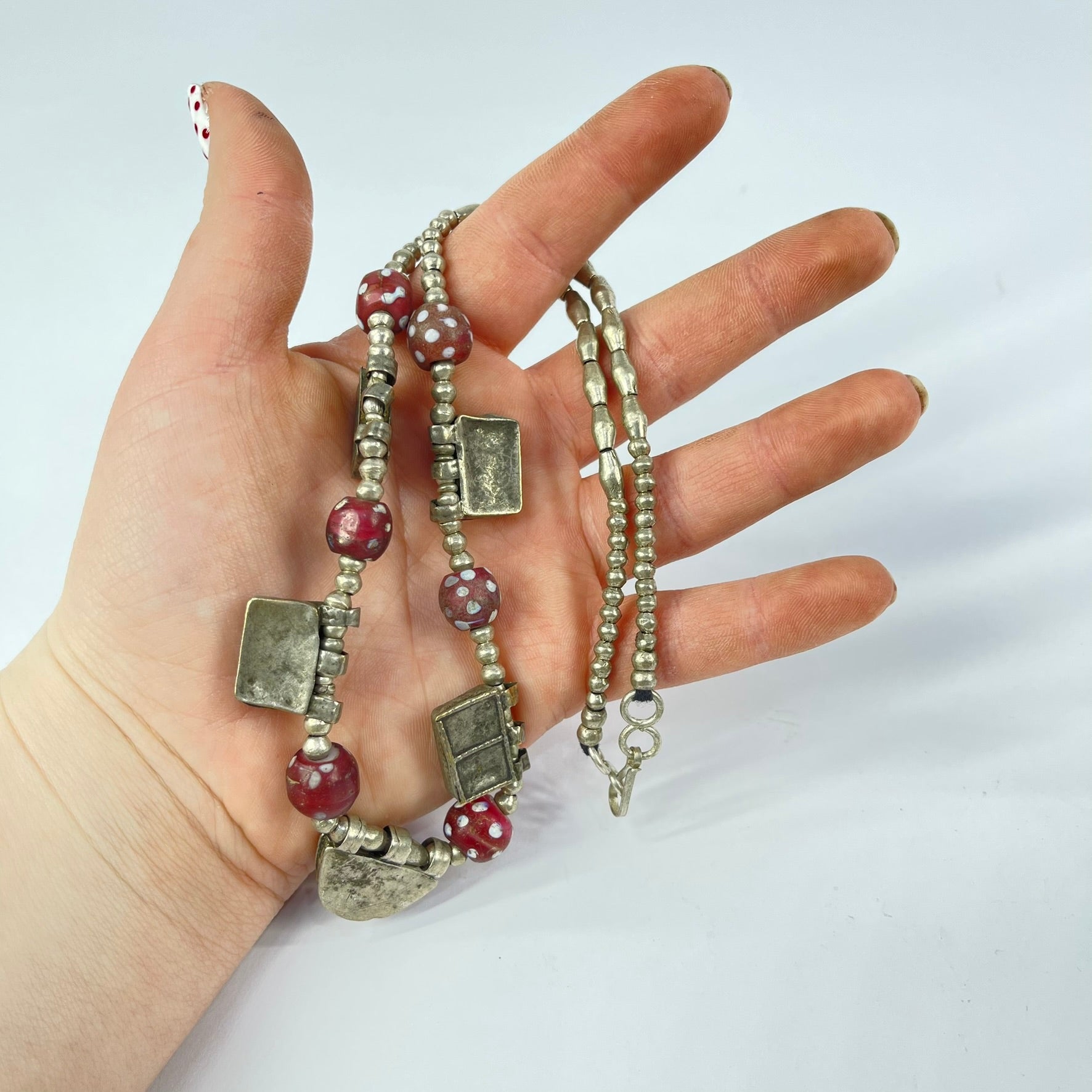 Beautiful Telsum necklace with pendants and white heart red skunk beads.