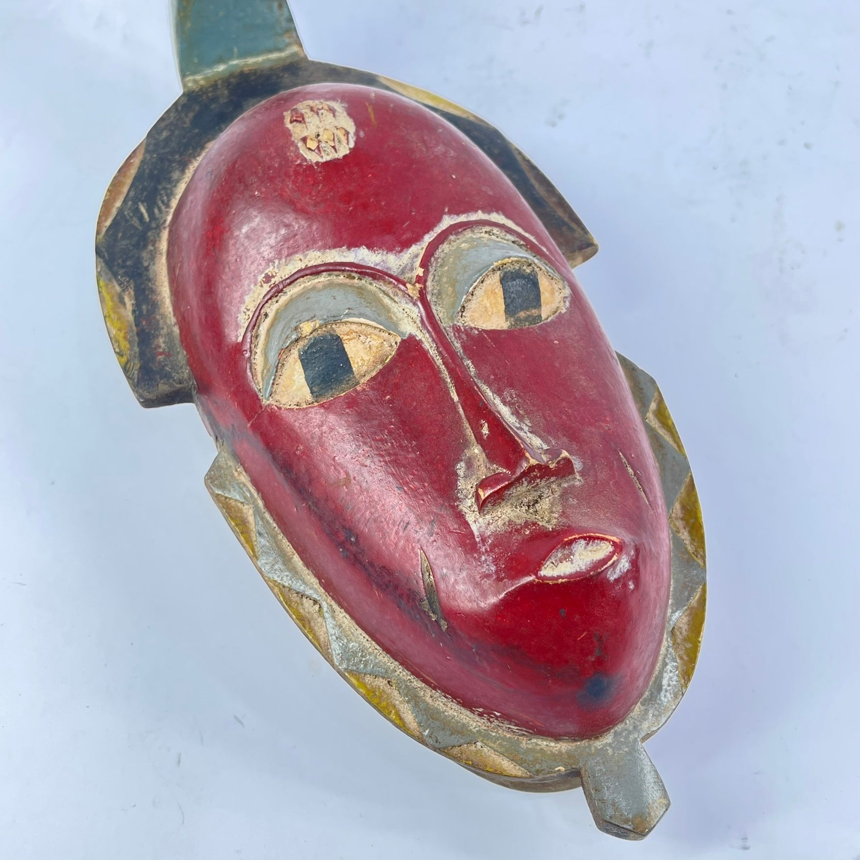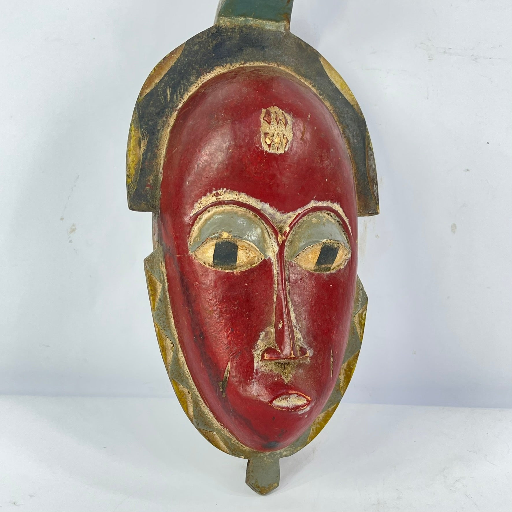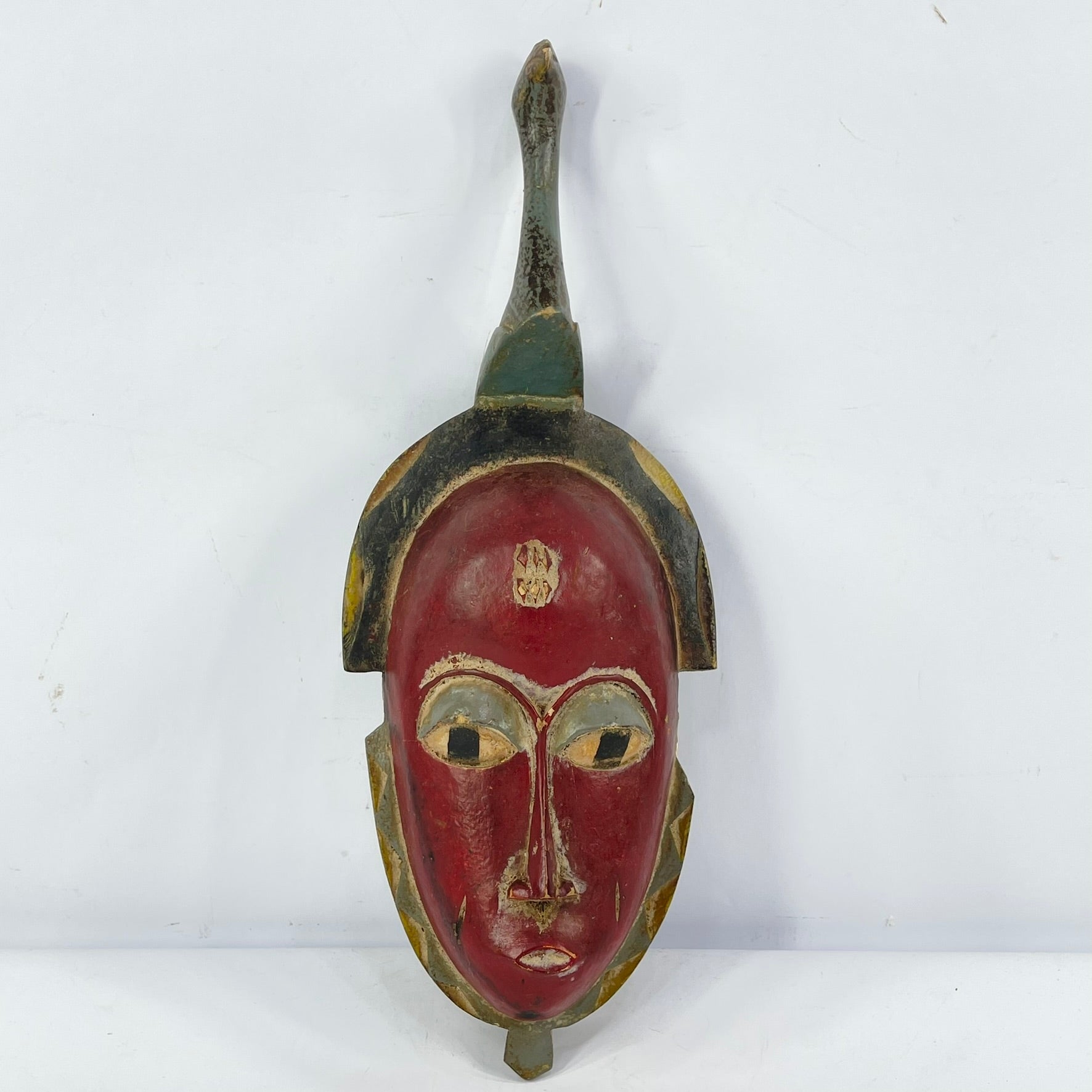 Guro masks are elegant, usually long with pointed chins, and generally the most colorful of African masks. Sometimes there are burn marks on them. They are often repainted, so layers of paint are not uncommon. Such masks were danced in various ceremonies. The daily life of the Guro is dominated by secret societies and by a belief in protective spirits, to whom the Guro used to build shrines and create figures. The most significant in this respect is the Je society, which is responsible for social, political, and juridical questions, decisions of peace and war, policing tasks, and the detection of destructive forces, as well as appearing at funerals of its members. This male society uses a variety of anthropomorphic and zoomorphic masks, some fitted with staff-like superstructures, all ostensibly fatal for women to view. Village life is regulated by a council of elders, representing each main family, and by secret societies. They belong to the category of Je masks and are the first to appear to warm up the audience prior to the appearance of the anthropomorphic masks, considered to be the most important during the performance.
