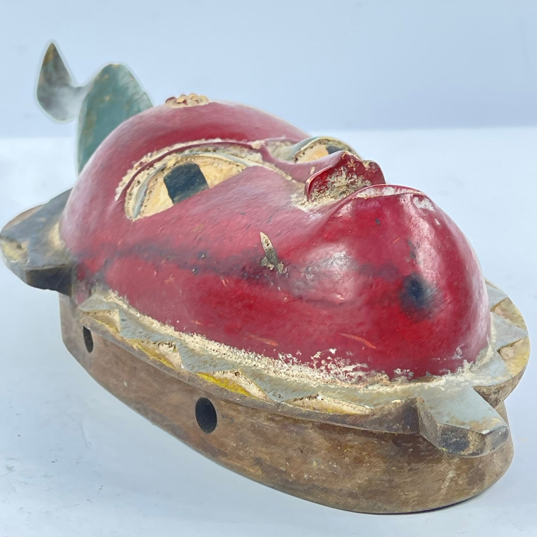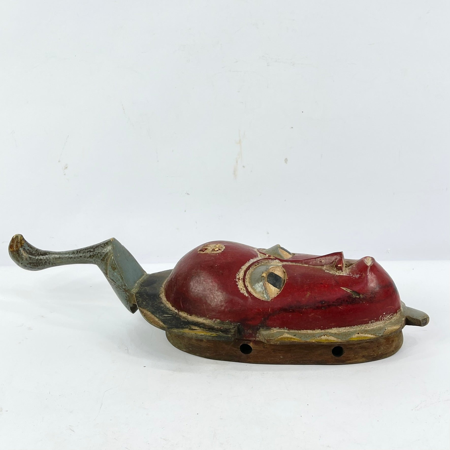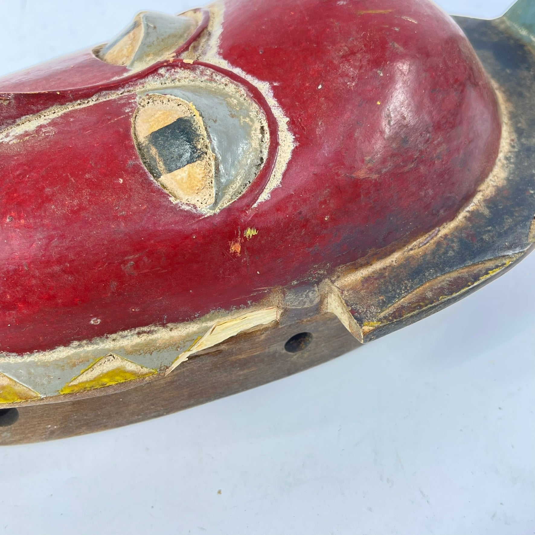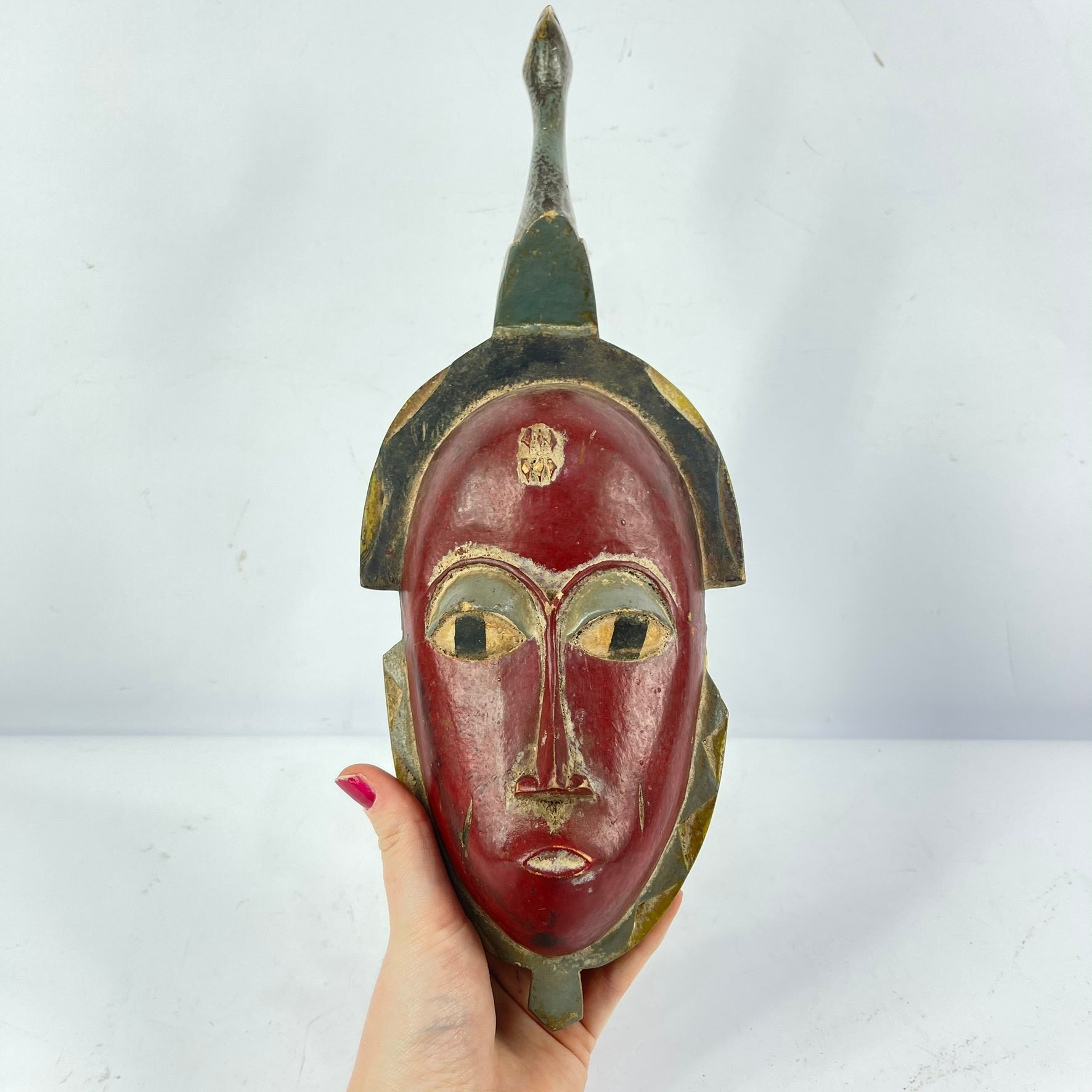 Guro masks are elegant, usually long with pointed chins, and generally the most colorful of African masks. Sometimes there are burn marks on them. They are often repainted, so layers of paint are not uncommon. Such masks were danced in various ceremonies. The daily life of the Guro is dominated by secret societies and by a belief in protective spirits, to whom the Guro used to build shrines and create figures. The most significant in this respect is the Je society, which is responsible for social, political, and juridical questions, decisions of peace and war, policing tasks, and the detection of destructive forces, as well as appearing at funerals of its members. This male society uses a variety of anthropomorphic and zoomorphic masks, some fitted with staff-like superstructures, all ostensibly fatal for women to view. Village life is regulated by a council of elders, representing each main family, and by secret societies. They belong to the category of Je masks and are the first to appear to warm up the audience prior to the appearance of the anthropomorphic masks, considered to be the most important during the performance.