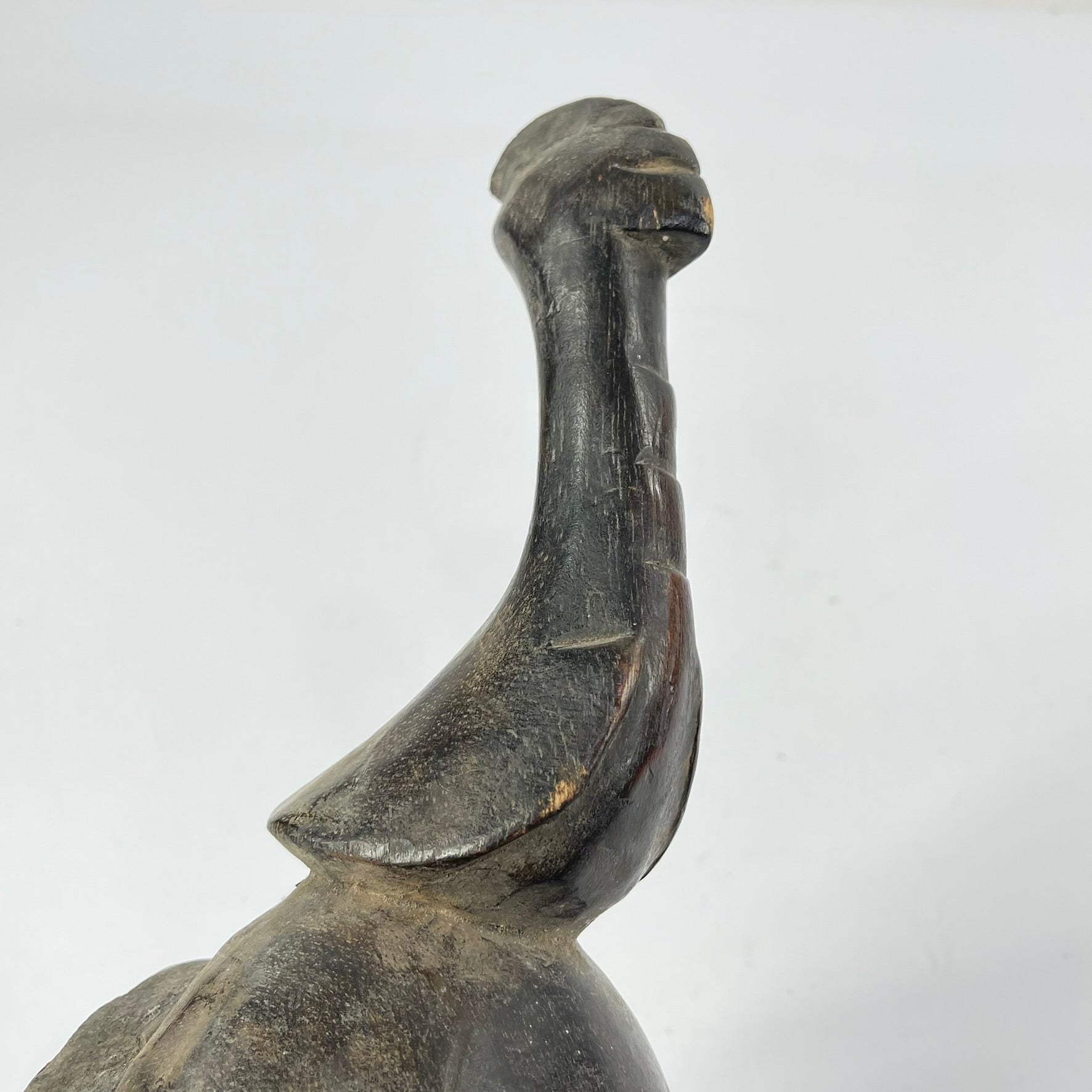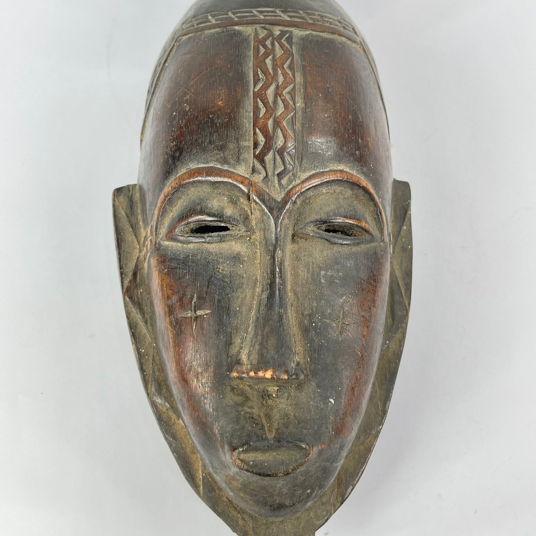 Guro masks are elegant, usually long with pointed chins, and generally the most colorful of African masks. Sometimes there are burn marks on them. They are often repainted, so layers of paint are not uncommon. Such masks were danced in various ceremonies. The daily life of the Guro is dominated by secret societies and by a belief in protective spirits, to whom the Guro used to build shrines and create figures. The most significant in this respect is the Je society, which is responsible for social, political, and juridical questions, decisions of peace and war, policing tasks, and the detection of destructive forces, as well as appearing at funerals of its members. This male society uses a variety of anthropomorphic and zoomorphic masks, some fitted with staff-like superstructures, all ostensibly fatal for women to view. Village life is regulated by a council of elders, representing each main family, and by secret societies. They belong to the category of Je masks and are the first to appear to warm up the audience prior to the appearance of the anthropomorphic masks, considered to be the most important during the performance.