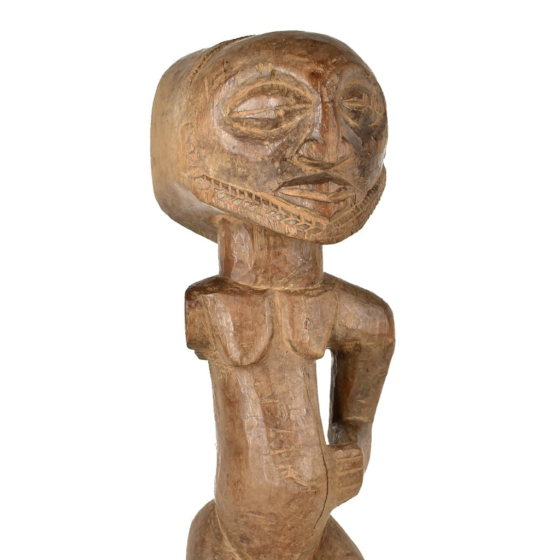 Art plays a crucial role in the Hemba culture, and their artistic traditions are known for their distinctive carved wooden figures. One notable example is this carved warrior figure. These sculptures often depict male ancestors or chiefs and are characterized by elongated proportions, with an emphasis on balance, symmetry, and a dignified presence. The figures typically feature detailed facial scarification patterns, hairstyles, and traditional attire.