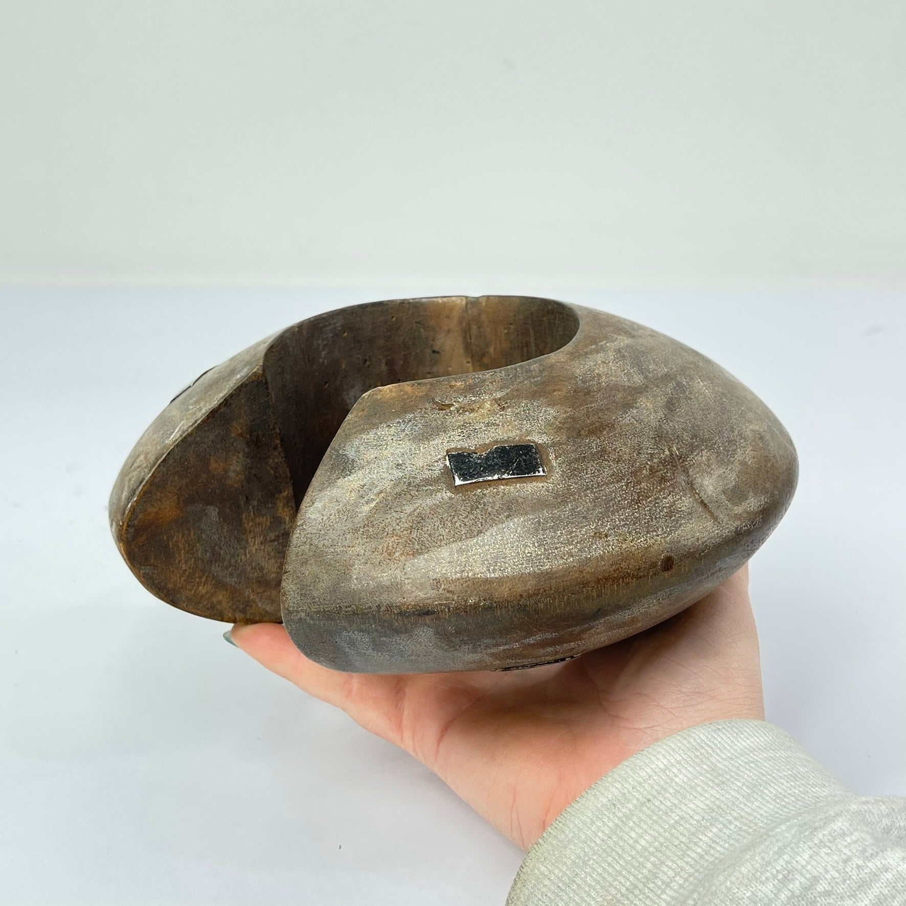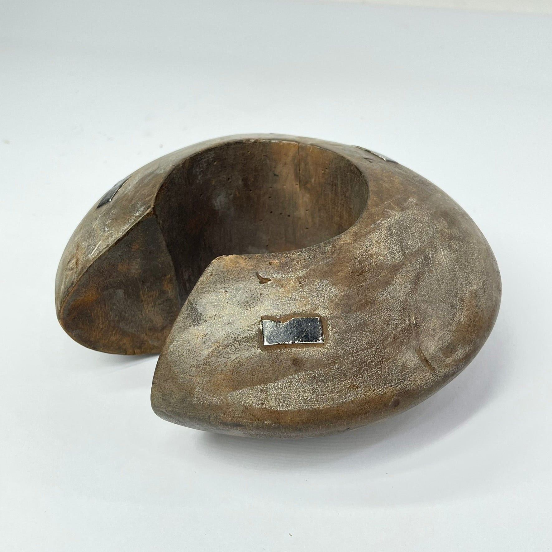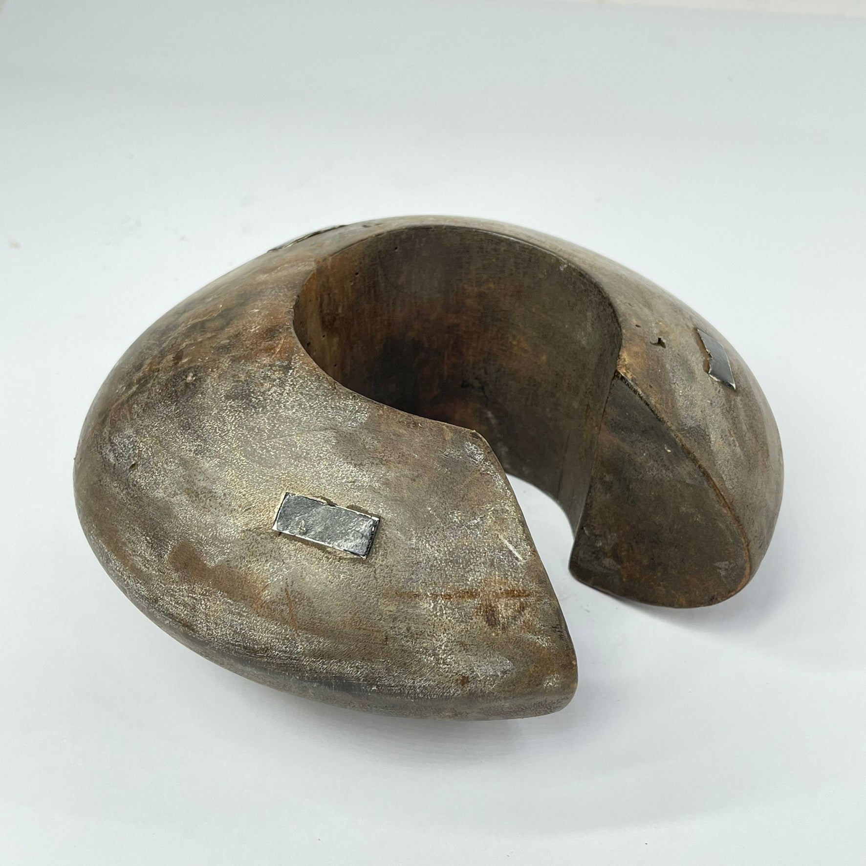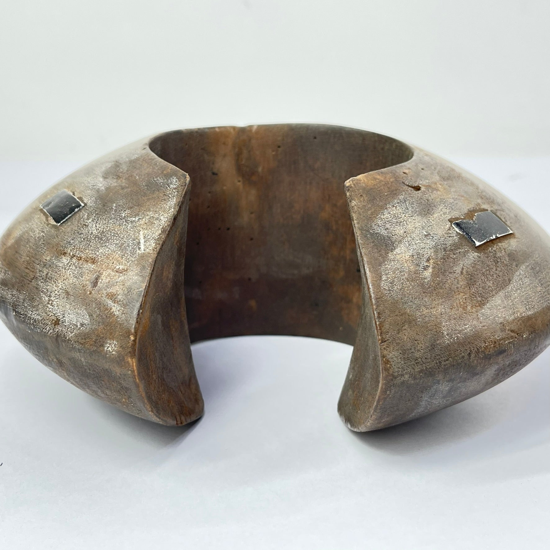 This antique wooden archer's arm guard, originating from the Hutu or Tutsi Tribes of Rwanda and Burundi, serves as a testament to the exceptional craftsmanship of African sculptors. Known as "igitembe," it protected archers from bowstring-related injuries and held cultural significance, identifying wearers as warriors or elite. Adorned with copper squares, chief versions in the nineteenth century featured intricate copper inlays. Rare in collections today, this piece, bearing copper traces and signs of age, offers a unique and valuable glimpse into the history and heritage of the region.