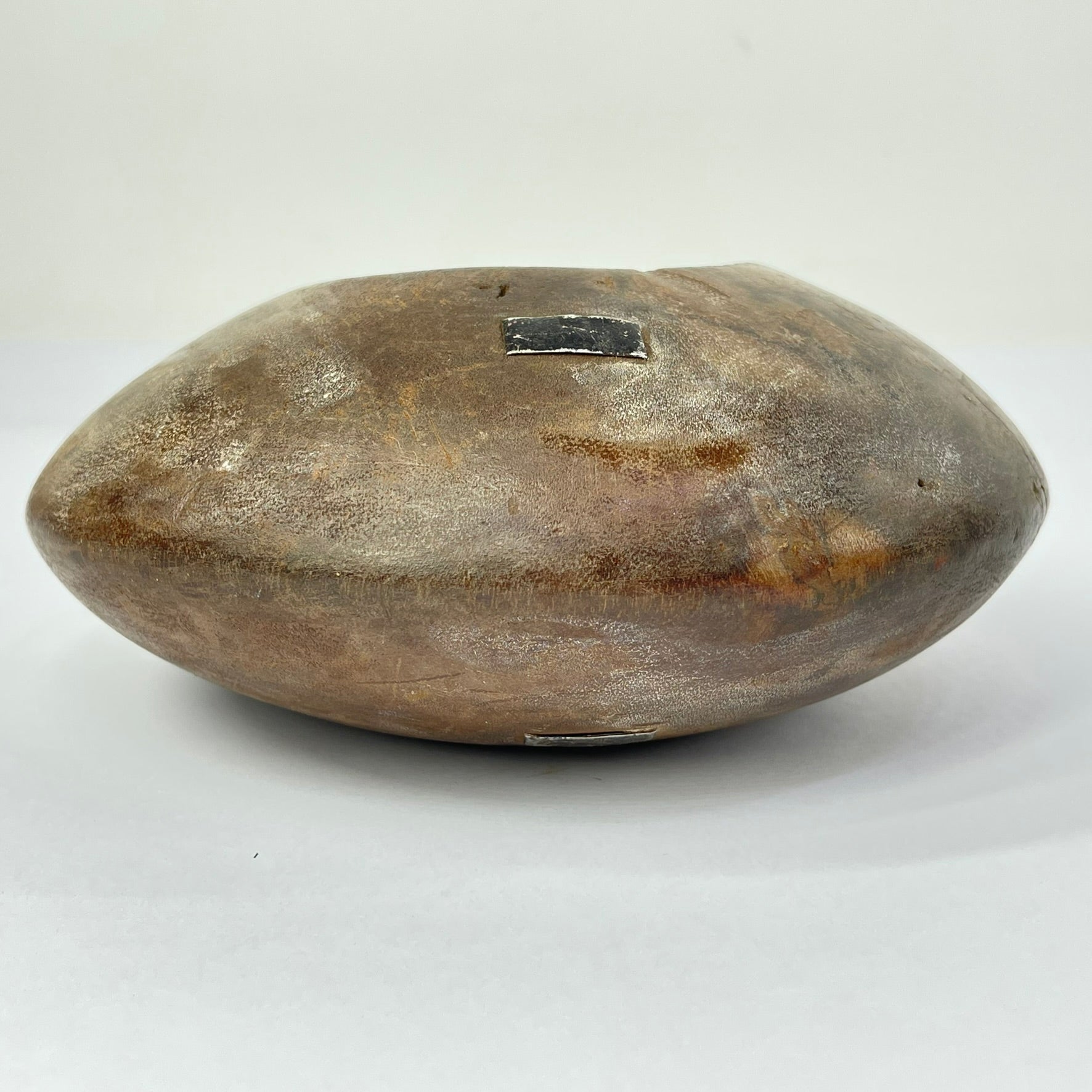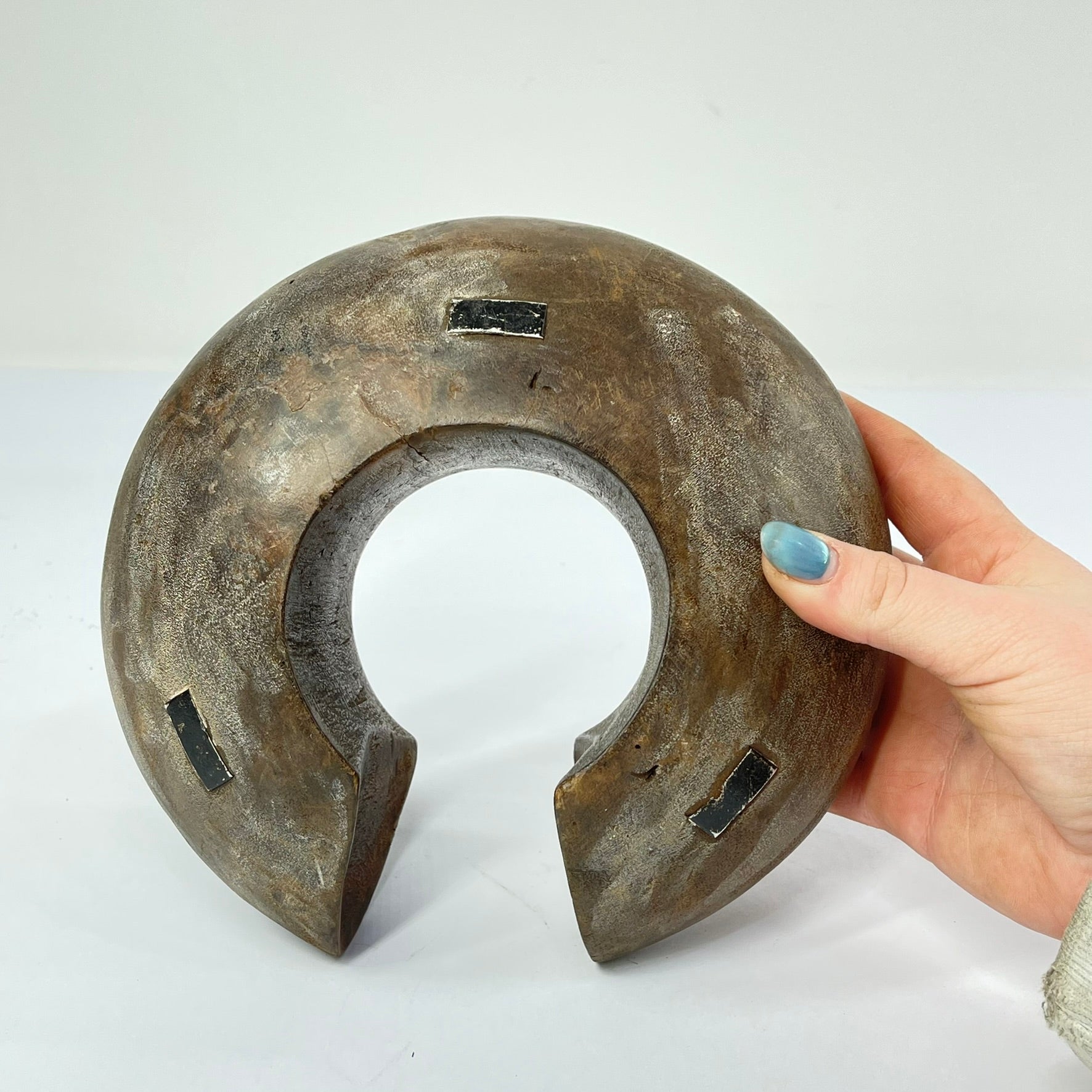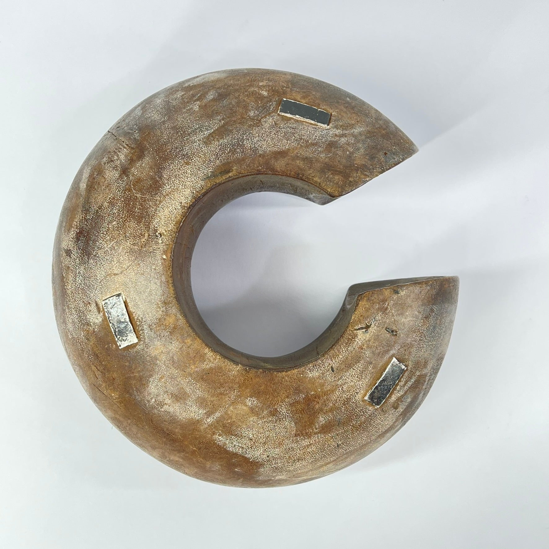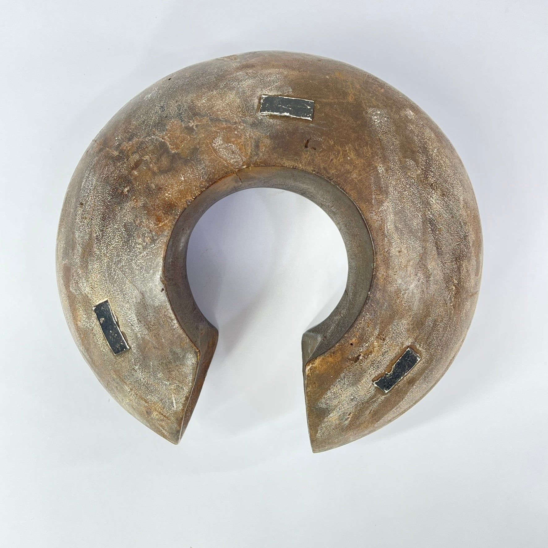 This antique wooden archer's arm guard, originating from the Hutu or Tutsi Tribes of Rwanda and Burundi, serves as a testament to the exceptional craftsmanship of African sculptors. Known as "igitembe," it protected archers from bowstring-related injuries and held cultural significance, identifying wearers as warriors or elite. Adorned with copper squares, chief versions in the nineteenth century featured intricate copper inlays. Rare in collections today, this piece, bearing copper traces and signs of age, offers a unique and valuable glimpse into the history and heritage of the region.