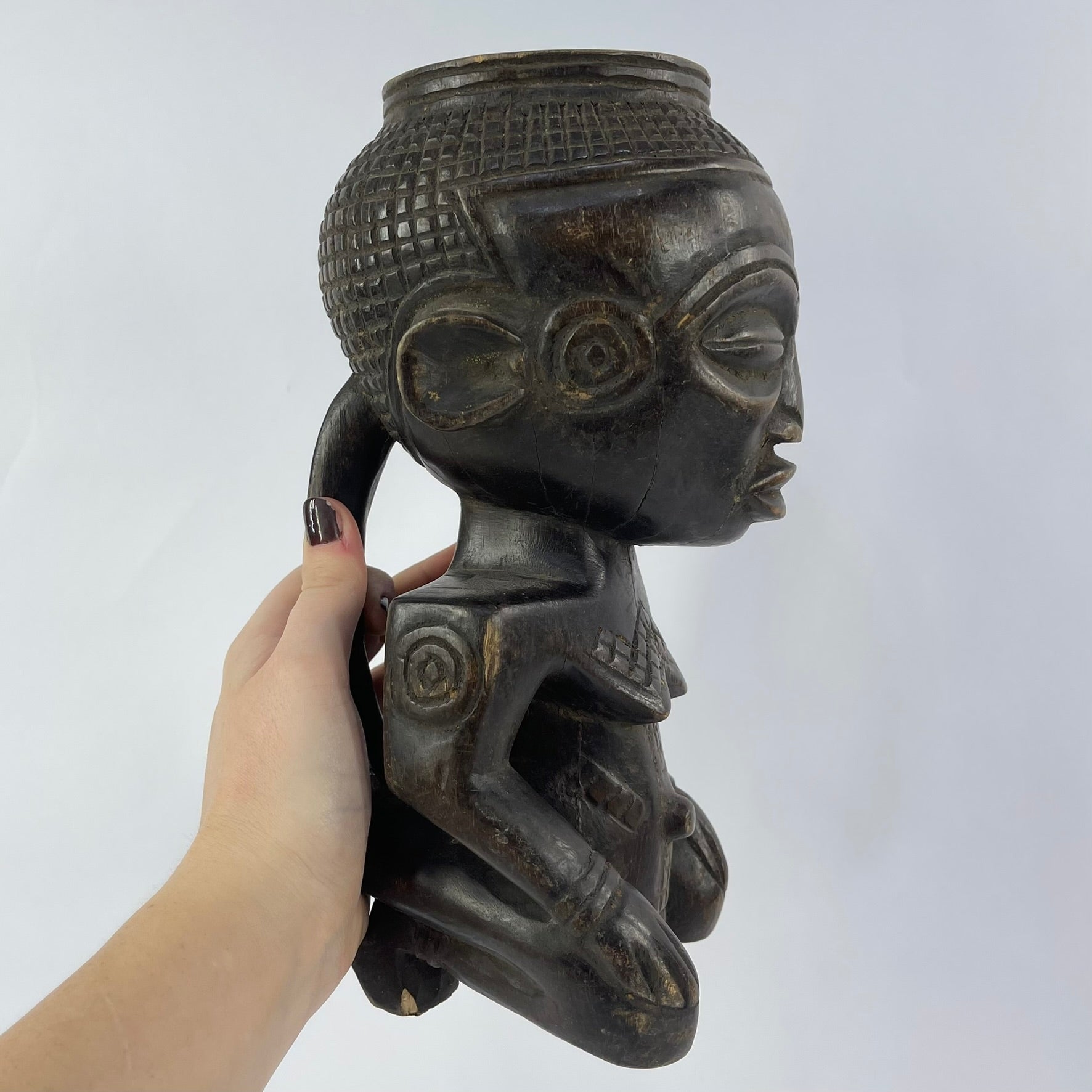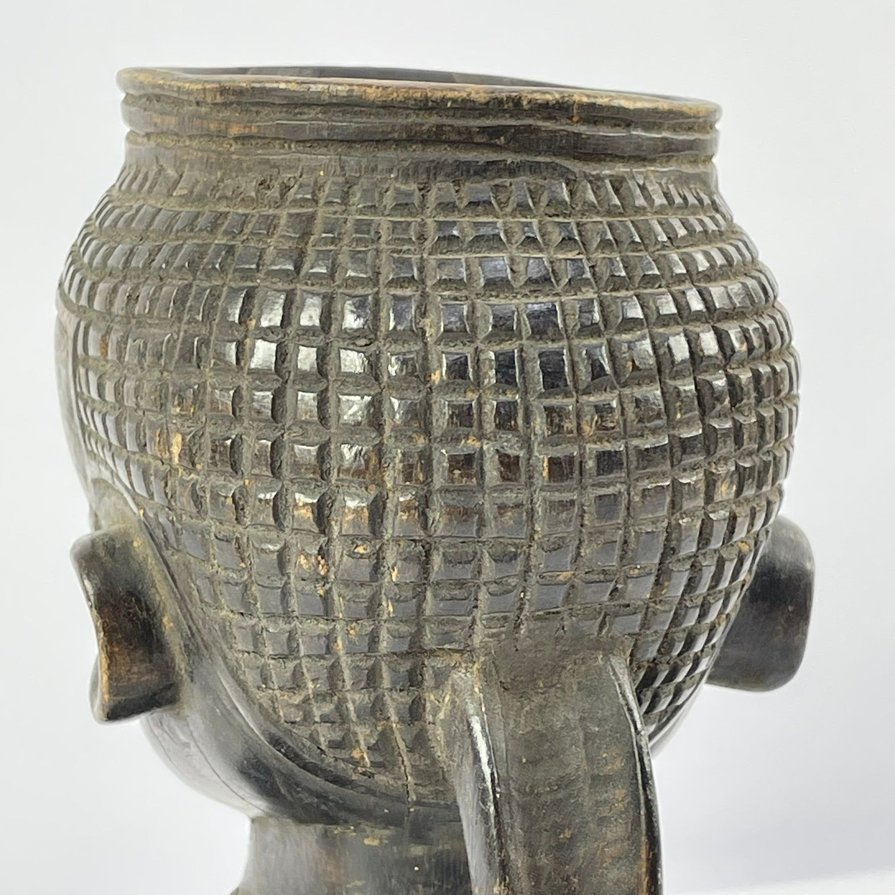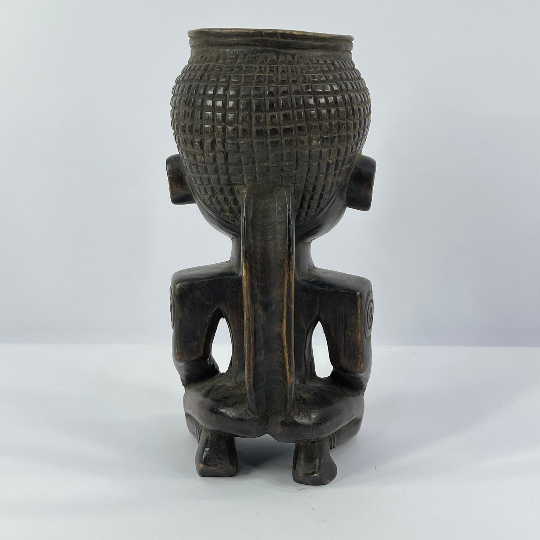 What makes Kuba cups especially striking is their figural decoration. Many feature carved human or animal forms with carefully detailed facial features, hairstyles, and accessories. These sculptural elements are often paired with incised geometric patterns—such as triangles, circles, and squares—that wrap around the surface and enhance the overall composition.