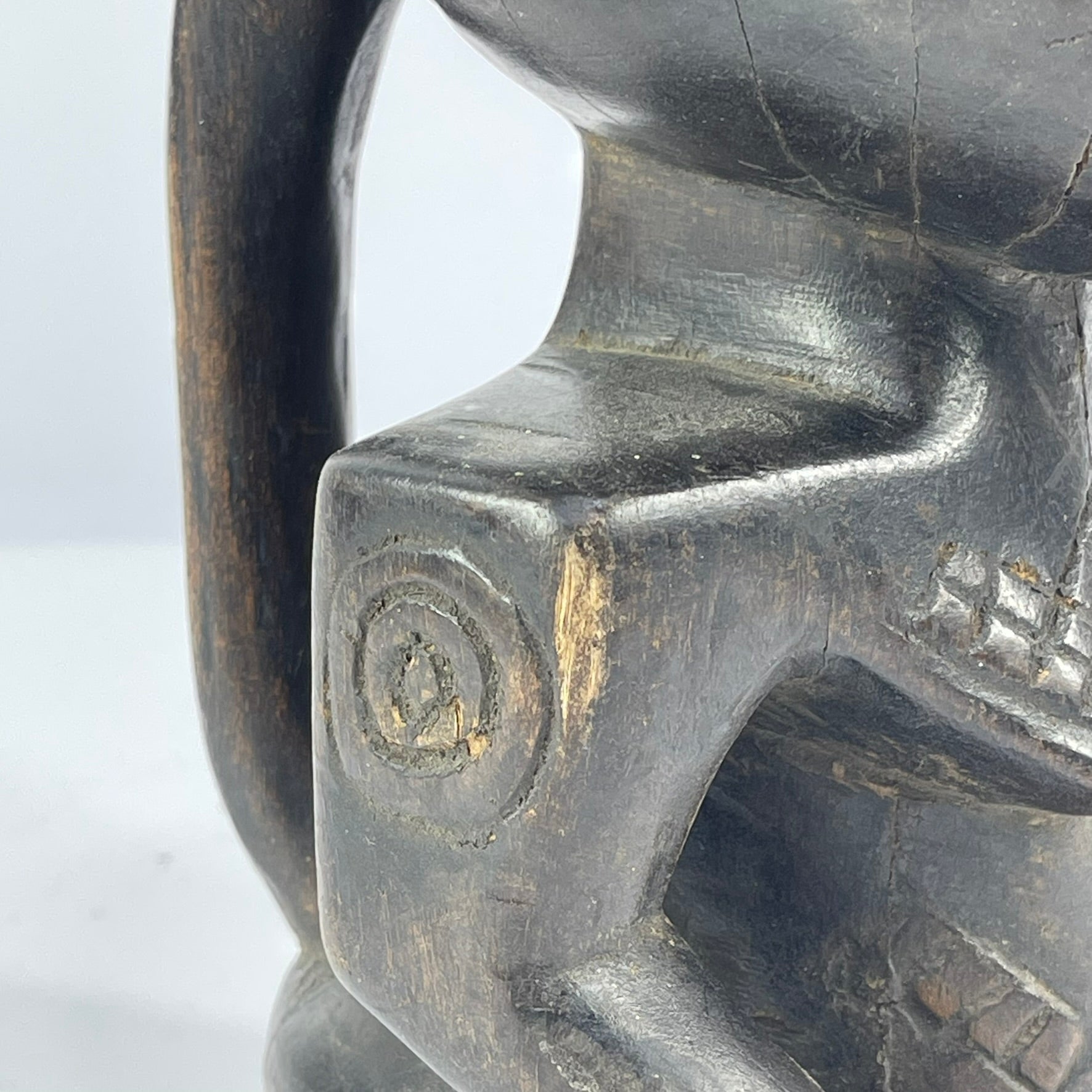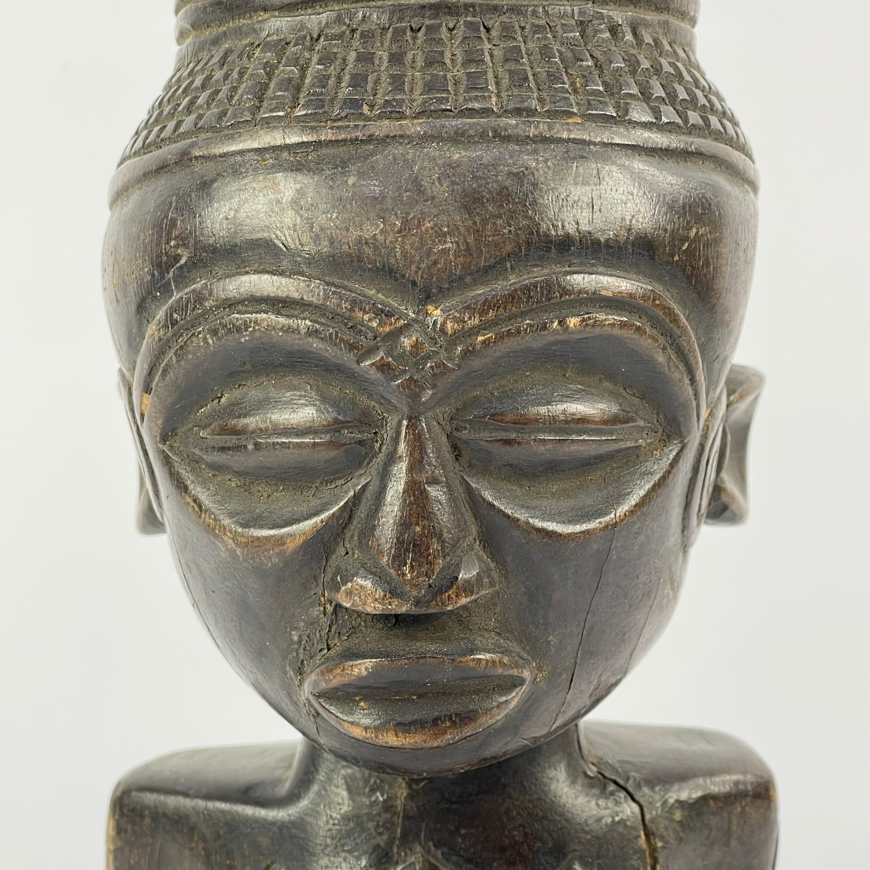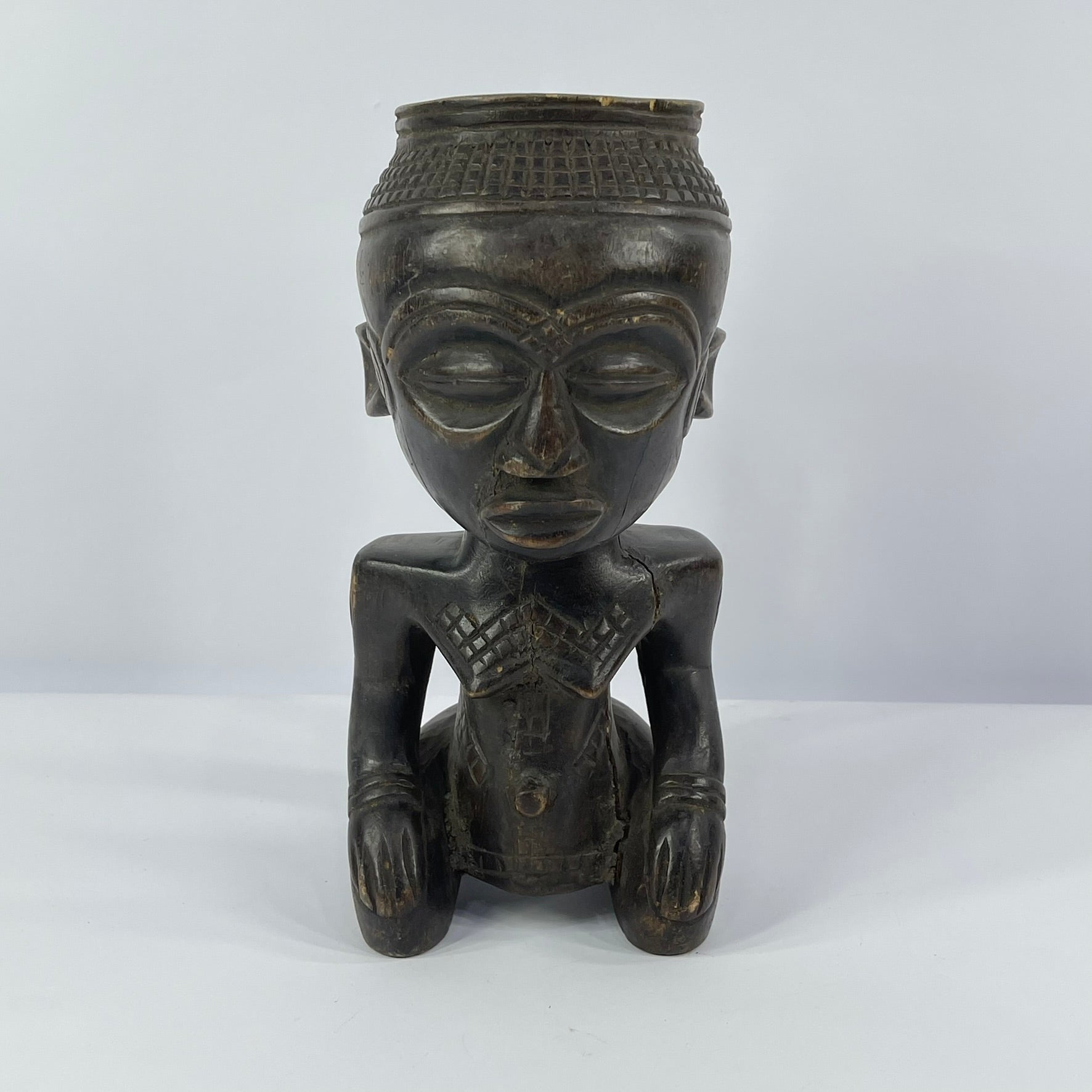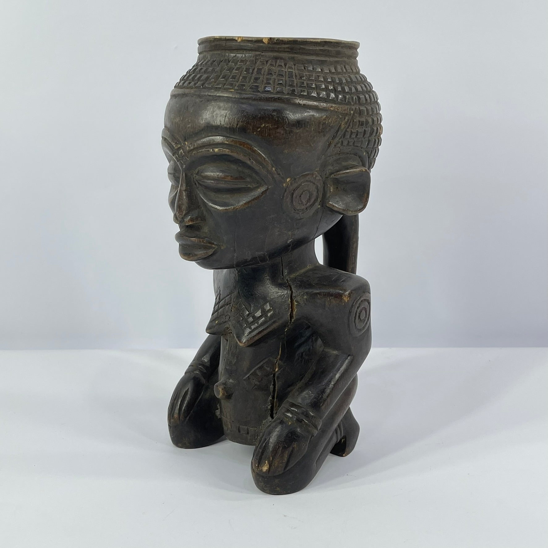What makes Kuba cups especially striking is their figural decoration. Many feature carved human or animal forms with carefully detailed facial features, hairstyles, and accessories. These sculptural elements are often paired with incised geometric patterns—such as triangles, circles, and squares—that wrap around the surface and enhance the overall composition.