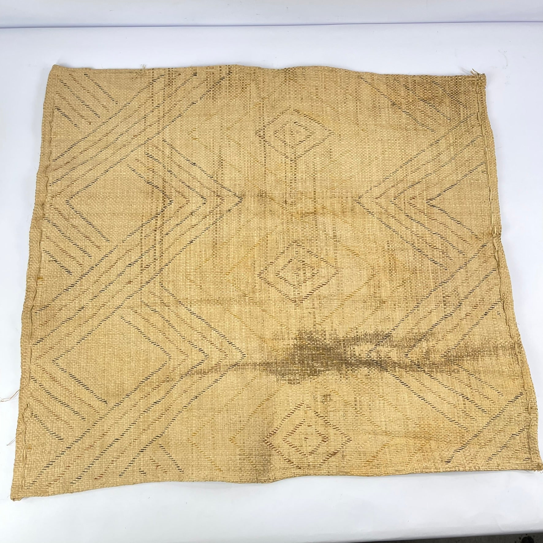 Shoowa (also spelled Bushoong) squares are distinguished by densely worked geometric compositions—interlocking lines, chevrons, grids, and labyrinthine motifs—meticulously built up through embroidery and appliqué over a raffia cloth base. The subtle variation in stitch direction, pile height, and natural fiber tone creates a richly textured surface with remarkable visual depth.