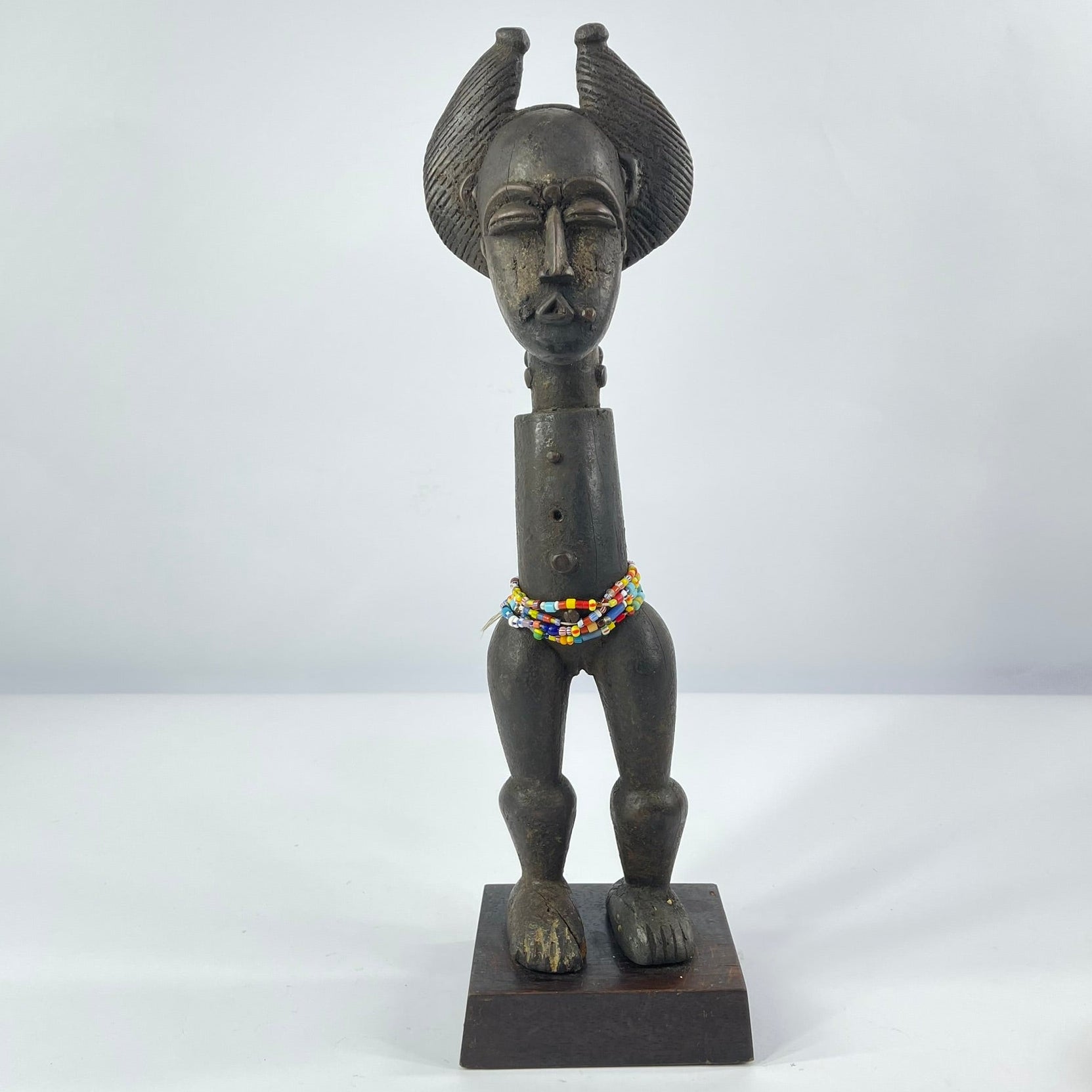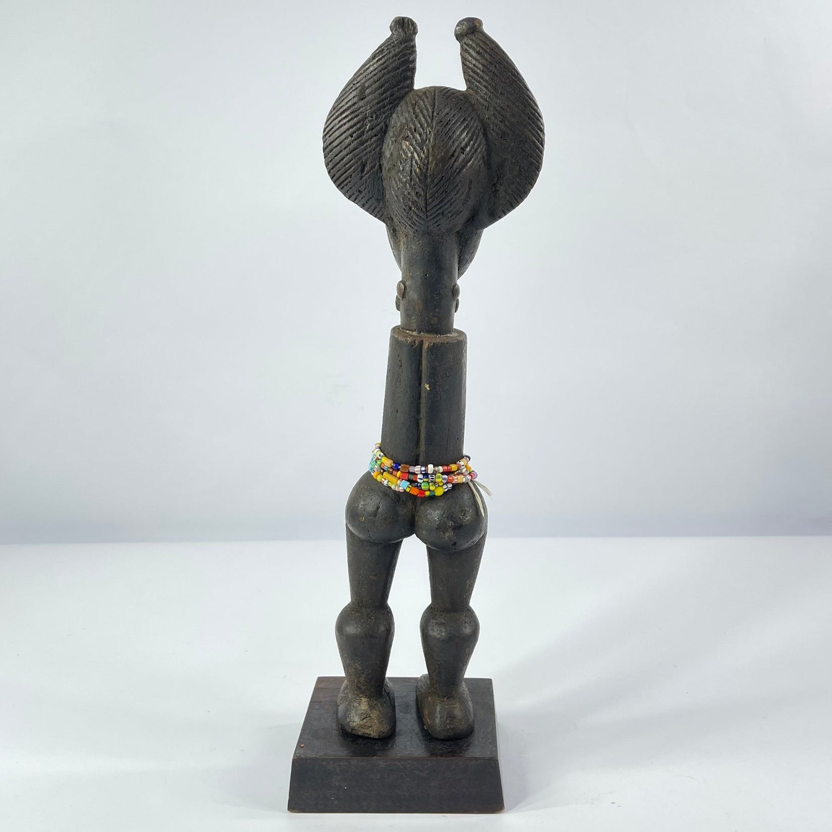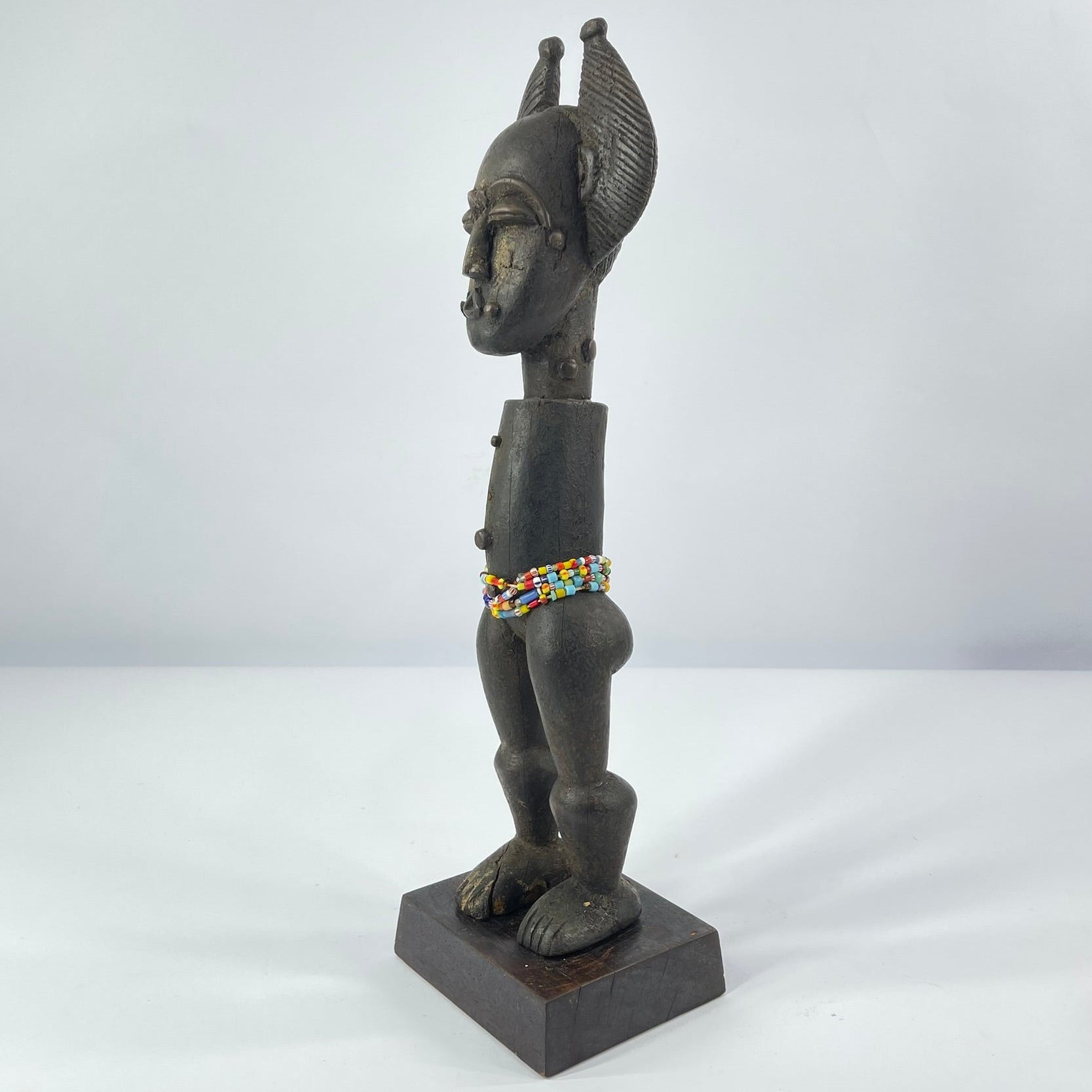 This sculptural figure exemplifies these qualities. Carved in wood, the figure stands upright on a base and is notable for its absence of arms, a deliberate formal choice that emphasizes the elongated torso and powerful legs. The head is crowned with an elaborate, horn-like coiffure framing a stylized face with closed or downcast eyes, conveying a sense of calm, restraint, or spiritual introspection. Beaded adornments around the waist suggest ritual or symbolic significance, rather than everyday representation.