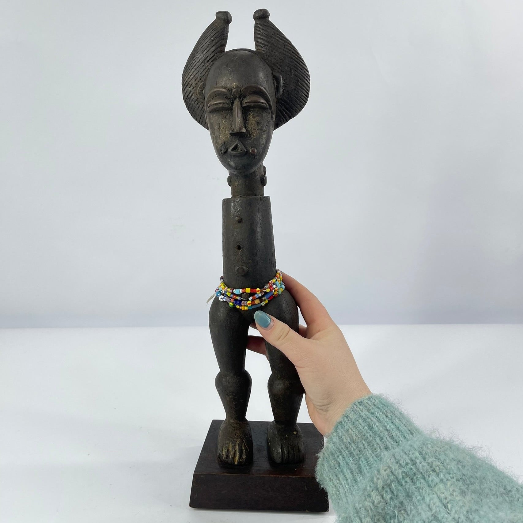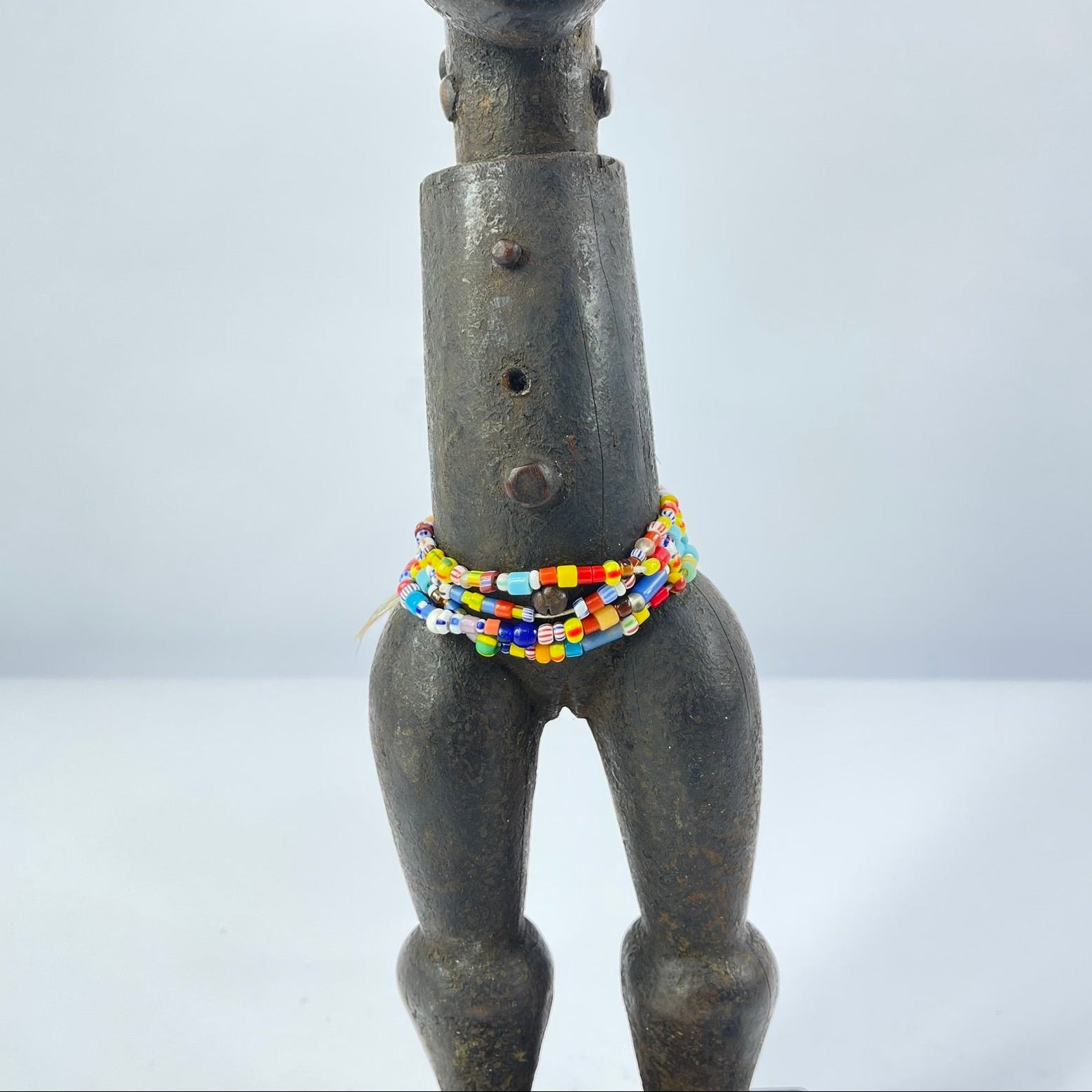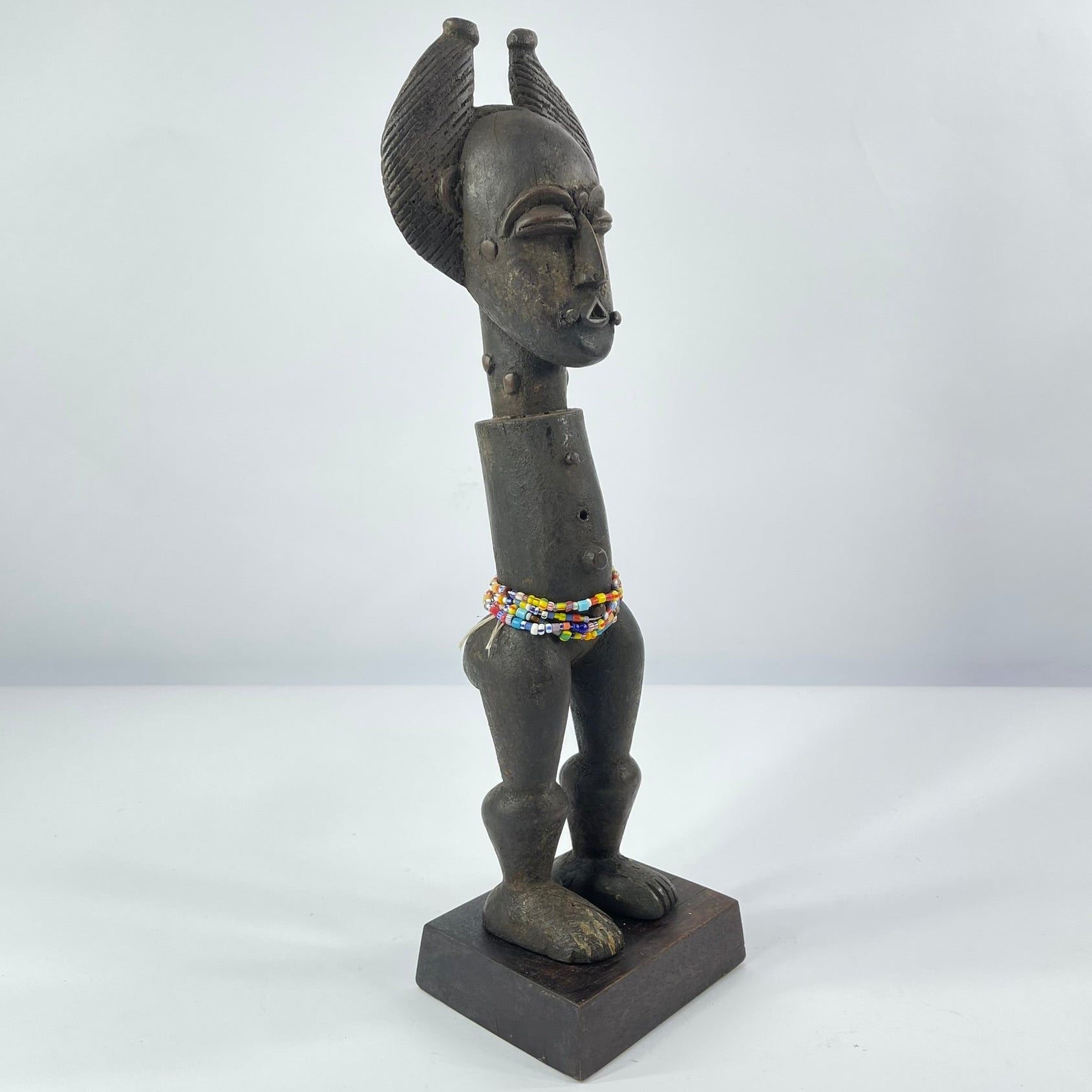 This sculptural figure exemplifies these qualities. Carved in wood, the figure stands upright on a base and is notable for its absence of arms, a deliberate formal choice that emphasizes the elongated torso and powerful legs. The head is crowned with an elaborate, horn-like coiffure framing a stylized face with closed or downcast eyes, conveying a sense of calm, restraint, or spiritual introspection. Beaded adornments around the waist suggest ritual or symbolic significance, rather than everyday representation.