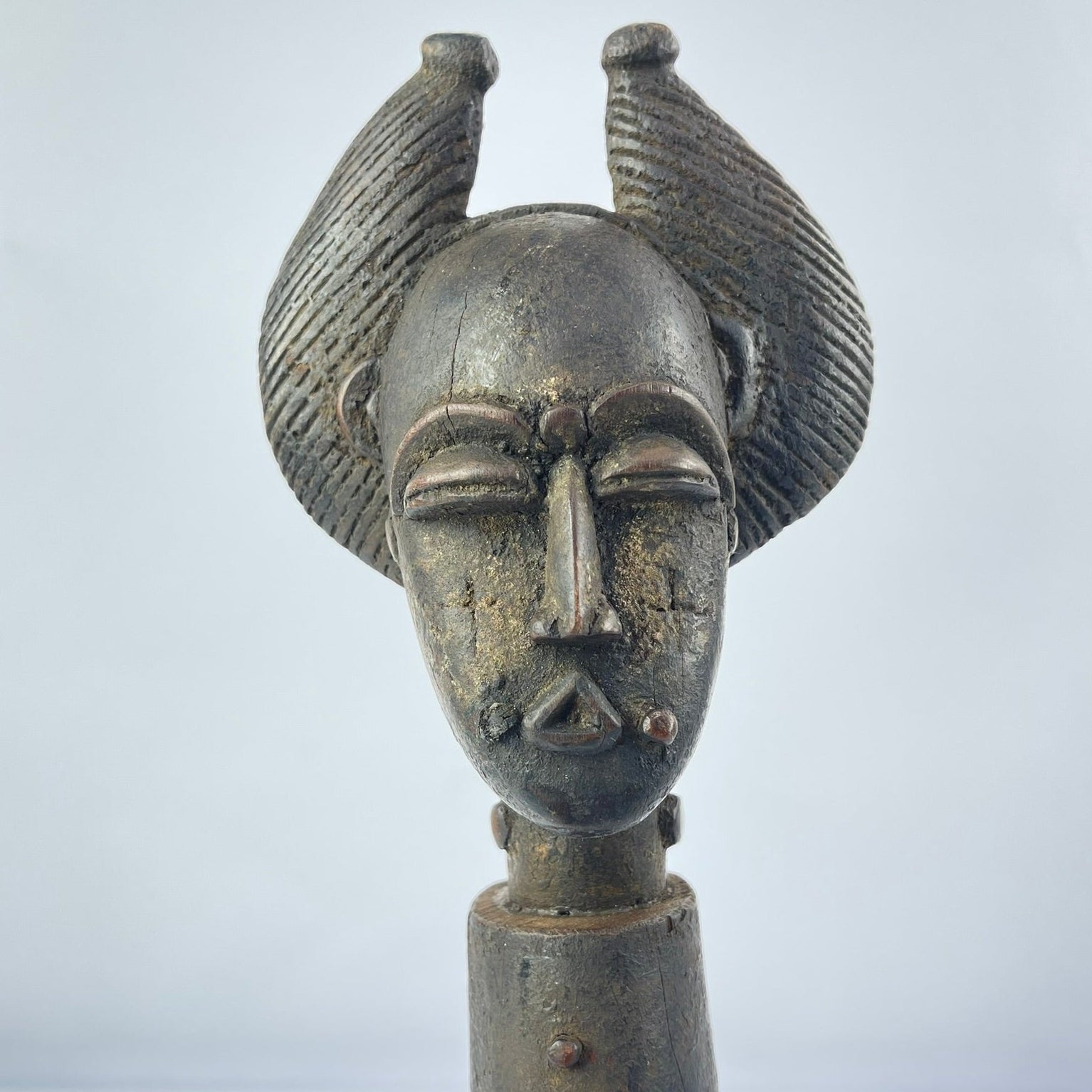 The Kulango people inhabit regions of northeastern Côte d’Ivoire, along the borders of Burkina Faso and Ghana. Although relatively little is documented about Kulango history and social structures, their artistic production is distinctive and highly sought after. Kulango art reflects strong influences from neighboring peoples, particularly the Baule, while maintaining a character that is both enigmatic and expressive. Their works, especially in metal and wood, are noted for a striking freedom of form and bold abstraction.