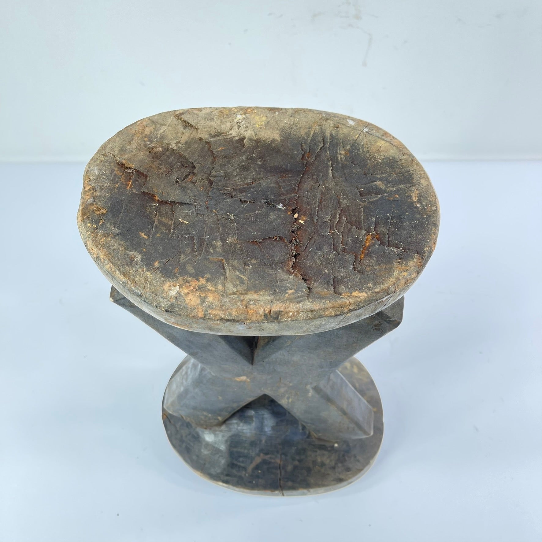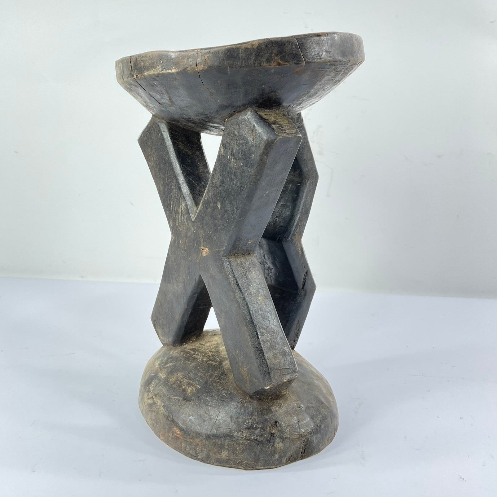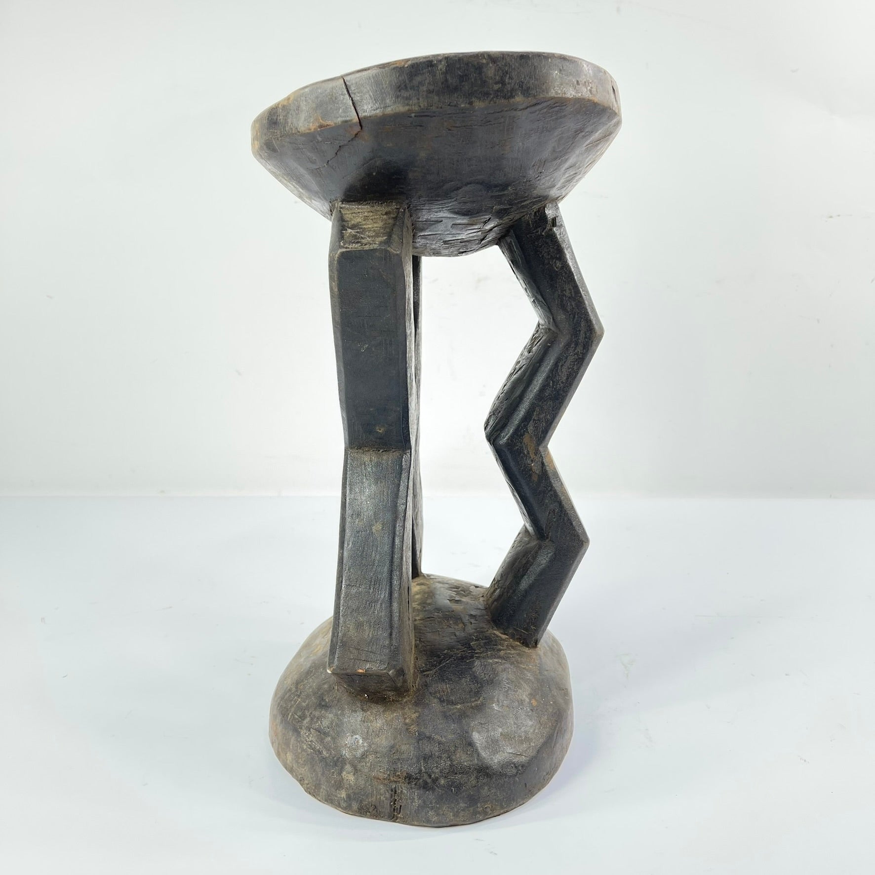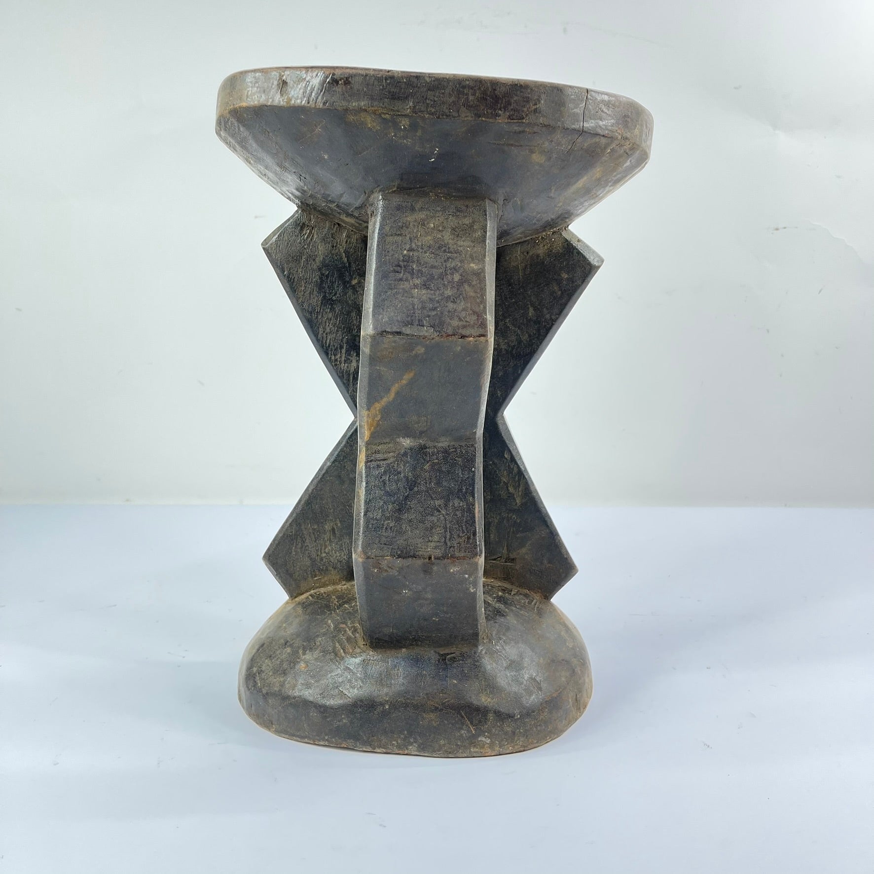 The surface of the stool shows clear evidence of age and use, including handling wear, patina, and minor fissures, all consistent with prolonged ritual and domestic presence. Such wear contributes to the object’s historical integrity and reflects its active role within Kusu social life.
