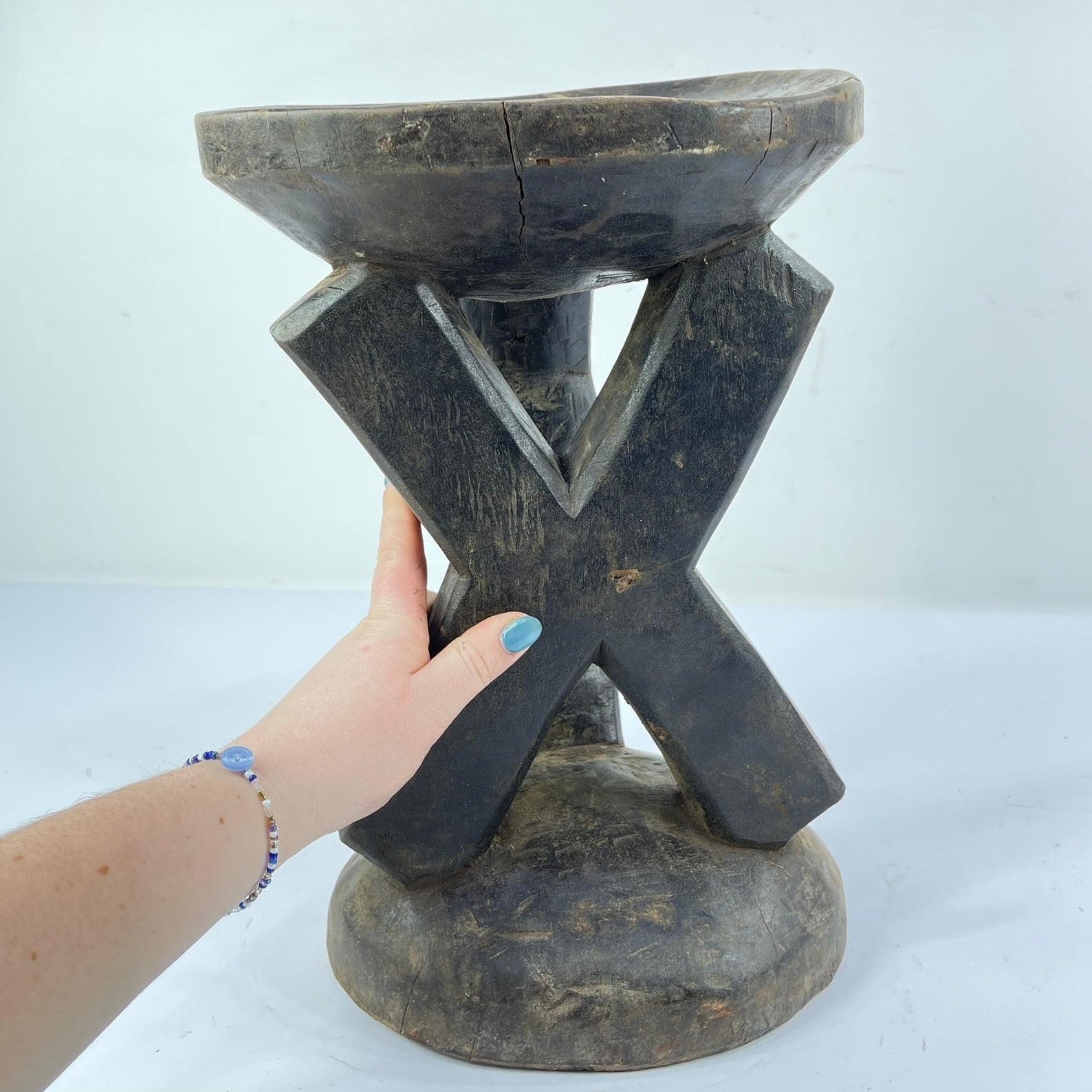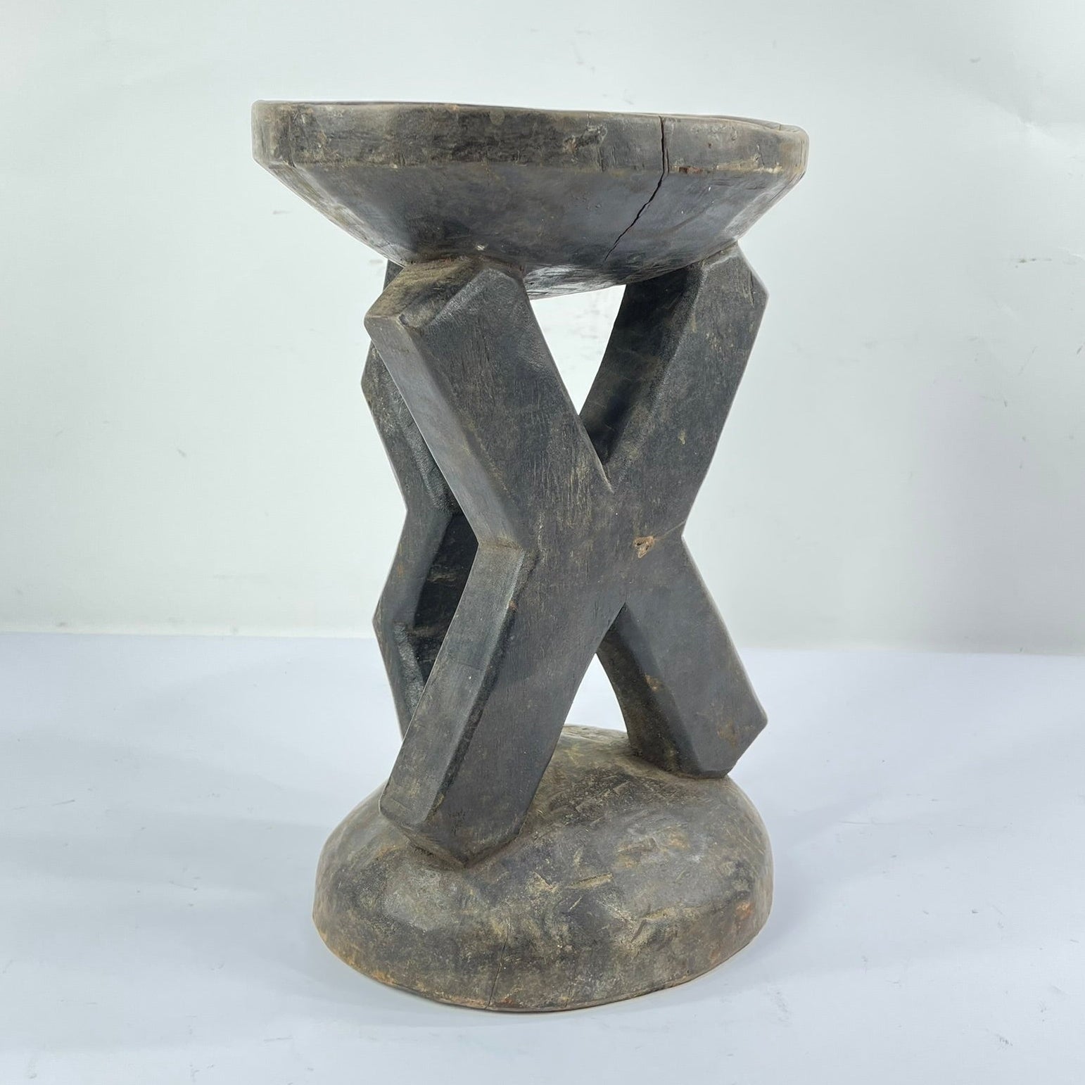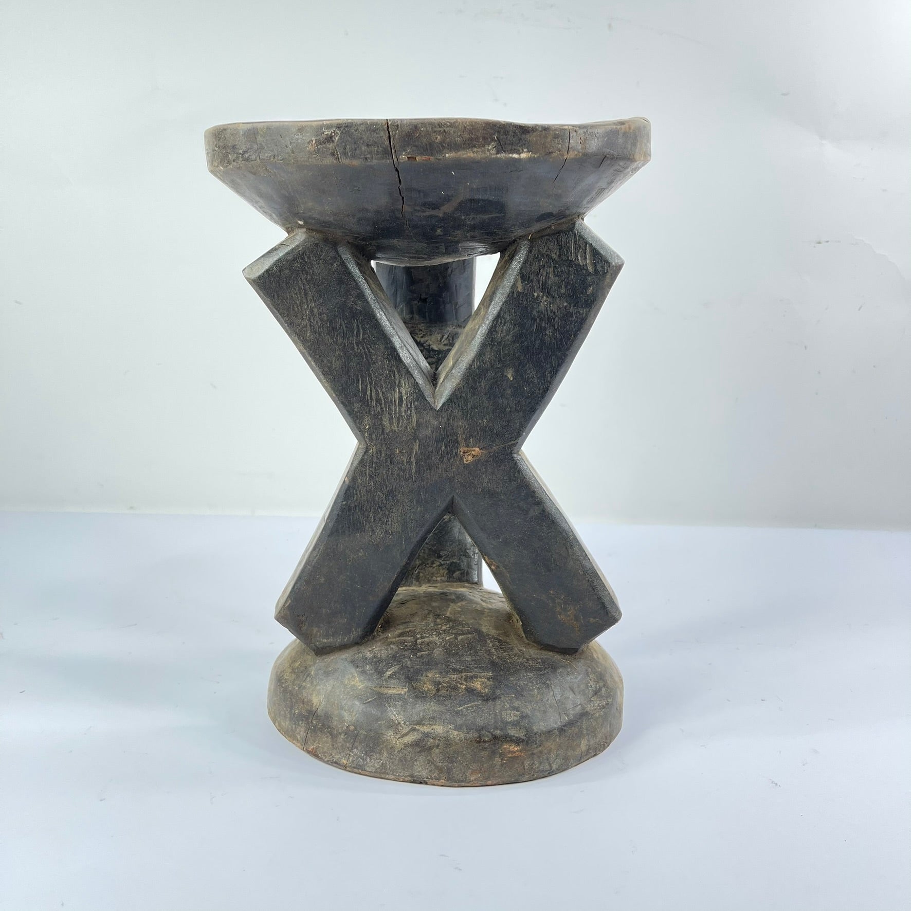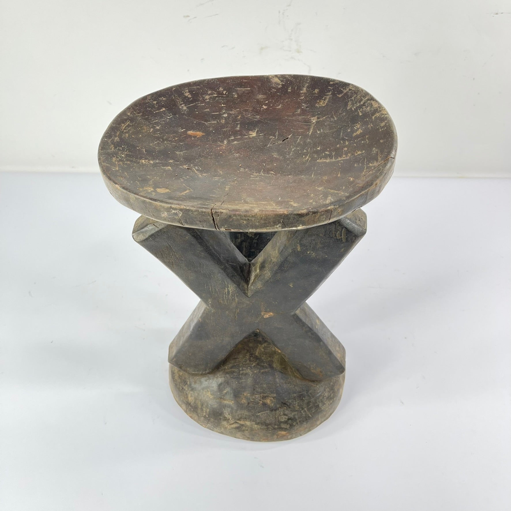 The surface of the stool shows clear evidence of age and use, including handling wear, patina, and minor fissures, all consistent with prolonged ritual and domestic presence. Such wear contributes to the object’s historical integrity and reflects its active role within Kusu social life.
