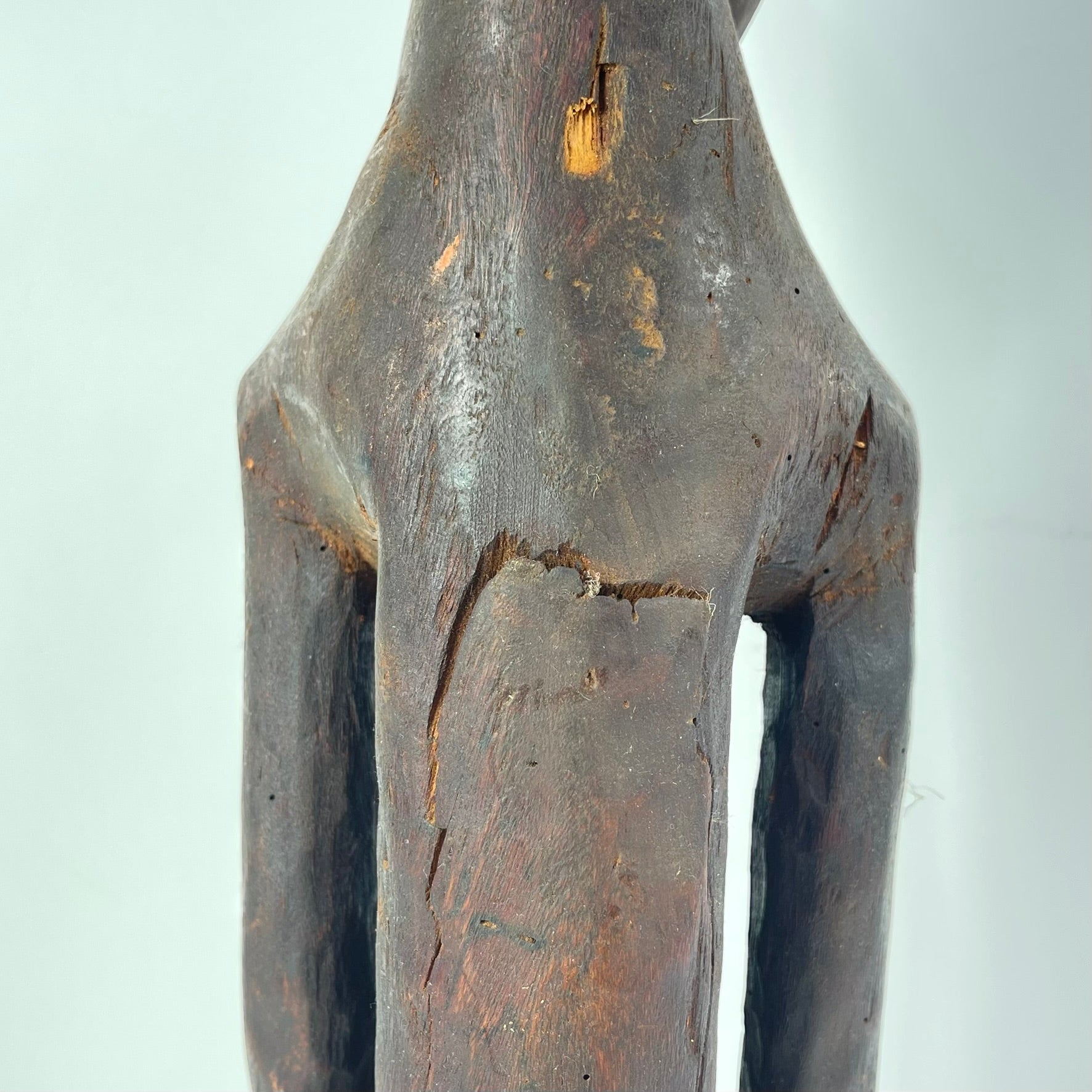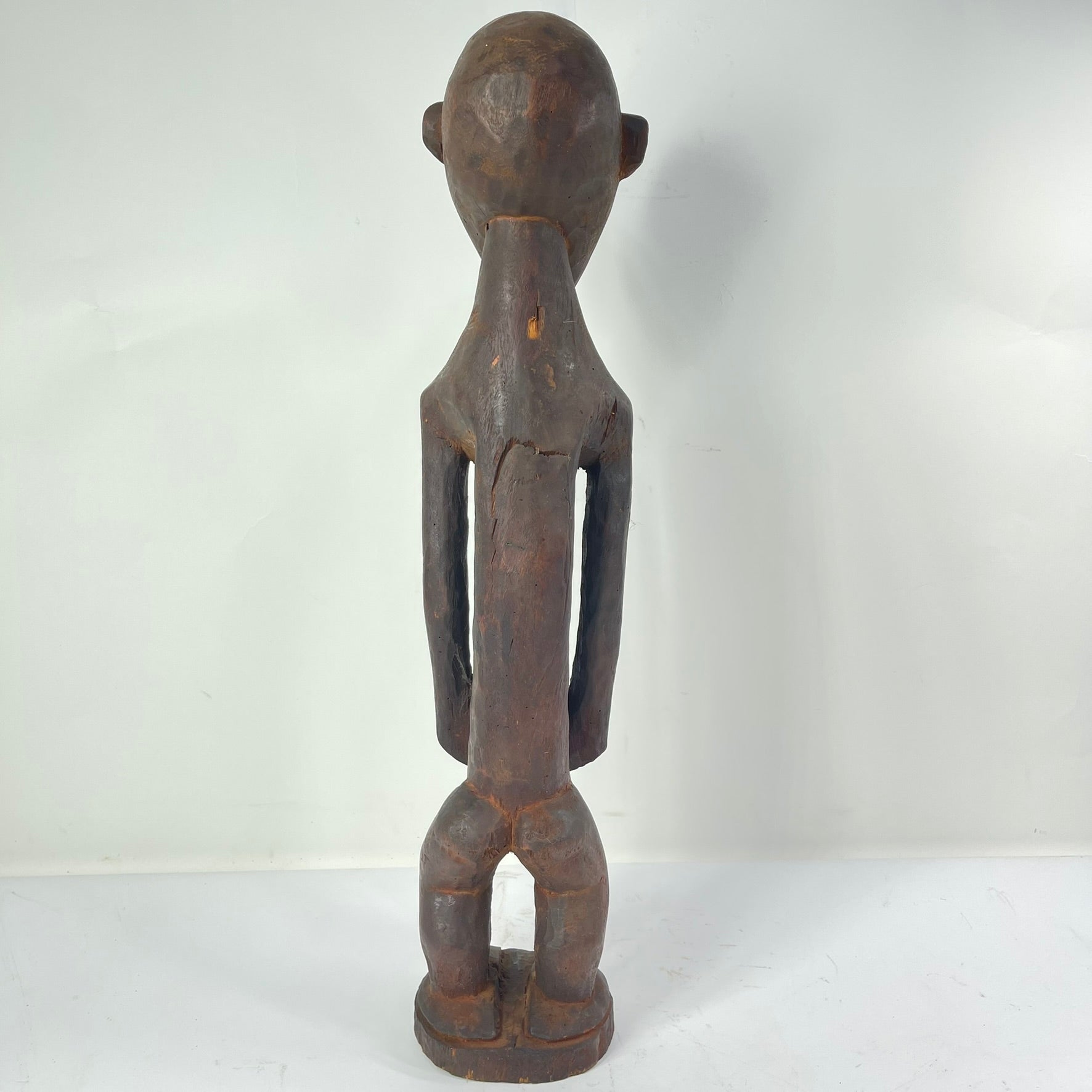 A hand-carved Lega figure originates from the Lega people in the Democratic Republic of the Congo. The figure is easily distinguished by the heart-shaped concave face with a slightly bulging forehead. Figures are often painted with white clay called "pombe" on the face, highlighting the facial features further. However, this one is not. These sculptures were once used in ceremonies of the Bwami Society and symbolized various levels within the community and represented significant community figures like judges, senior society members, and leaders.