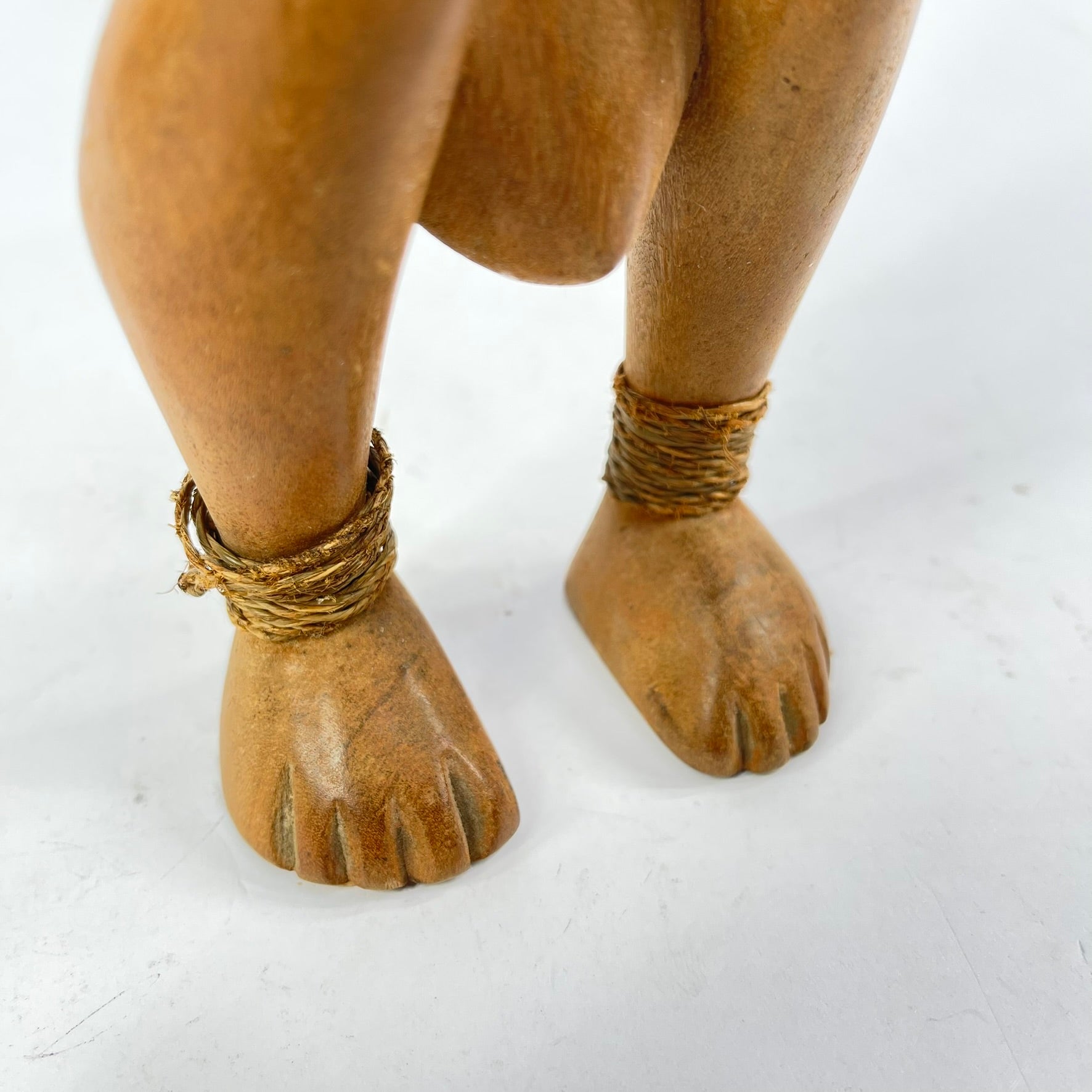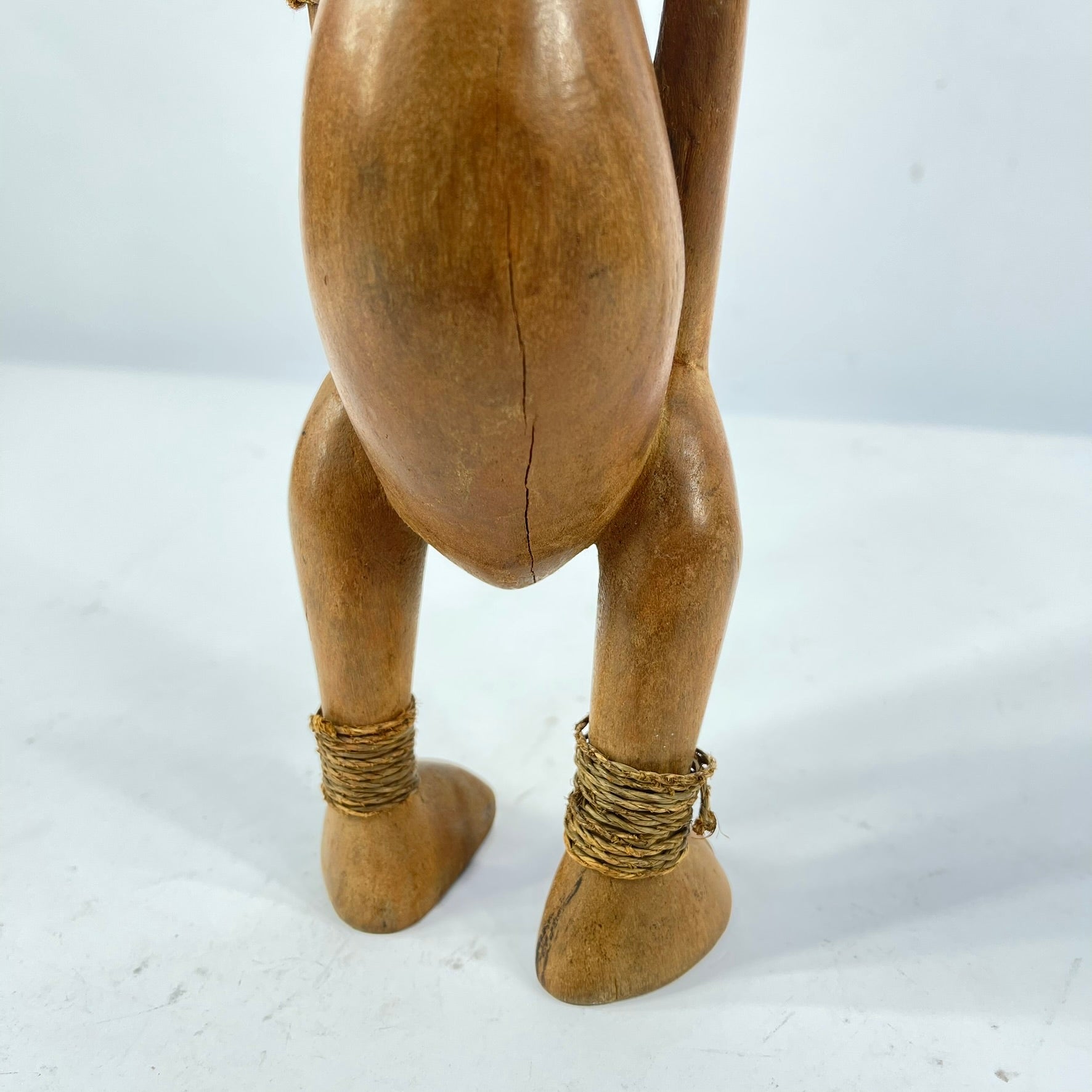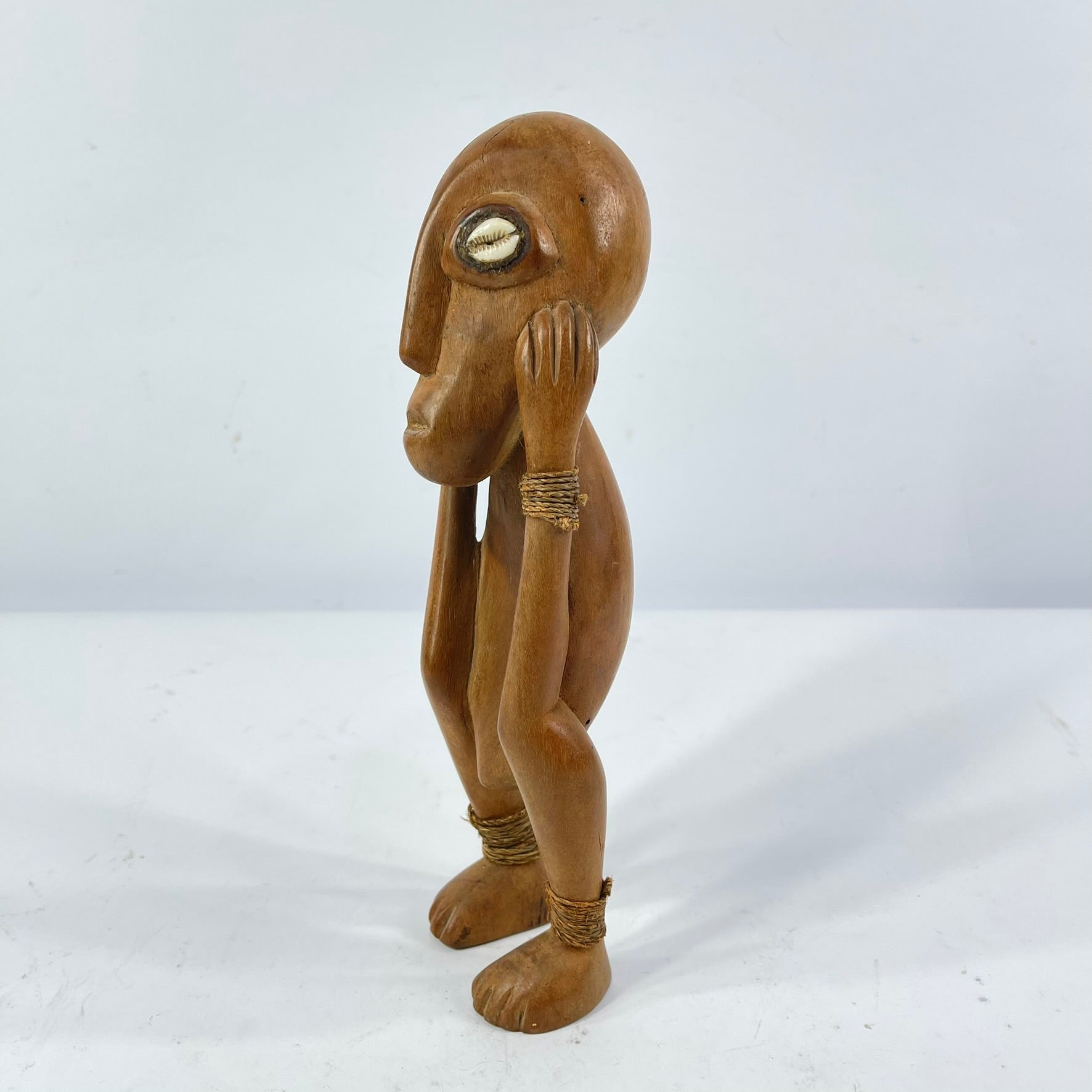 A hand-carved Lega figure originates from the Lega people in the Democratic Republic of the Congo. The figure is easily distinctive by the heart-shaped concave face with a slightly bulging forehead. Figures are often painted with white clay called "pombe" on the face, highlighting the facial features further. These sculptures were once used in ceremonies of the Bwami Society and symbolized various levels within the community and represented significant community figures like judges, senior society members, and leaders.