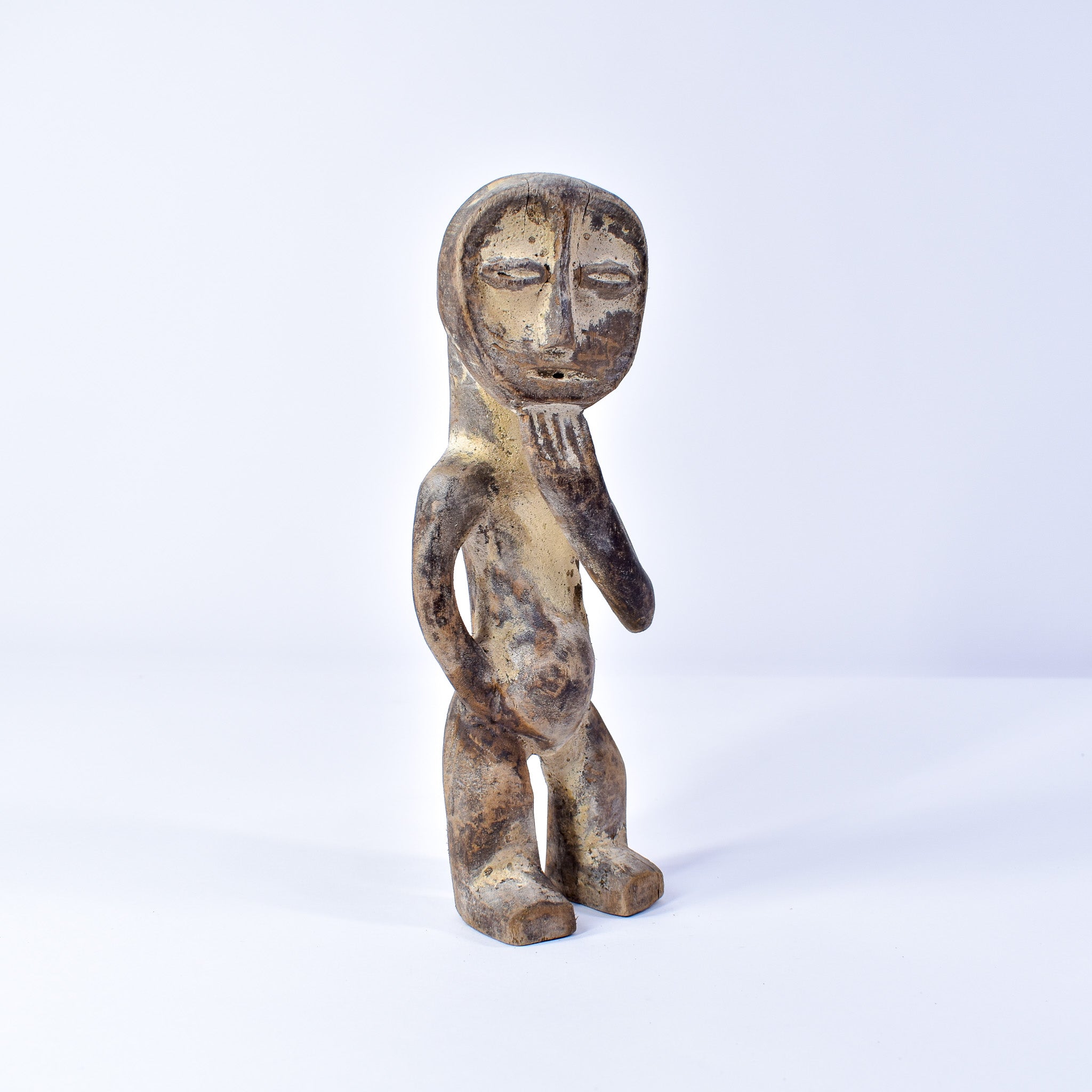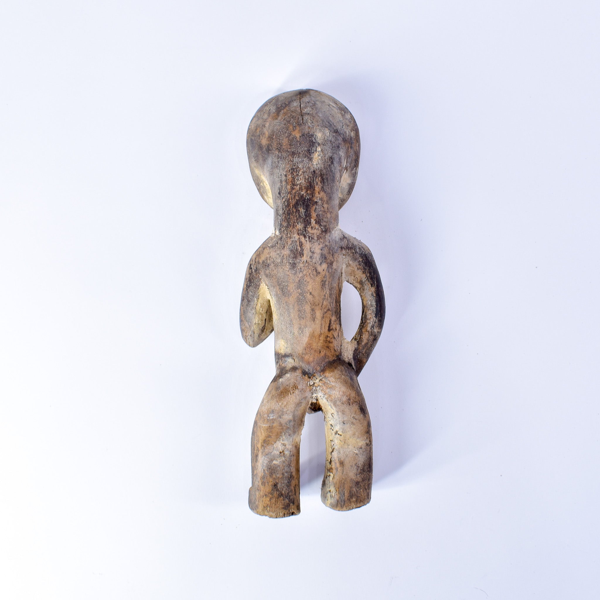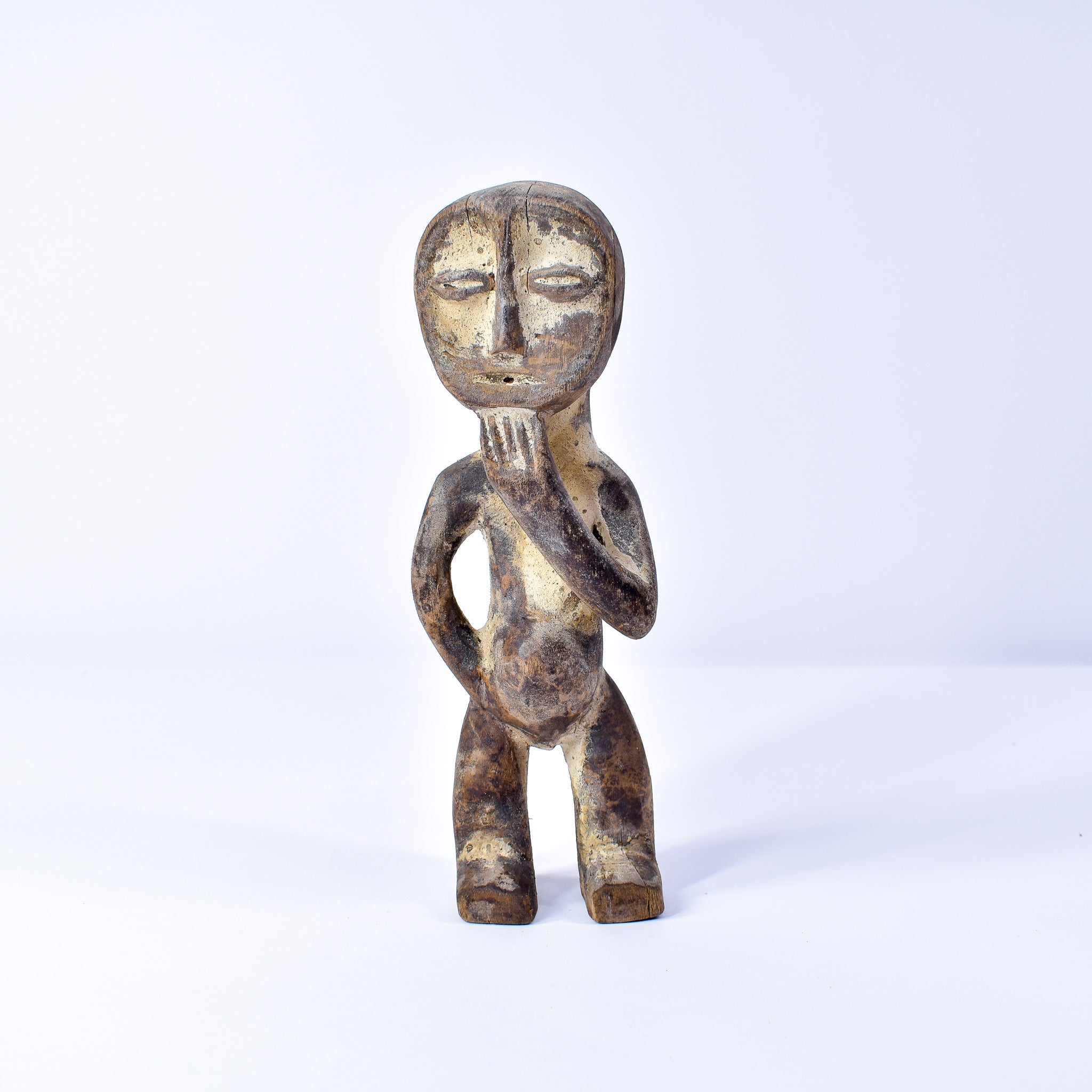 A hand-carved Lega figure originates from the Lega people in the Democratic Republic of the Congo. The figure is easily distinguished by the heart-shaped concave face with a slightly bulging forehead. Figures are often painted with white clay called "pombe" on the face, highlighting the facial features further. These sculptures were once used in ceremonies of the Bwami Society and symbolized various levels within the community and represented significant community figures like judges, senior society members, and leaders.