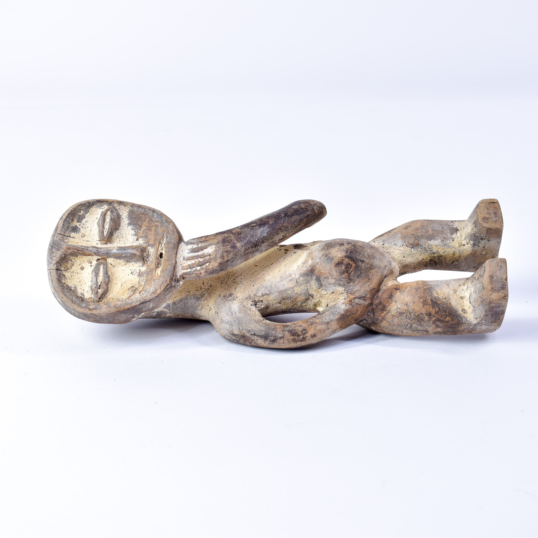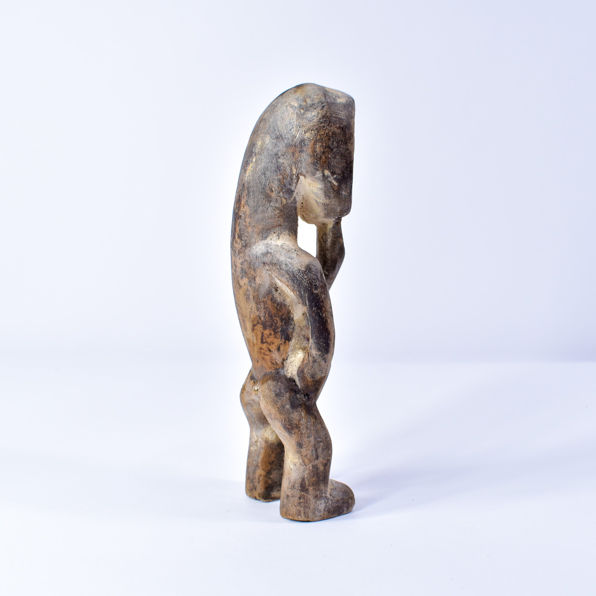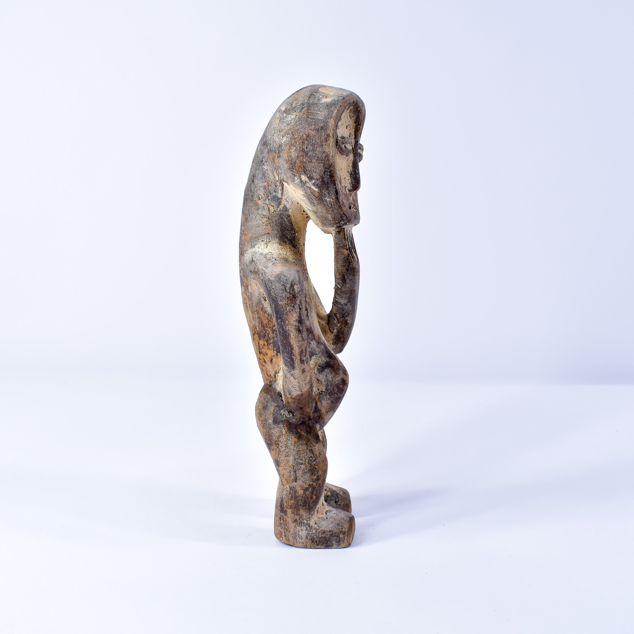 A hand-carved Lega figure originates from the Lega people in the Democratic Republic of the Congo. The figure is easily distinguished by the heart-shaped concave face with a slightly bulging forehead. Figures are often painted with white clay called "pombe" on the face, highlighting the facial features further. These sculptures were once used in ceremonies of the Bwami Society and symbolized various levels within the community and represented significant community figures like judges, senior society members, and leaders.