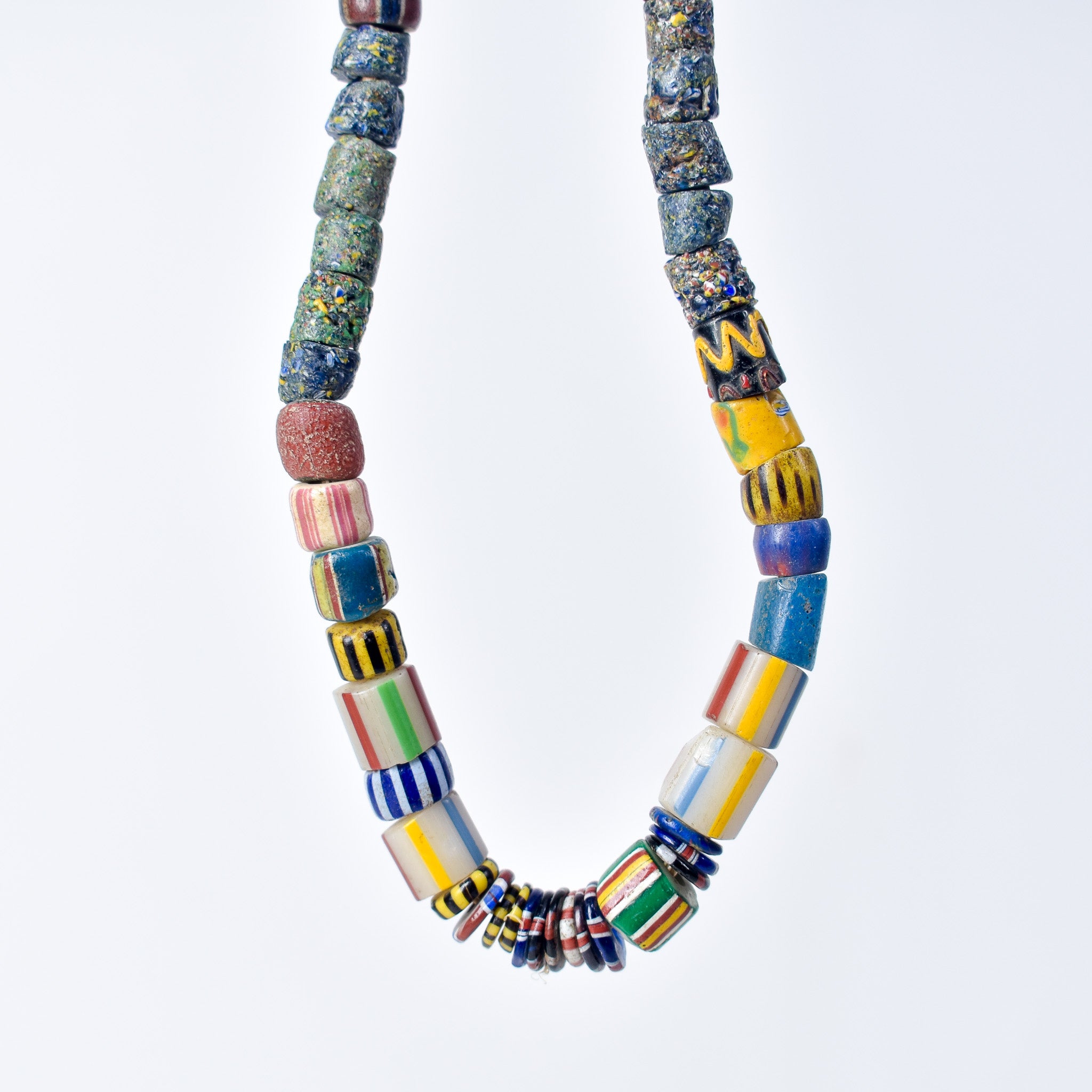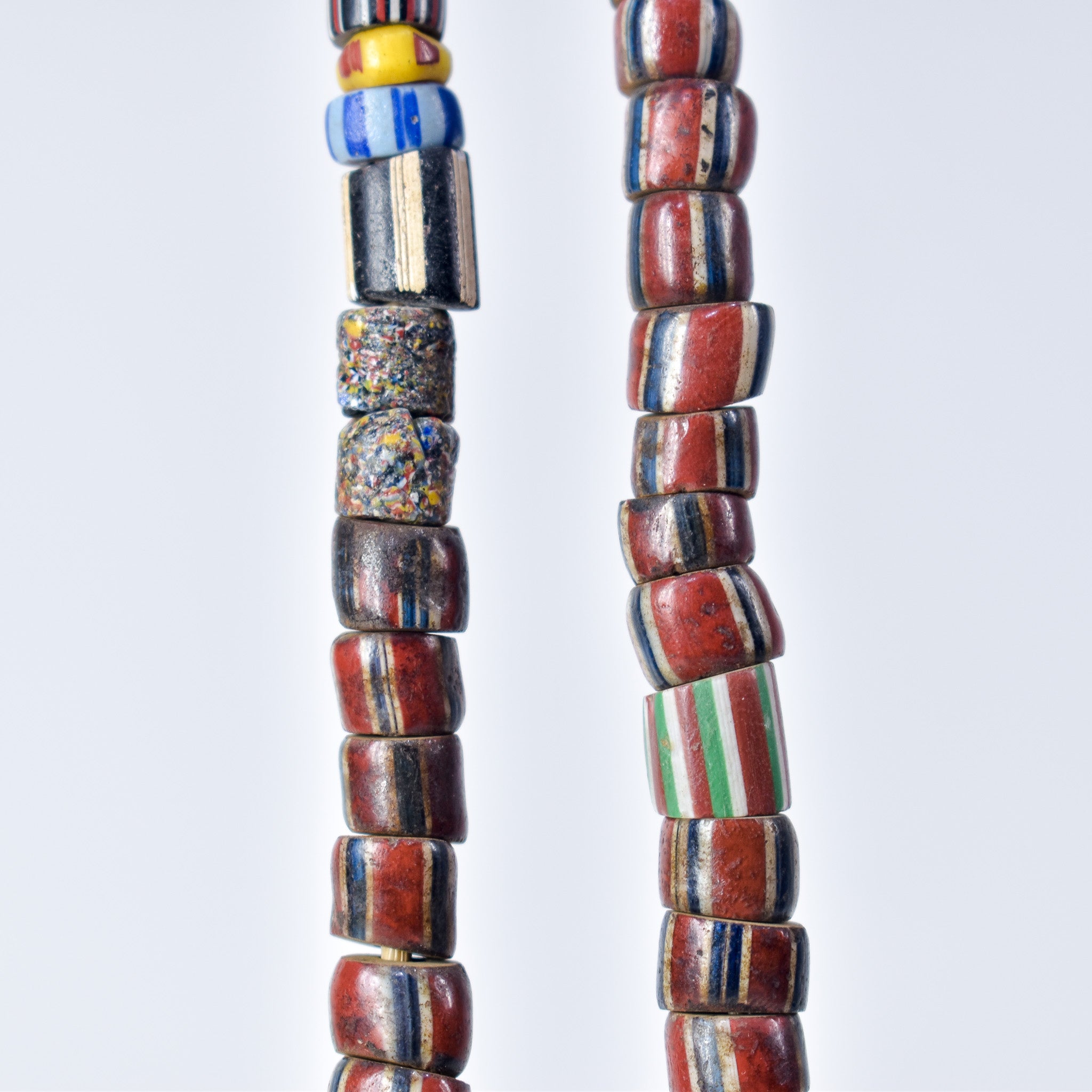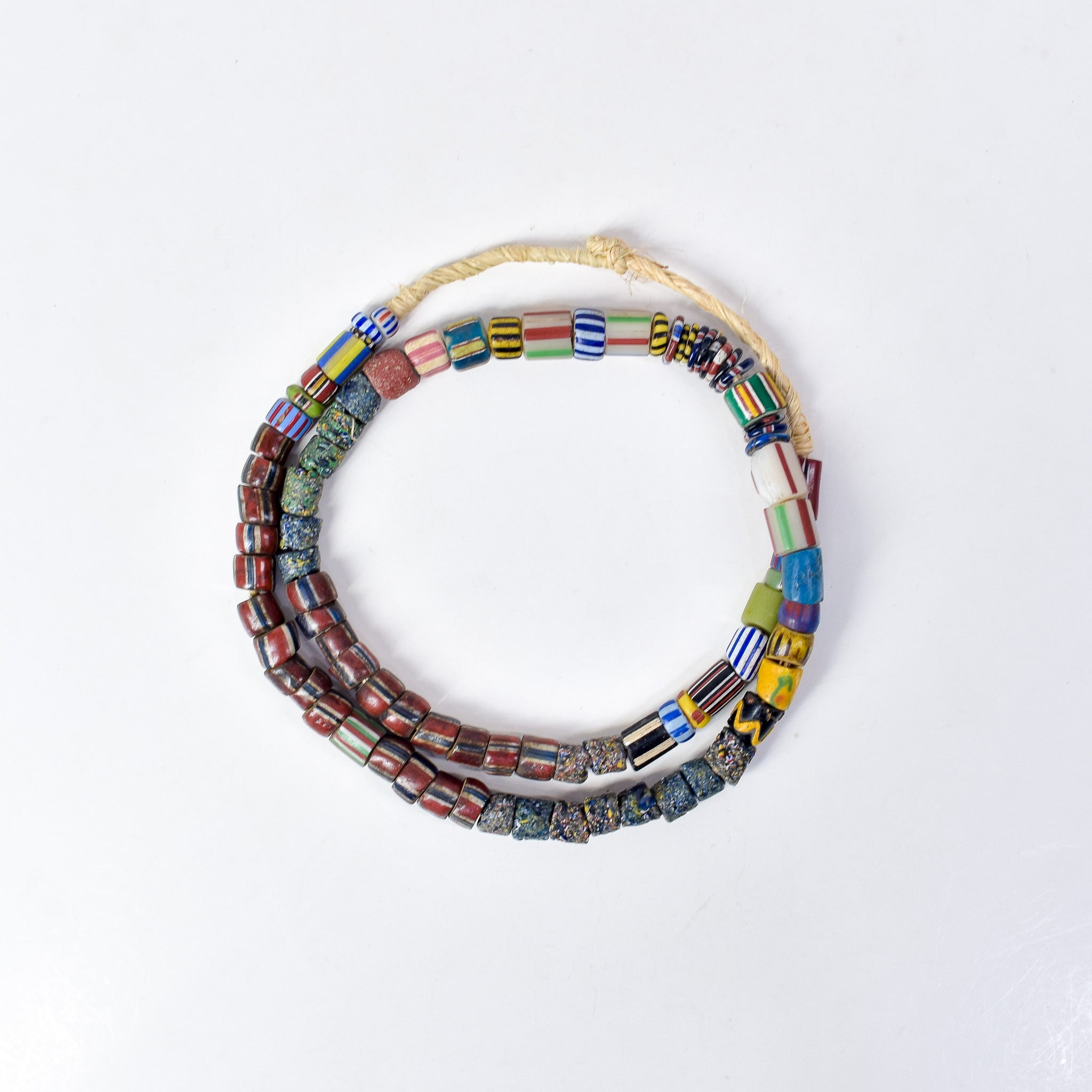 A 24-inch strand of mixed Venetian and Bohemian trade beads is a fascinating collection of diverse colors, shapes, and patterns, each bead telling a unique story of craftsmanship and trade. Crafted in Venice, Italy, these beads showcase the mastery of Venetian glass artisans, who skillfully combined vibrant hues and intricate designs to create stunning works of art. From bold stripes to delicate millefiori patterns, each bead reflects the cultural exchanges and global trade networks that shaped the world's history. These beads were not only prized for their beauty but also served as valuable commodities, exchanged across continents and cultures. A strand of mixed Venetian trade beads is not just a piece of jewelry; it's a tangible link to the rich tapestry of human interaction and creativity that spans centuries.