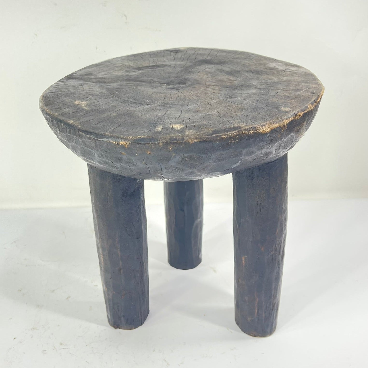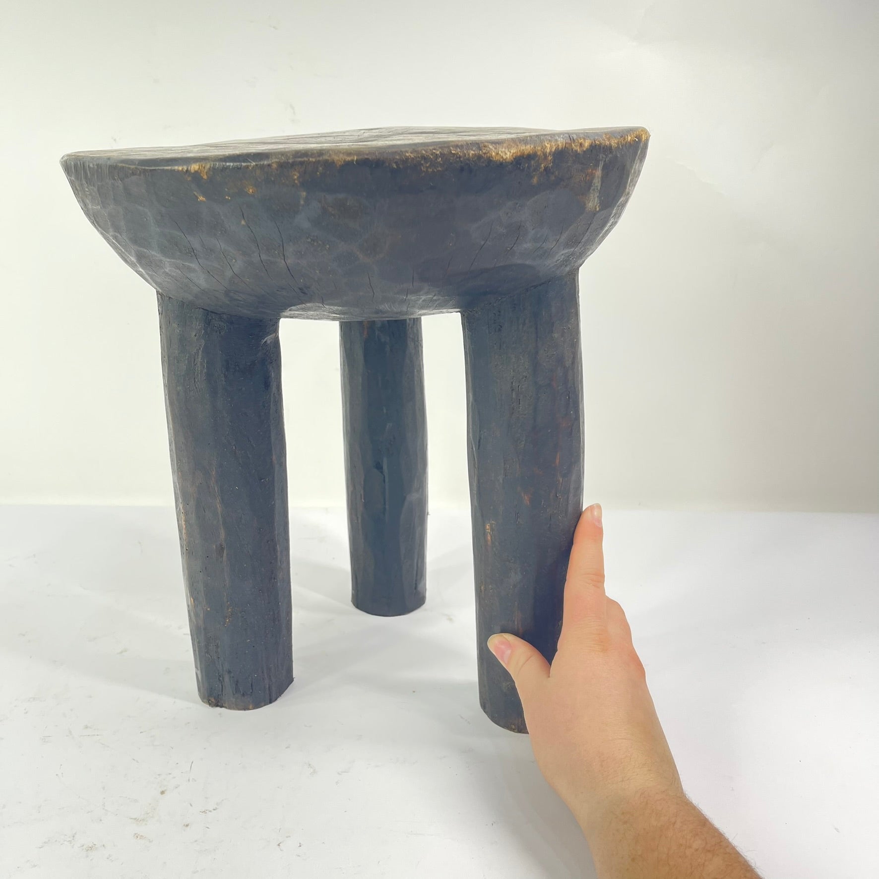Used exclusively by Lobi men, stools are three-legged, and those for women are four-legged. Lobi stools are carved from a heavy, dense wood, and their simple, abstract forms carry great visual power and worn patina showing much use and age. The three-legged design of the stool allowed Lobi men to carry it on their shoulders when not being sat upon. Such stools were also used to beat upon the ground when an elder approached as a sign of respect for the older person. This stool is in excellent condition and would be a good addition to any collection of African Art.
