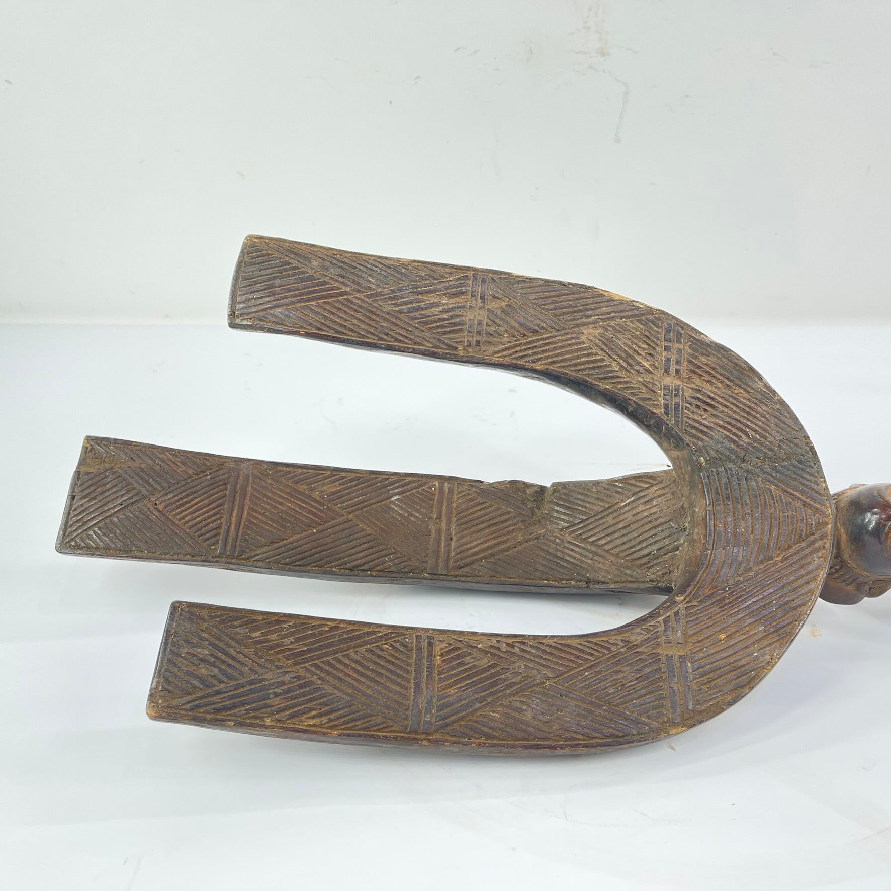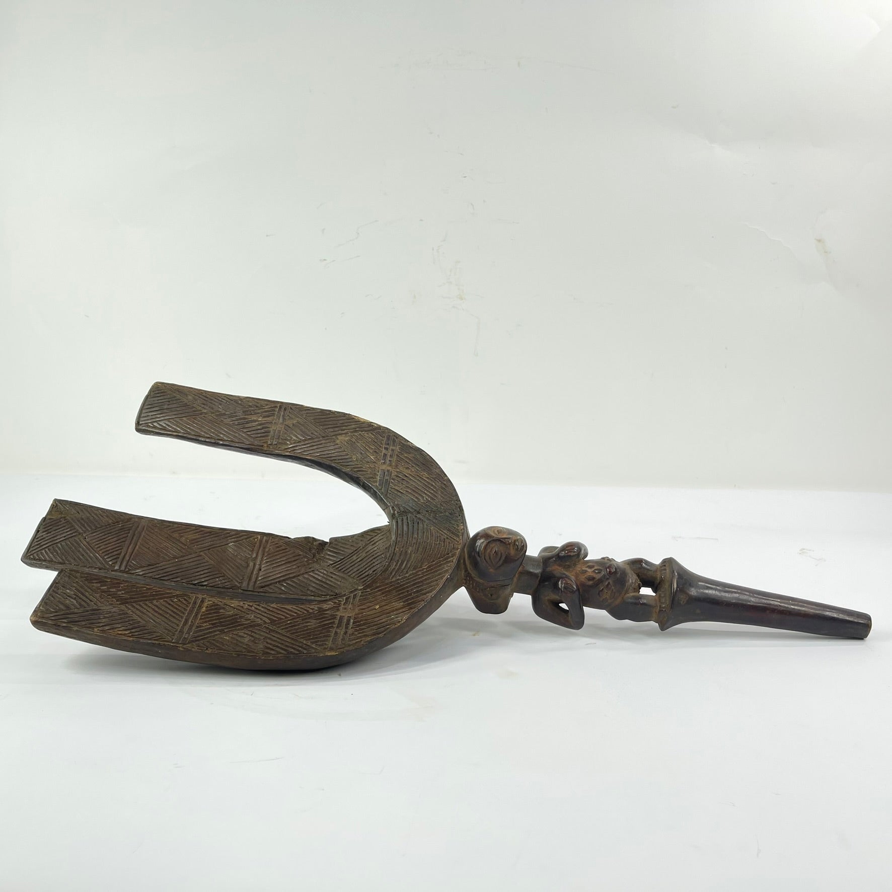 This carved wooden bow stand is crafted in the distinctive Shankadi style of the Luba people, particularly associated with the Luanda region, known for producing some of the most refined sculptural traditions in Central Africa. The stand features an elegant arched form supported by two long, downward-curving legs, all decorated with finely incised crosshatched motifs typical of Luba surface design.