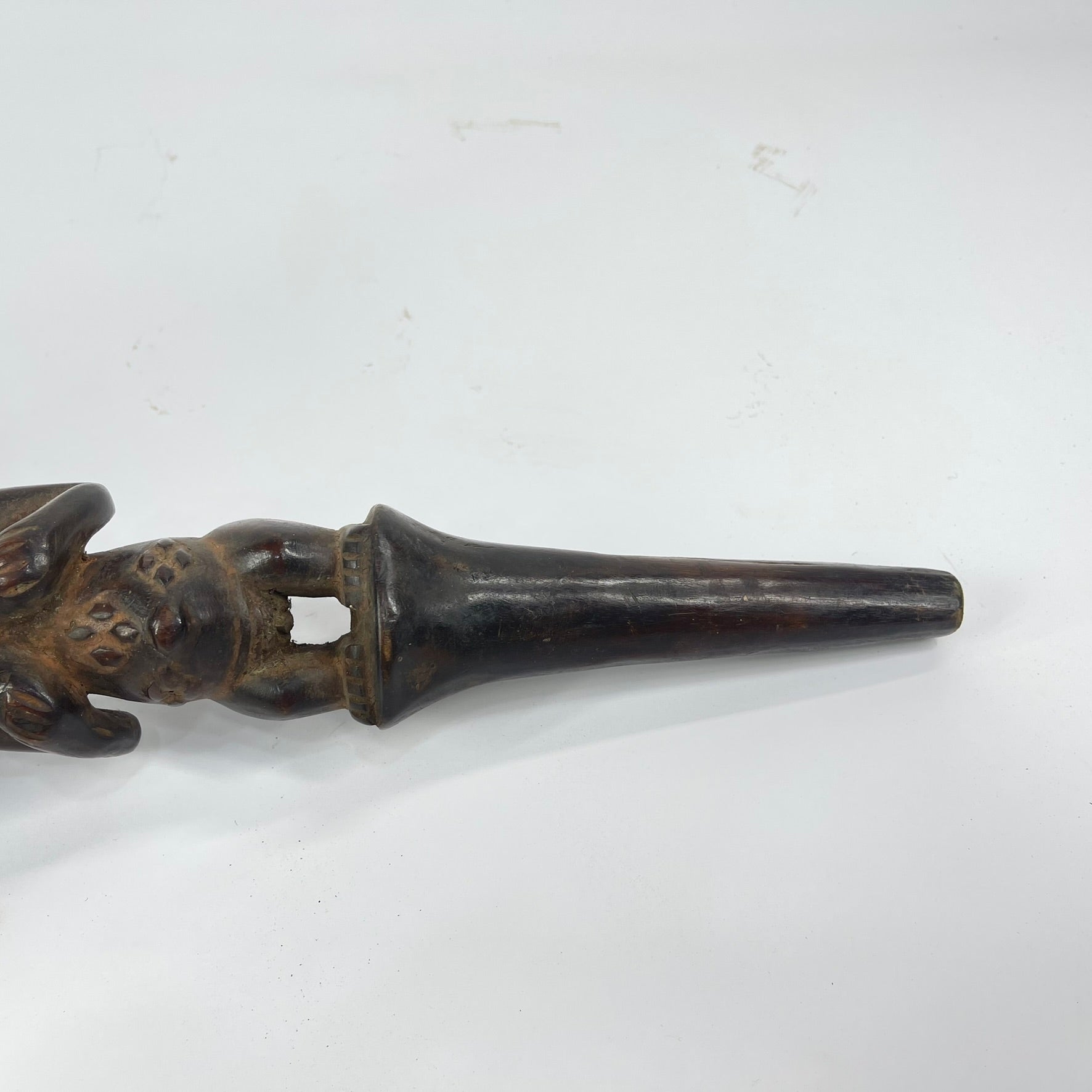 At the top sits a carefully carved human figure with a serene, composed expression and a traditional Luba coiffure. Figures like this often represent ancestral intermediaries or embodiments of female spiritual authority, central concepts within Luba culture, where lineage, memory, and sacred knowledge were symbolically tied to female forms.