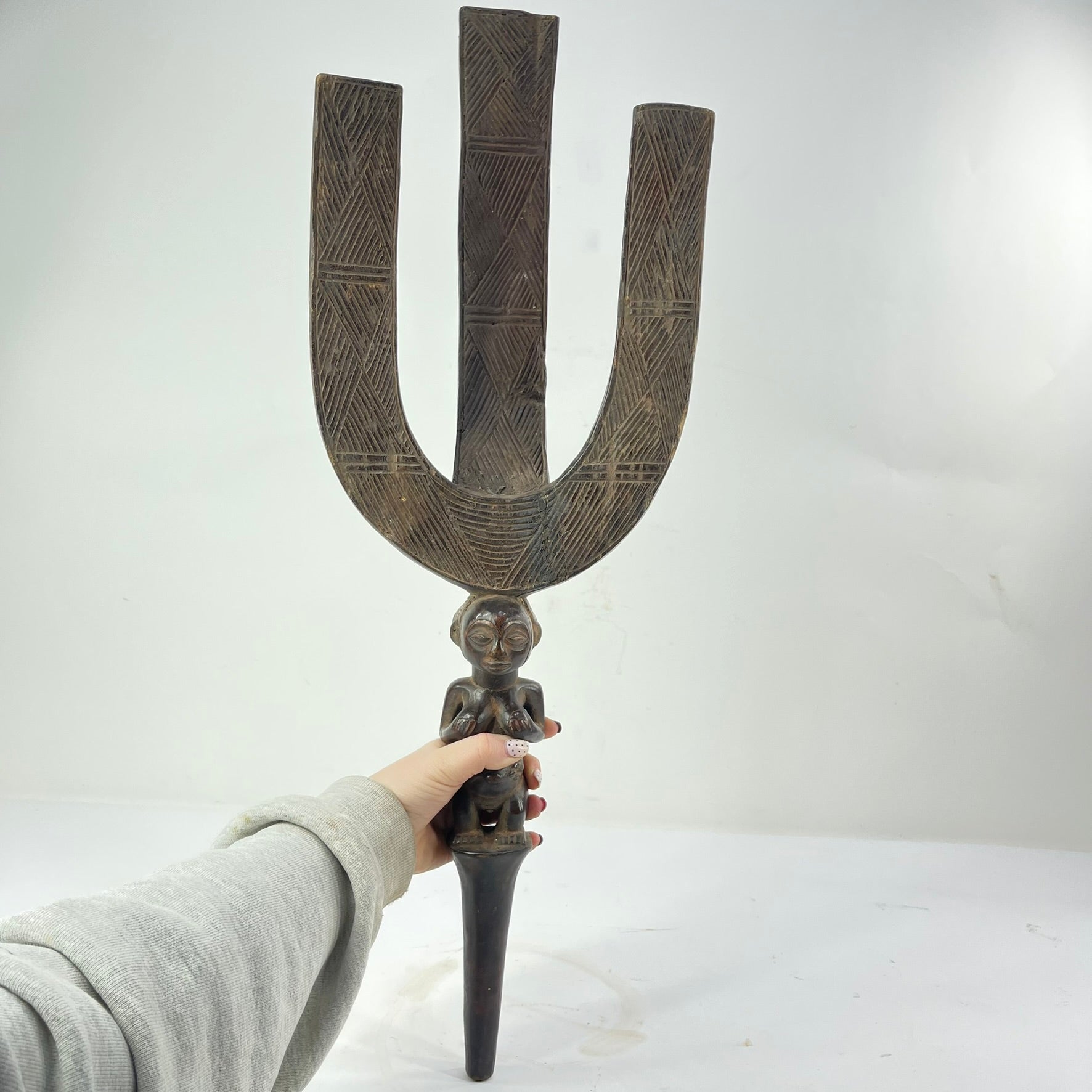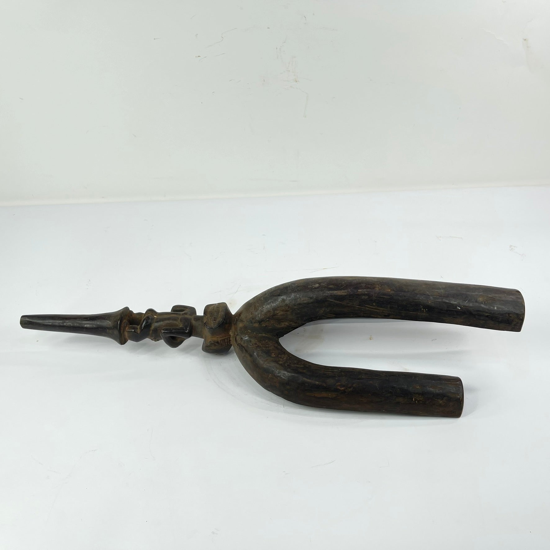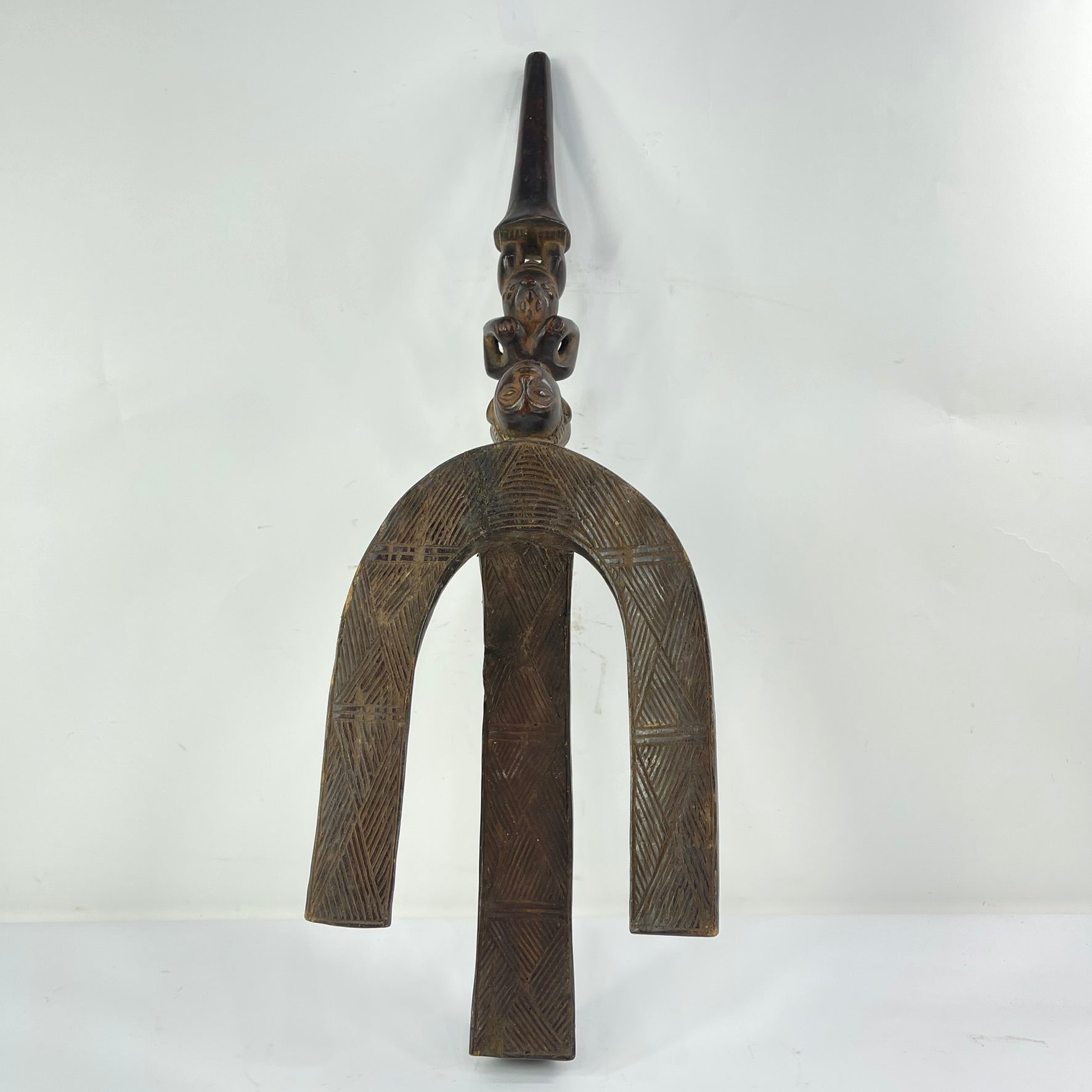 Bow stands such as this were prestige objects used by hunters, chiefs, and titleholders to display bows during ceremonies or gatherings, reinforcing both rank and ancestral protection. The refined sculptural balance, combining geometric rhythm with expressive figurative carving, reflects the Shankadi hallmark of graceful proportion and spiritual presence.