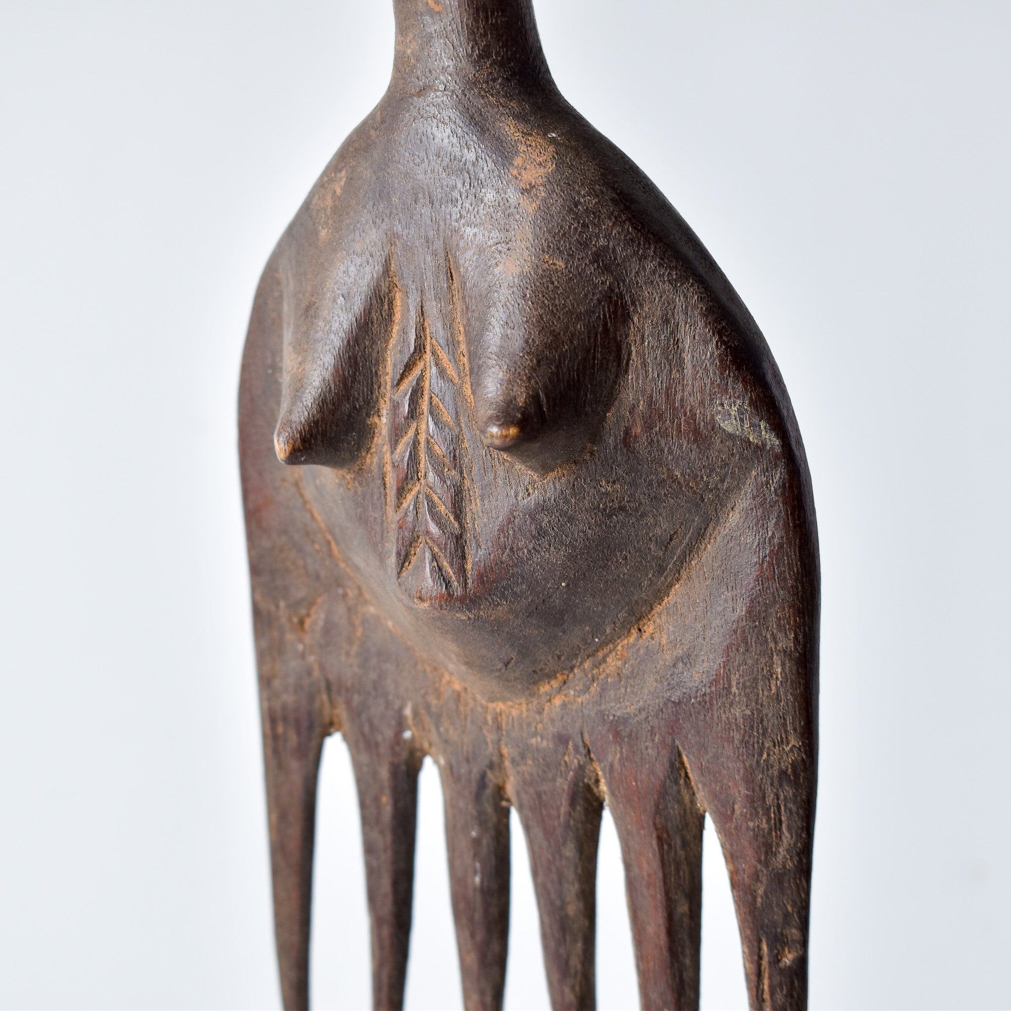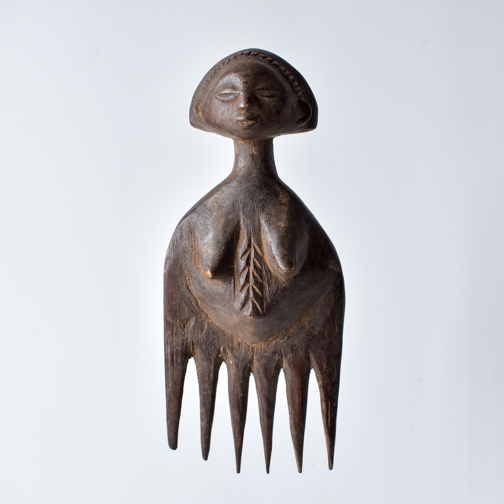 The Luba Wood Comb from Congo is a testament to the exquisite craftsmanship and cultural heritage of the Luba people. Carved from locally sourced wood with meticulous attention to detail, this comb showcases intricate patterns and designs that reflect the aesthetic sensibilities of Luba tradition. Beyond its practical use, the comb holds symbolic significance within Luba culture, often associated with beauty rituals and grooming practices. Each comb is a unique piece of art, inviting admiration for its craftsmanship and serving as a tangible link to the rich cultural tapestry of Congo's indigenous communities.