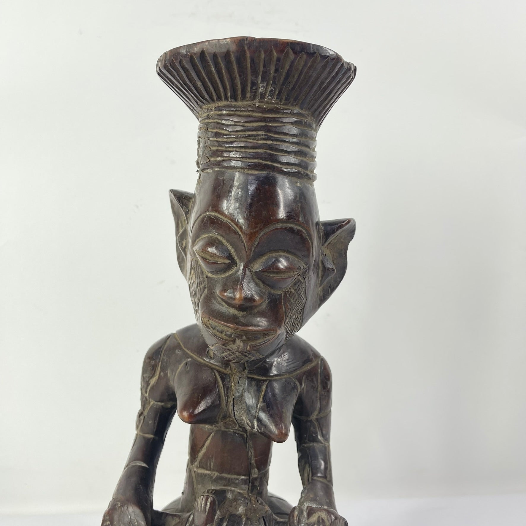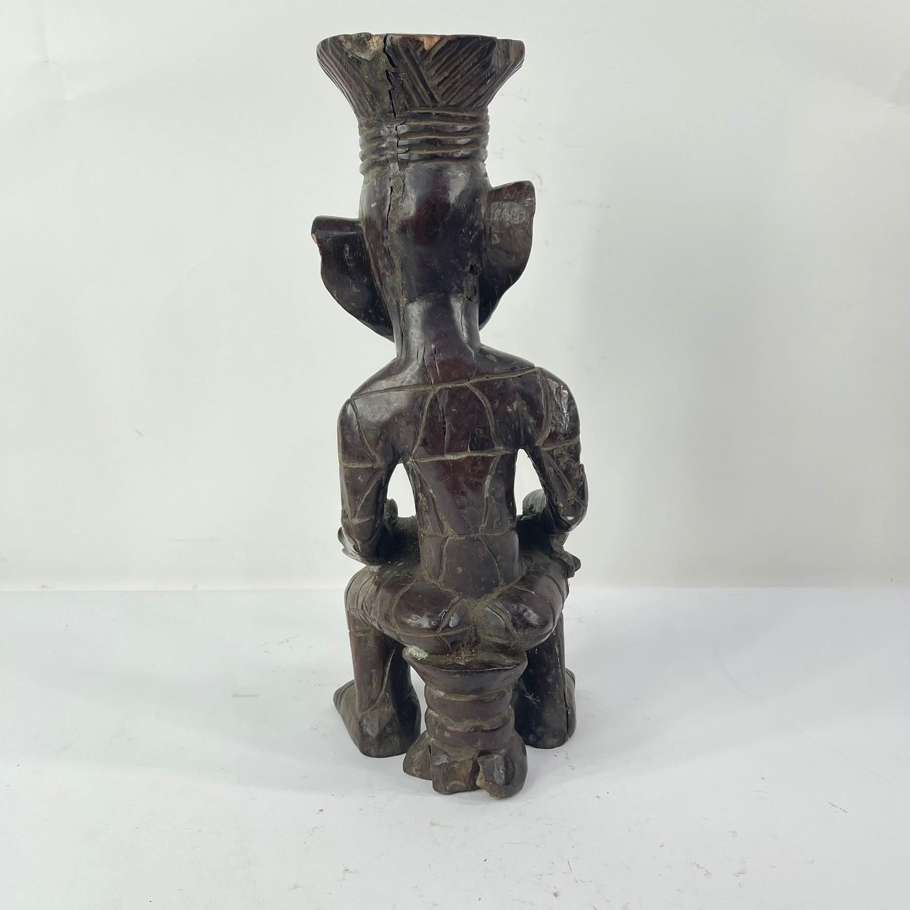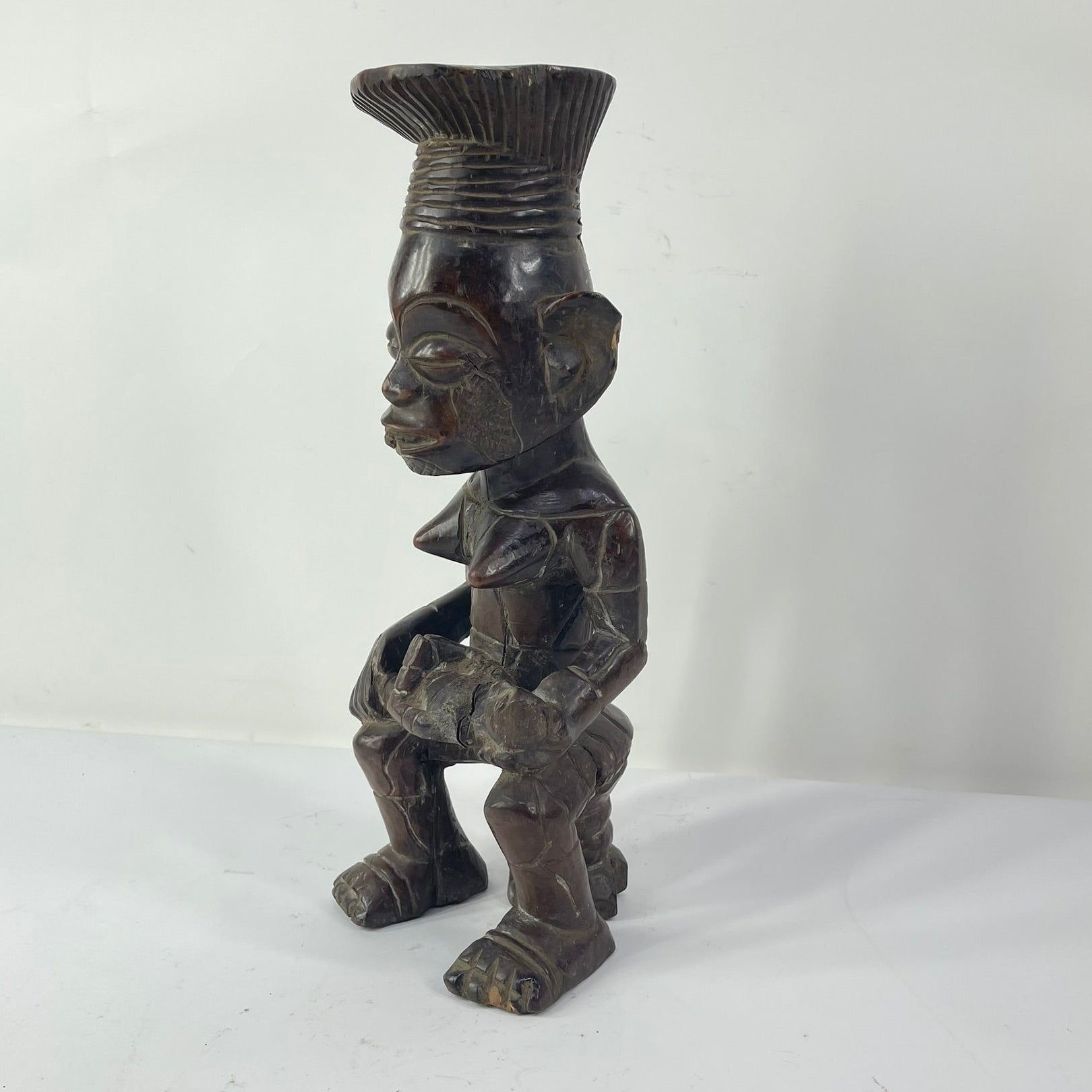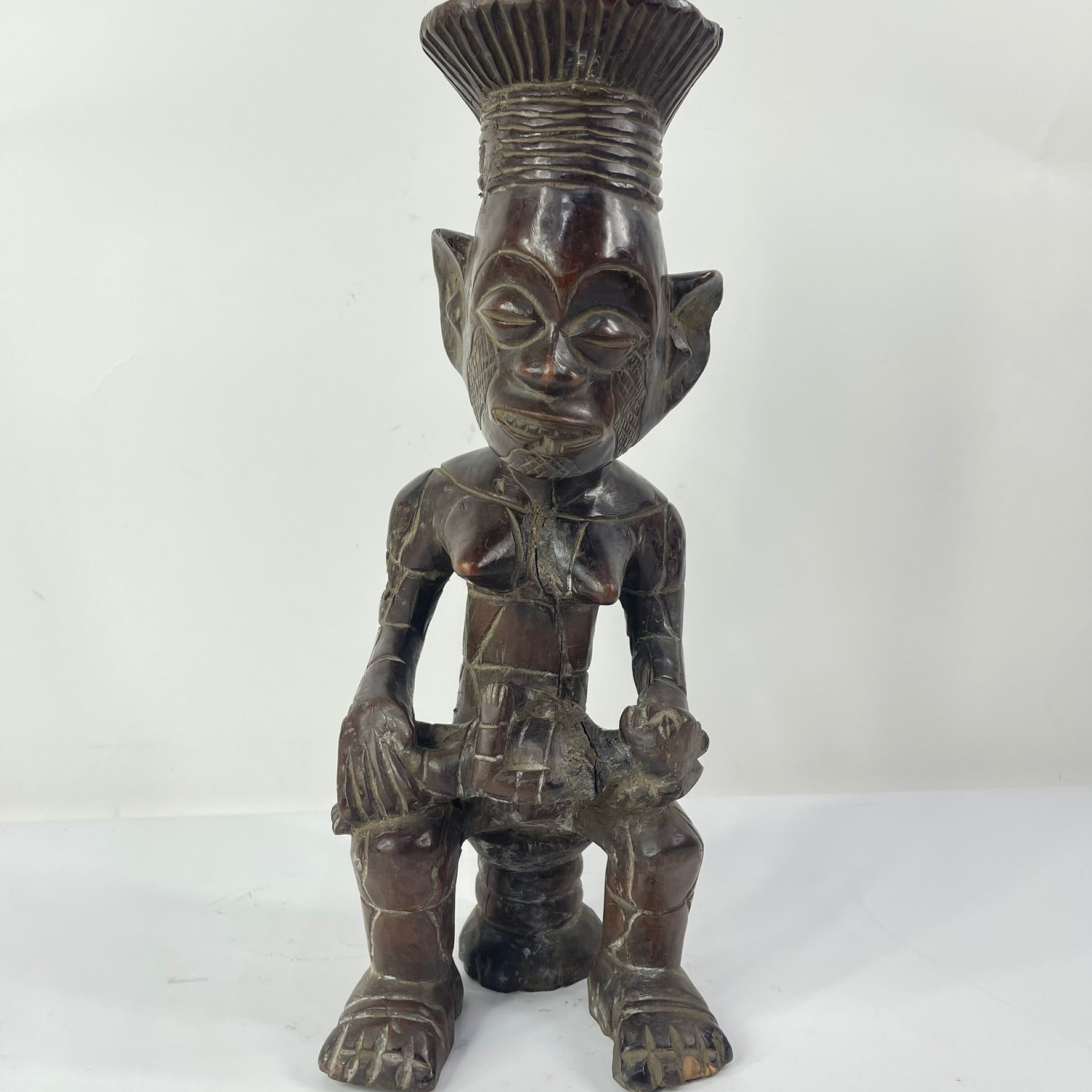 Chipped front of left foot and on the back of the stool figure is sitting on.