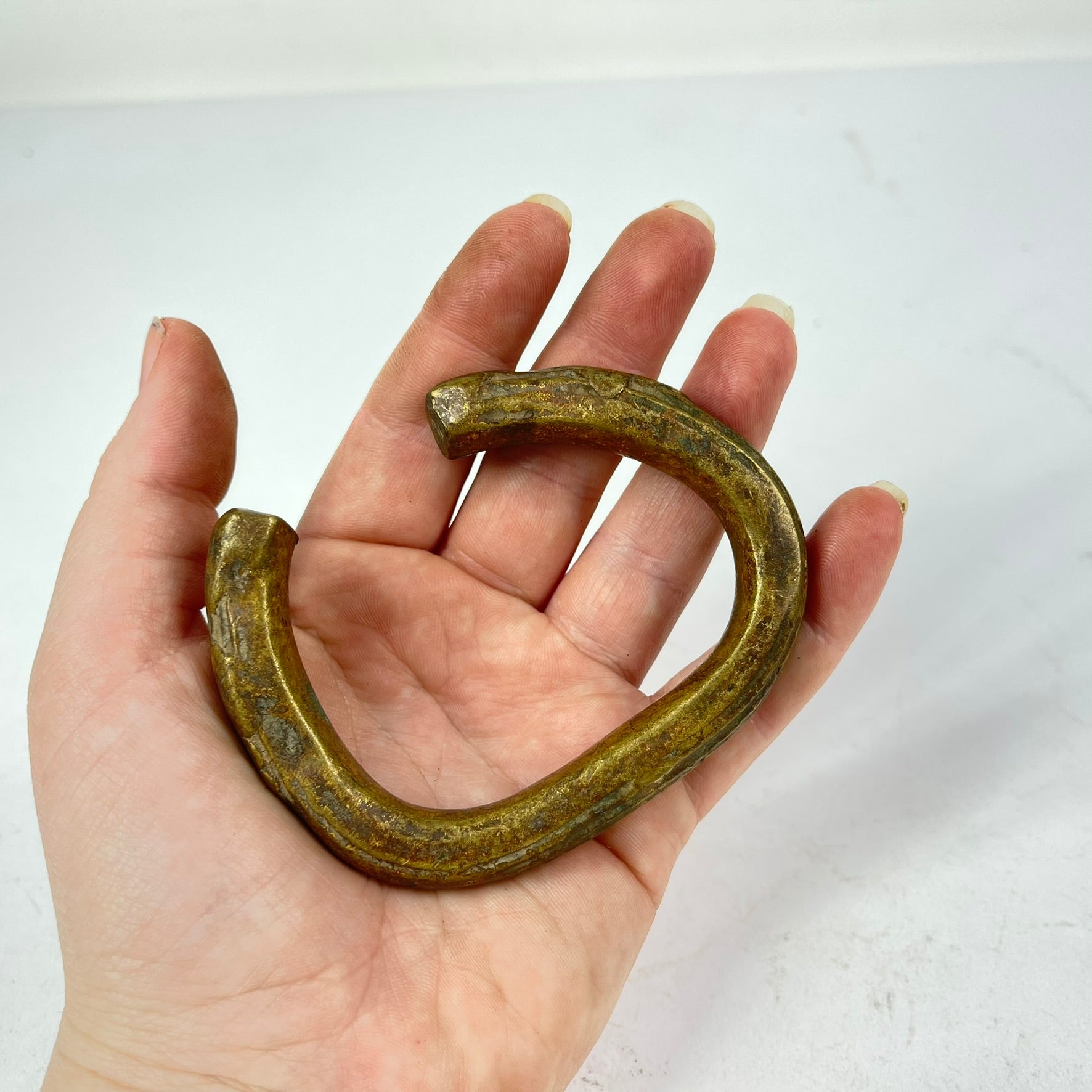 This solid metal 'Manilla' currency bracelet carries centuries of history and tradition. Crafted in Nigeria most likely from solid bronze. This piece features an intricately engraved and ribbed cuff. The size and weight make this a truly unique and valuable piece of history.