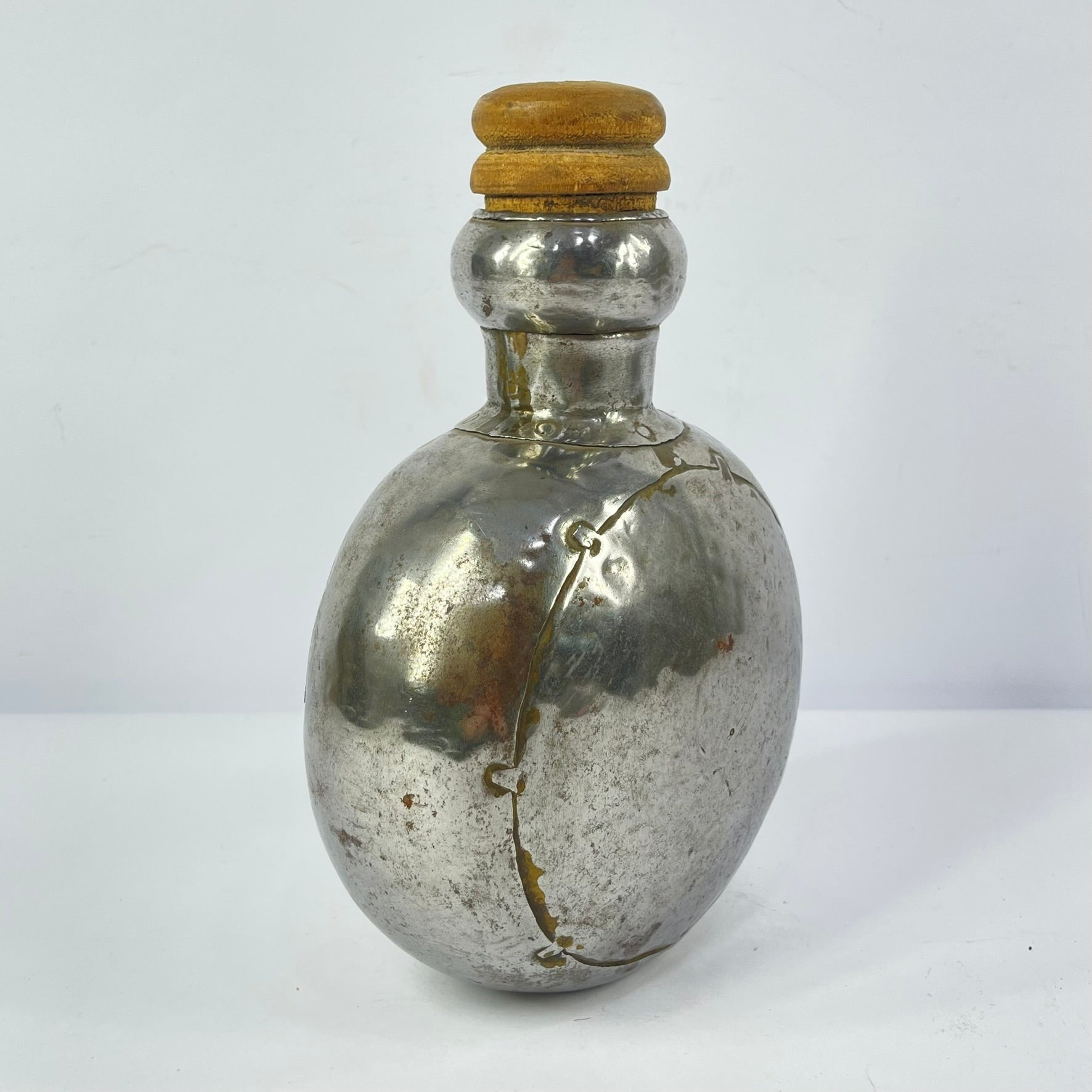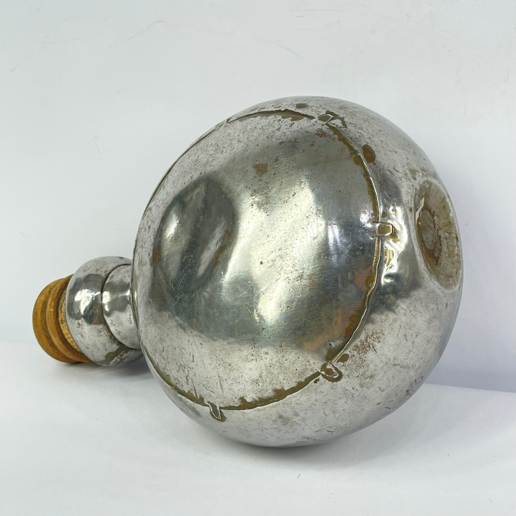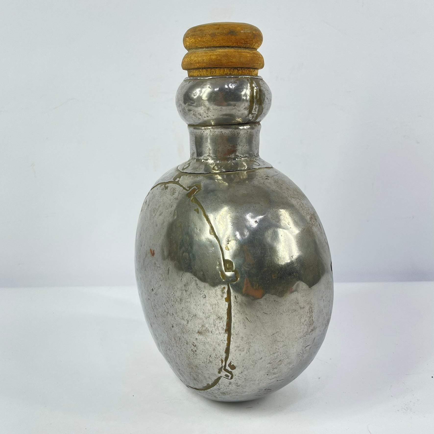 Vintage metal bottle from India with a rounded body and wooden stopper. Made from polished metal with visible wear and repair marks. This piece is part of the Matter Collection. Read more about the collection below.