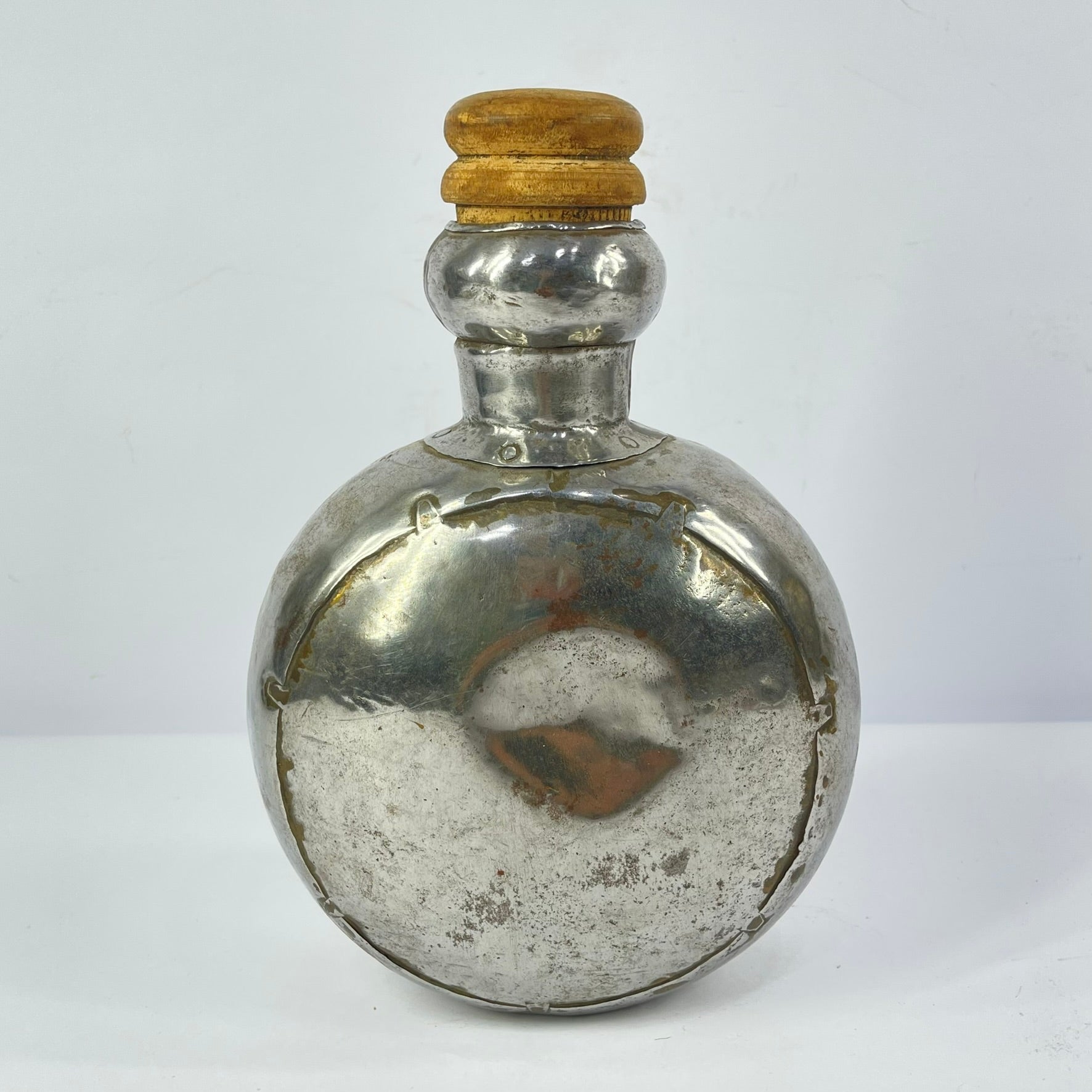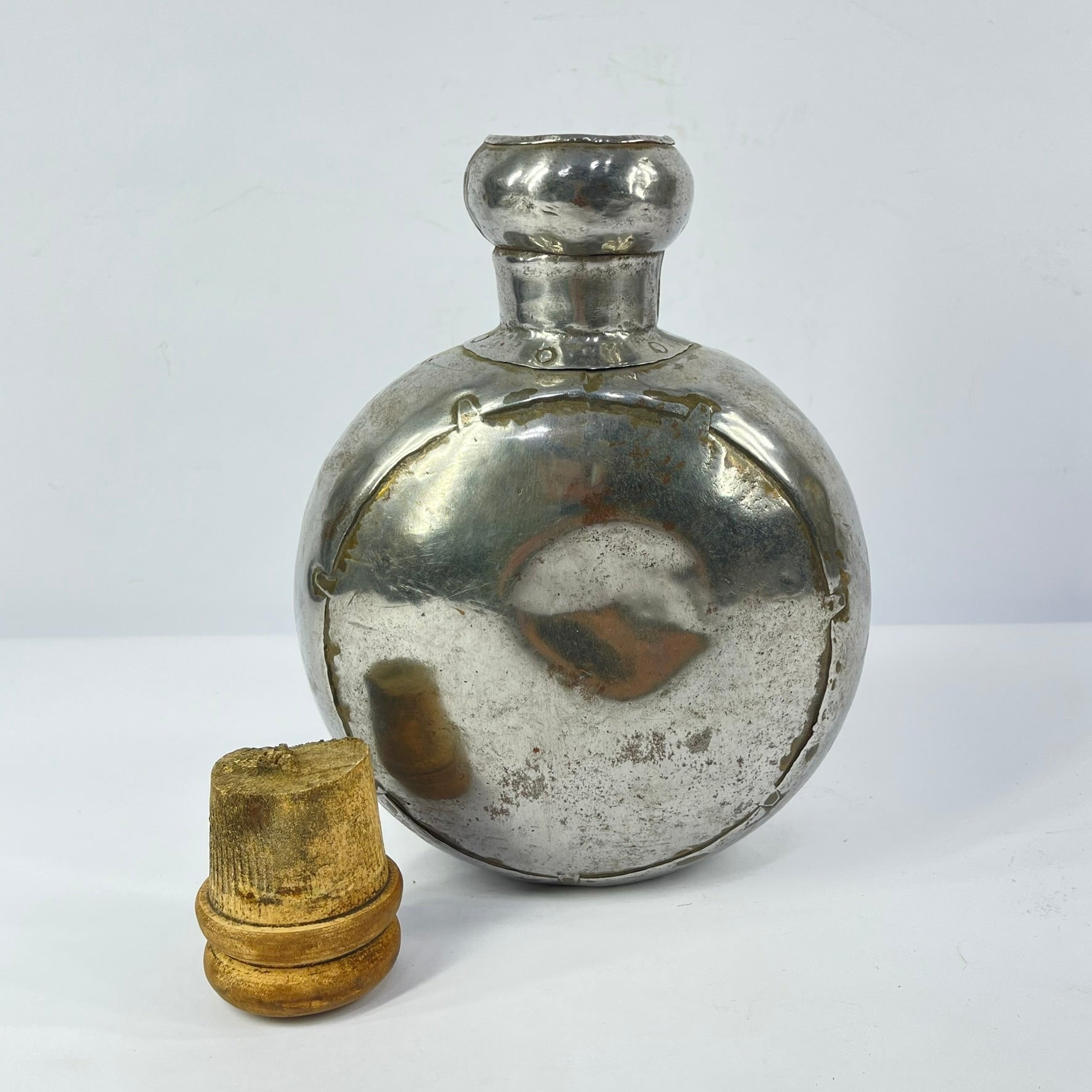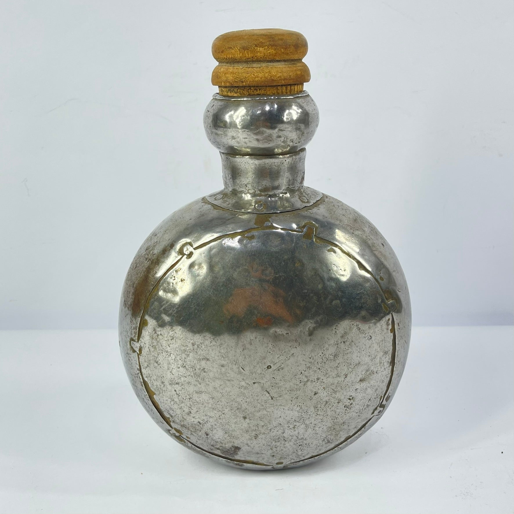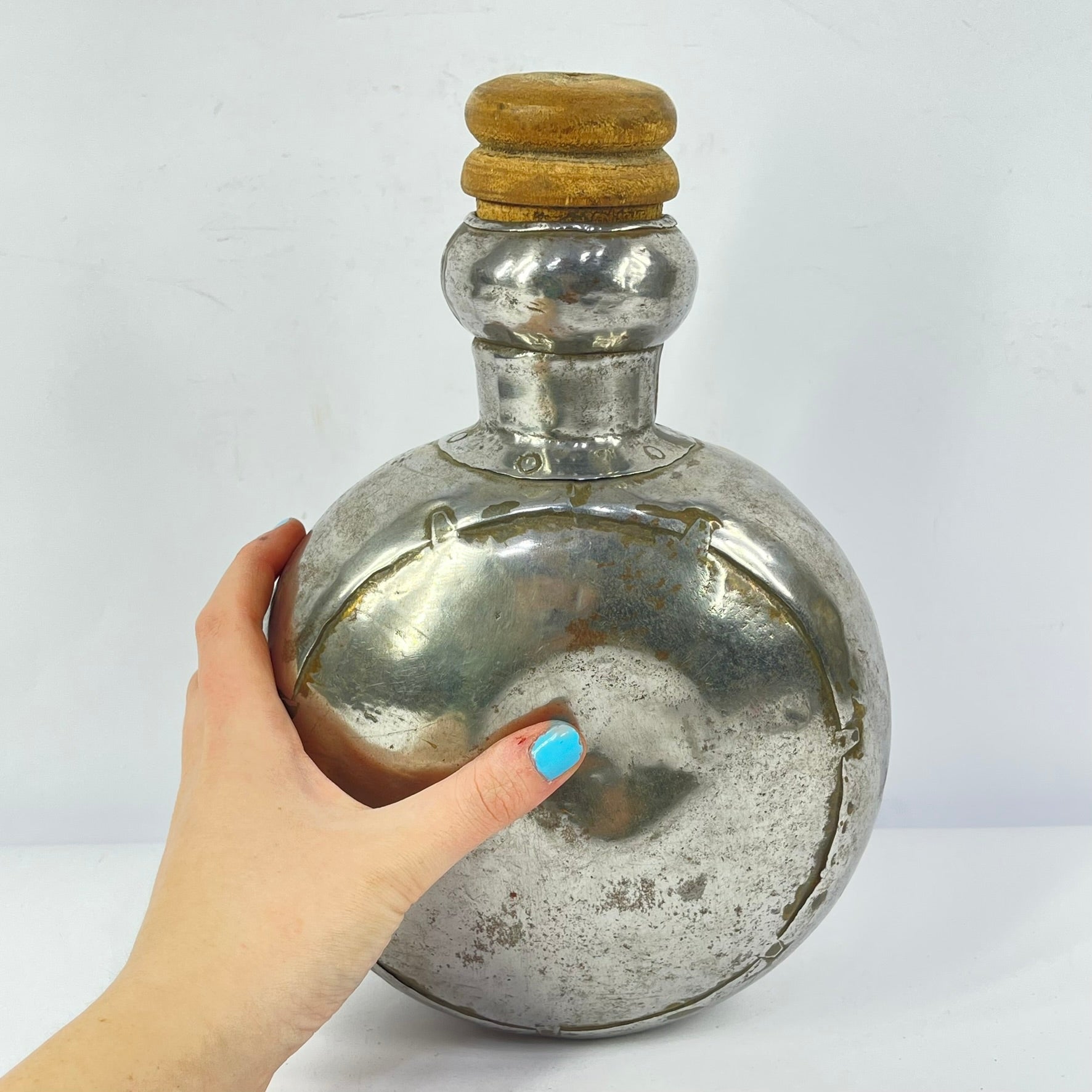 Vintage metal bottle from India with a rounded body and wooden stopper. Made from polished metal with visible wear and repair marks. This piece is part of the Matter Collection. Read more about the collection below.