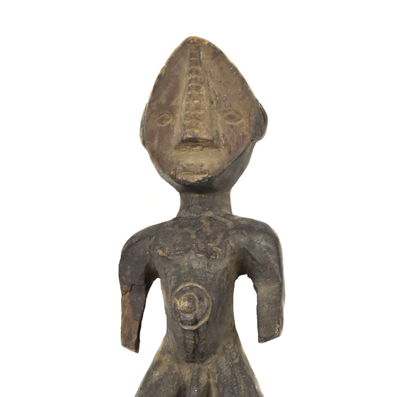 The Metoko people live on the left bank of the Zaire River in an area that is densely wooded. They are heavily influenced by their larger populated neighbors the Lega and the Lengola. Figures among the Metoko are defined by their highly abstracted forms that are further defined by a series of dotted forms or incised lines on the upper parts of their bodies. Though not fully documented or illustrated figures like this finely carved example are used by a secret society known as Bukota to which both men and women belong. Though not specifically assigned a particular purpose Metoko figures are used for initiations, funerals, peace-making, and during circumcision of young initiates. Figures are generally in the possession of the most senior members of the Bukota society and will be identified with names associated with positive behavior.