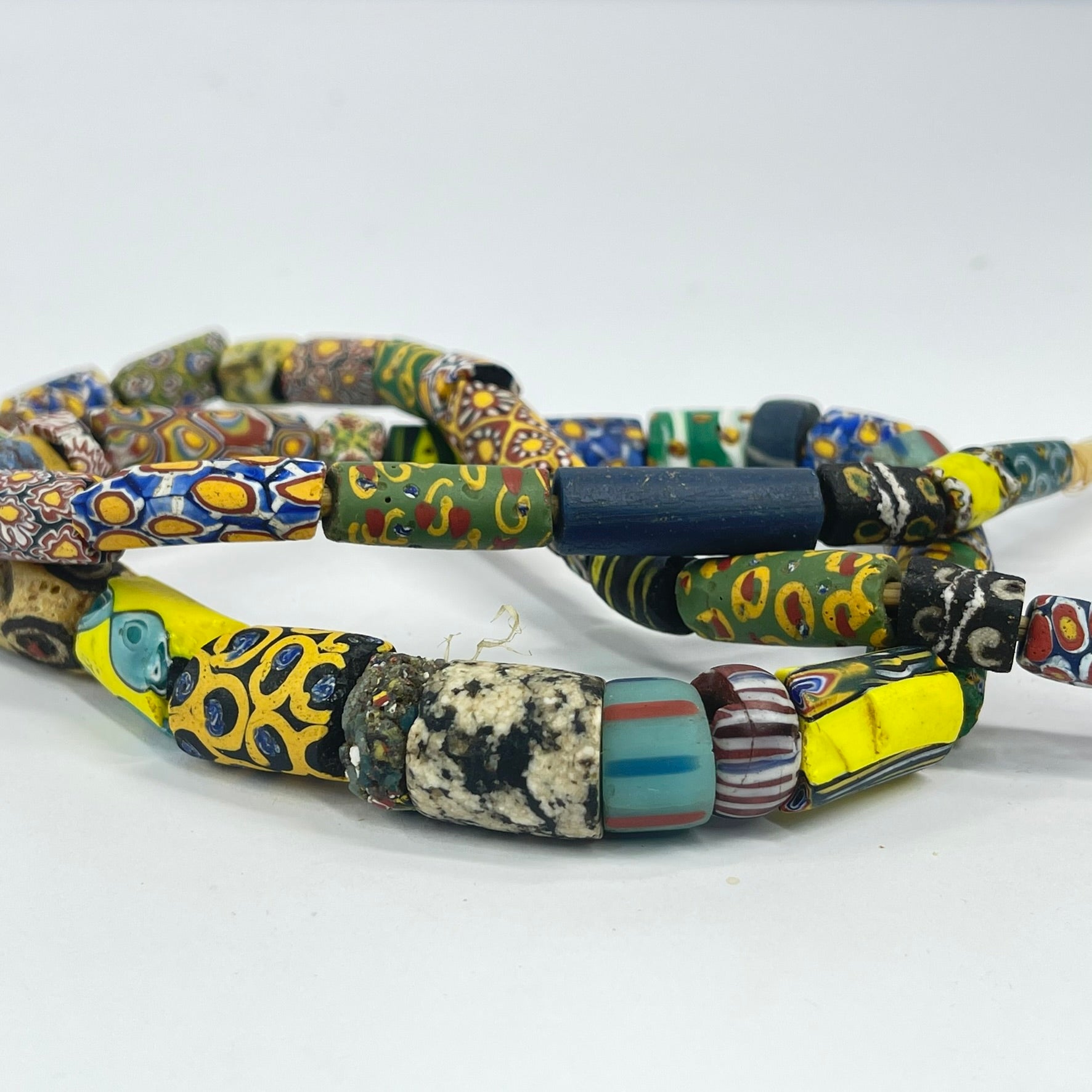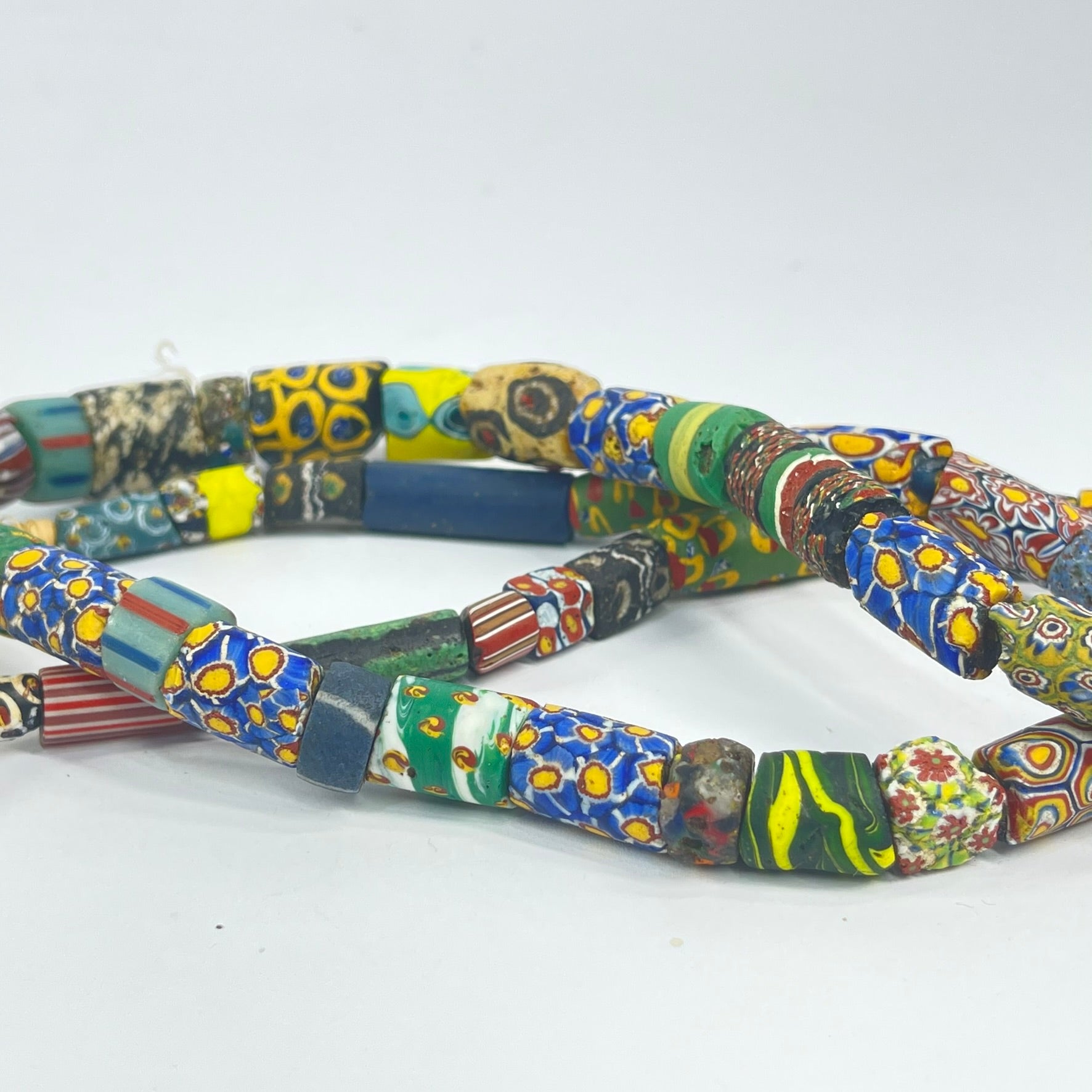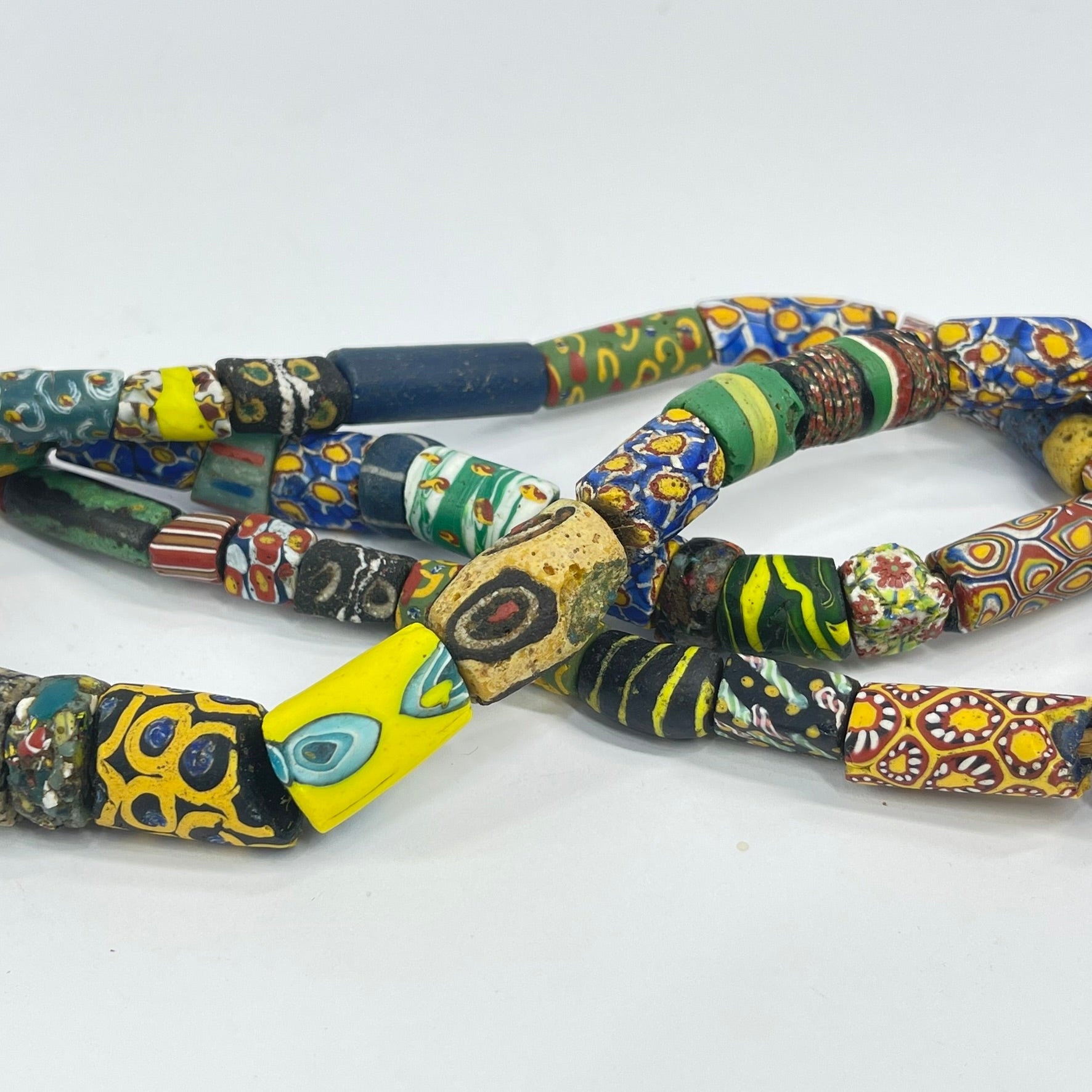 A strand of mixed Venetian trade beads is a fascinating collection of diverse colors, shapes, and patterns, each bead telling a unique story of craftsmanship and trade. Includes Millefiori, striped and more.