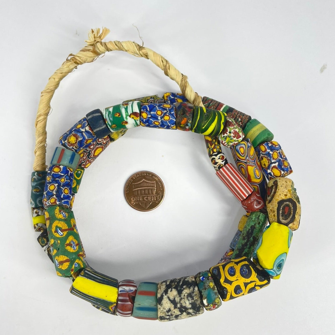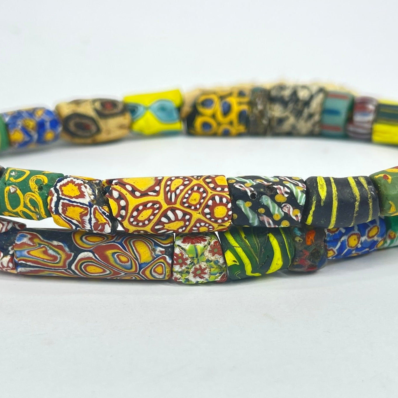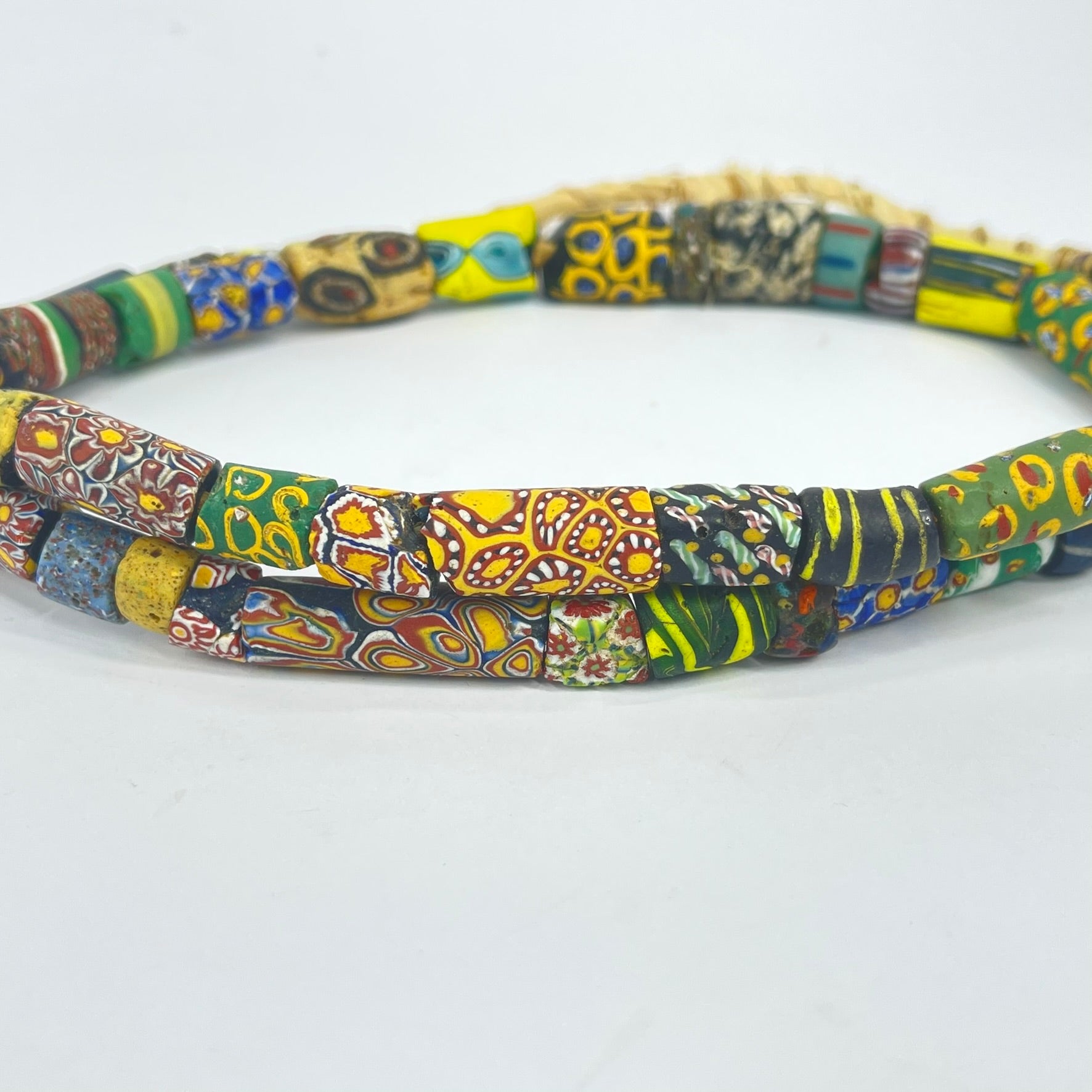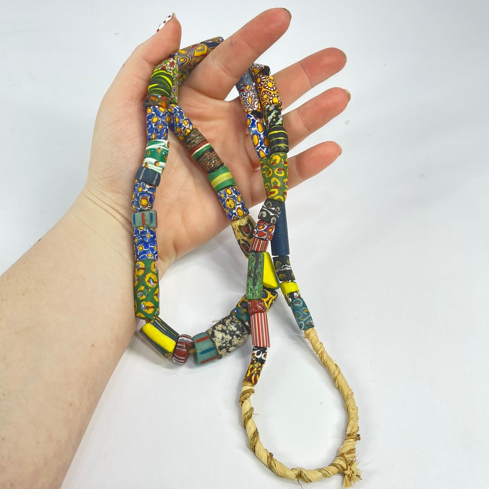 A strand of mixed Venetian trade beads is a fascinating collection of diverse colors, shapes, and patterns, each bead telling a unique story of craftsmanship and trade. Includes Millefiori, striped and more.
