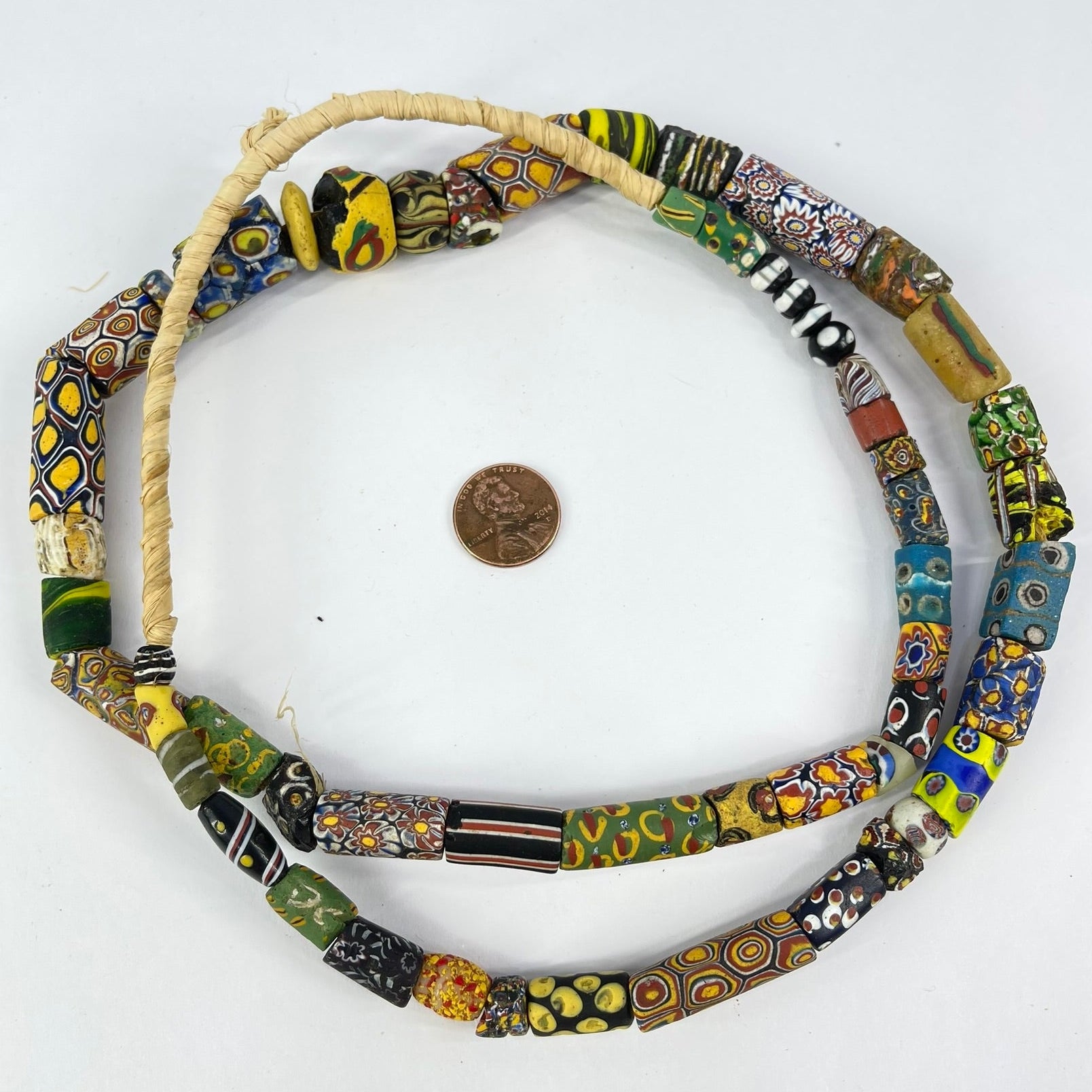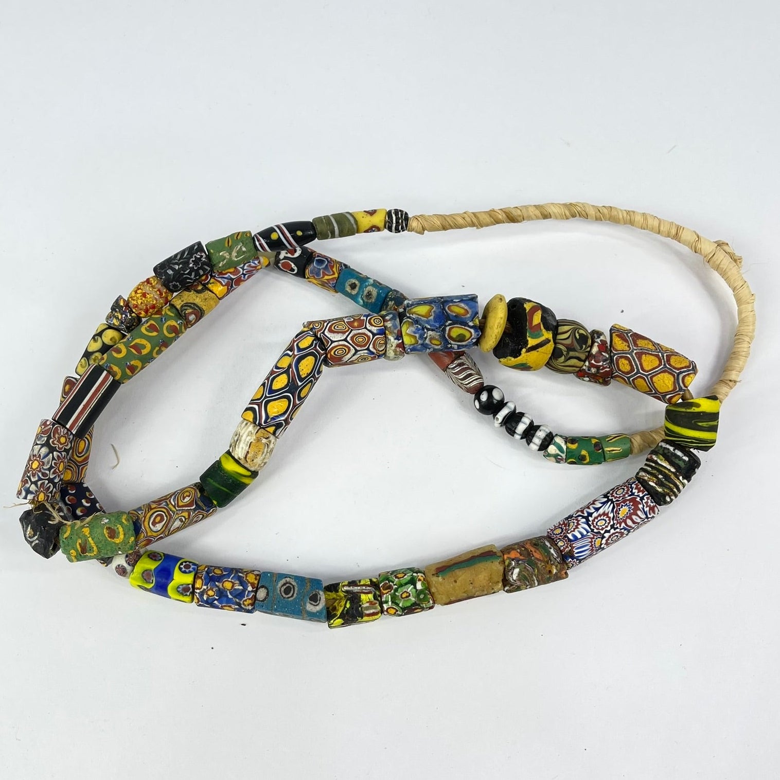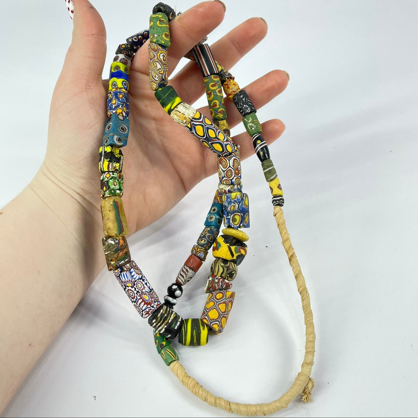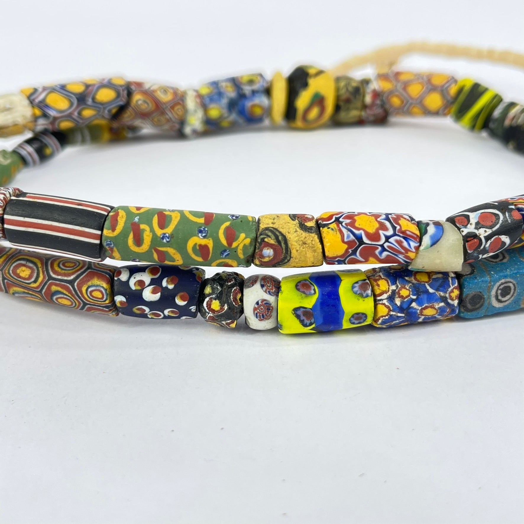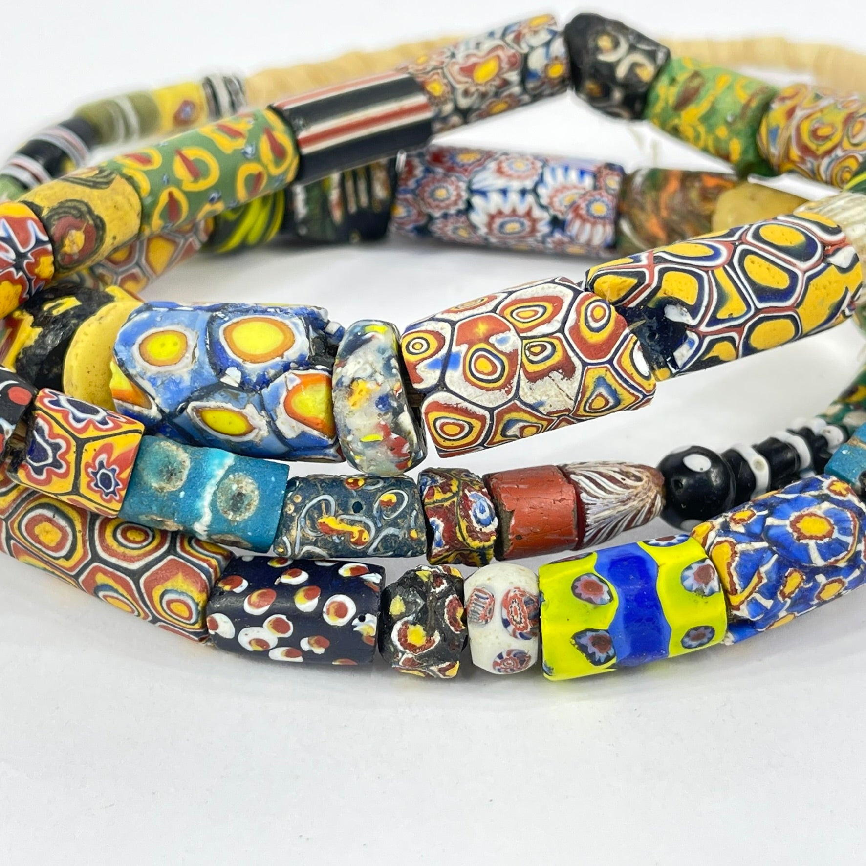 A strand of mixed Venetian trade beads is a fascinating collection of diverse colors, shapes, and patterns, each bead telling a unique story of craftsmanship and trade. Includes Millefiori, striped and more.