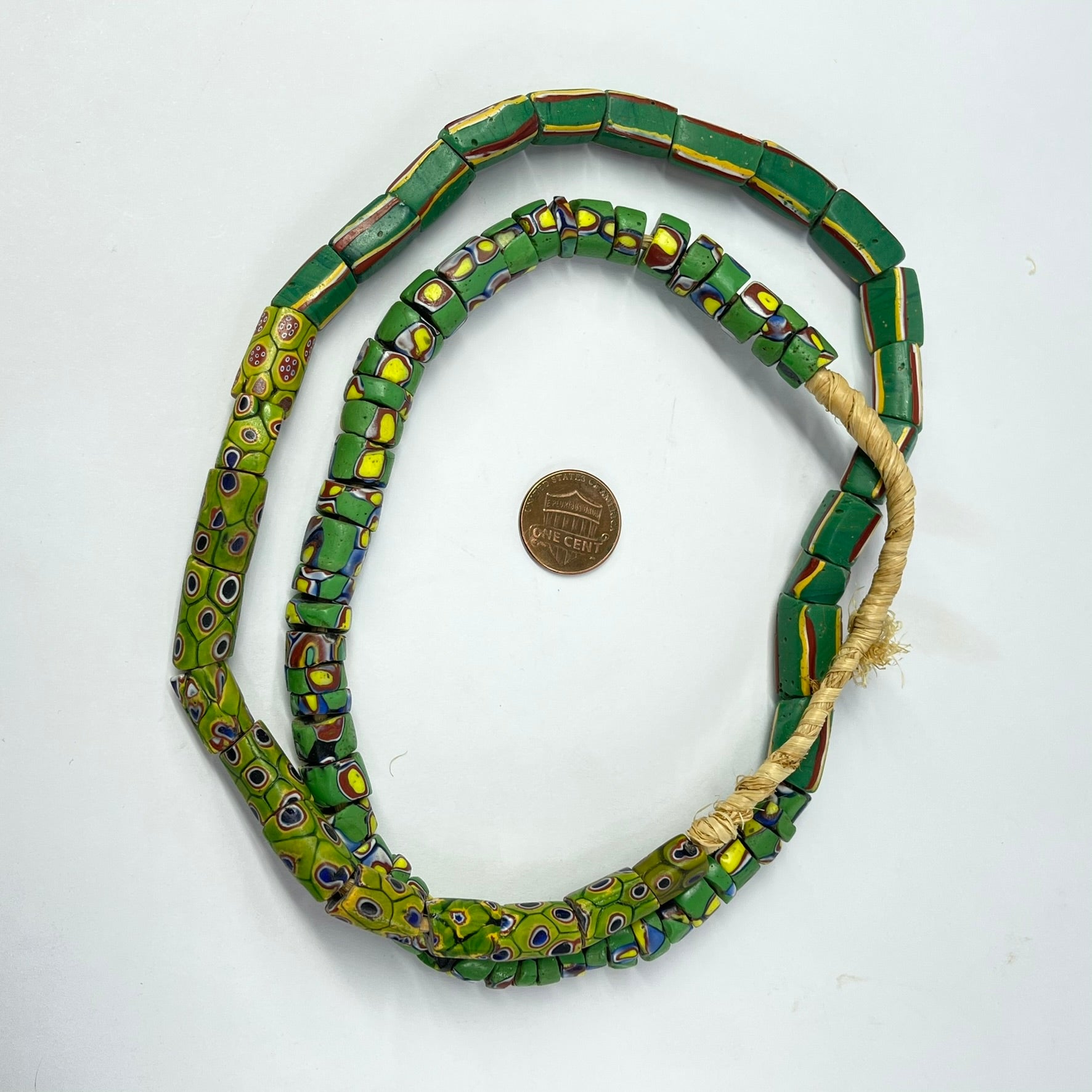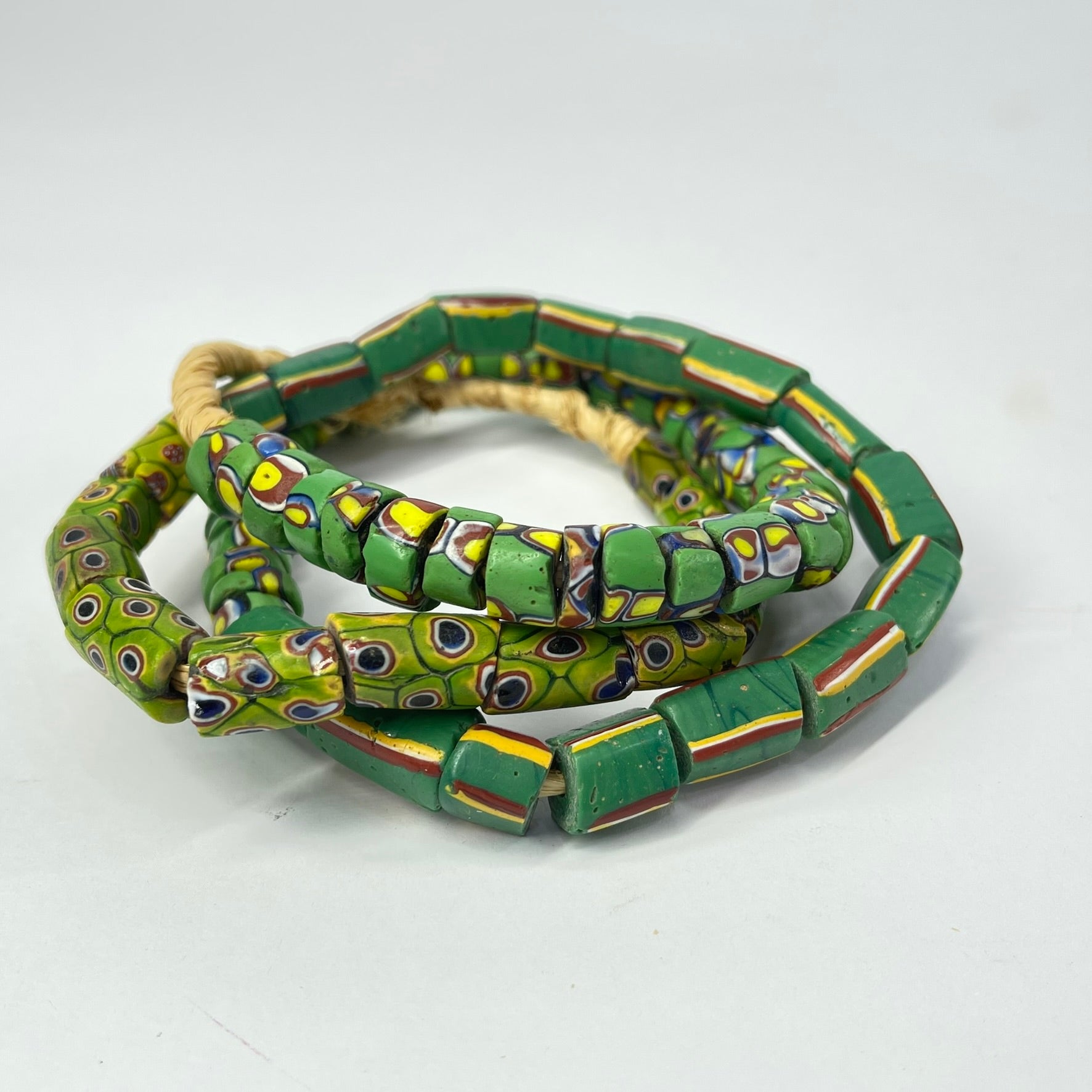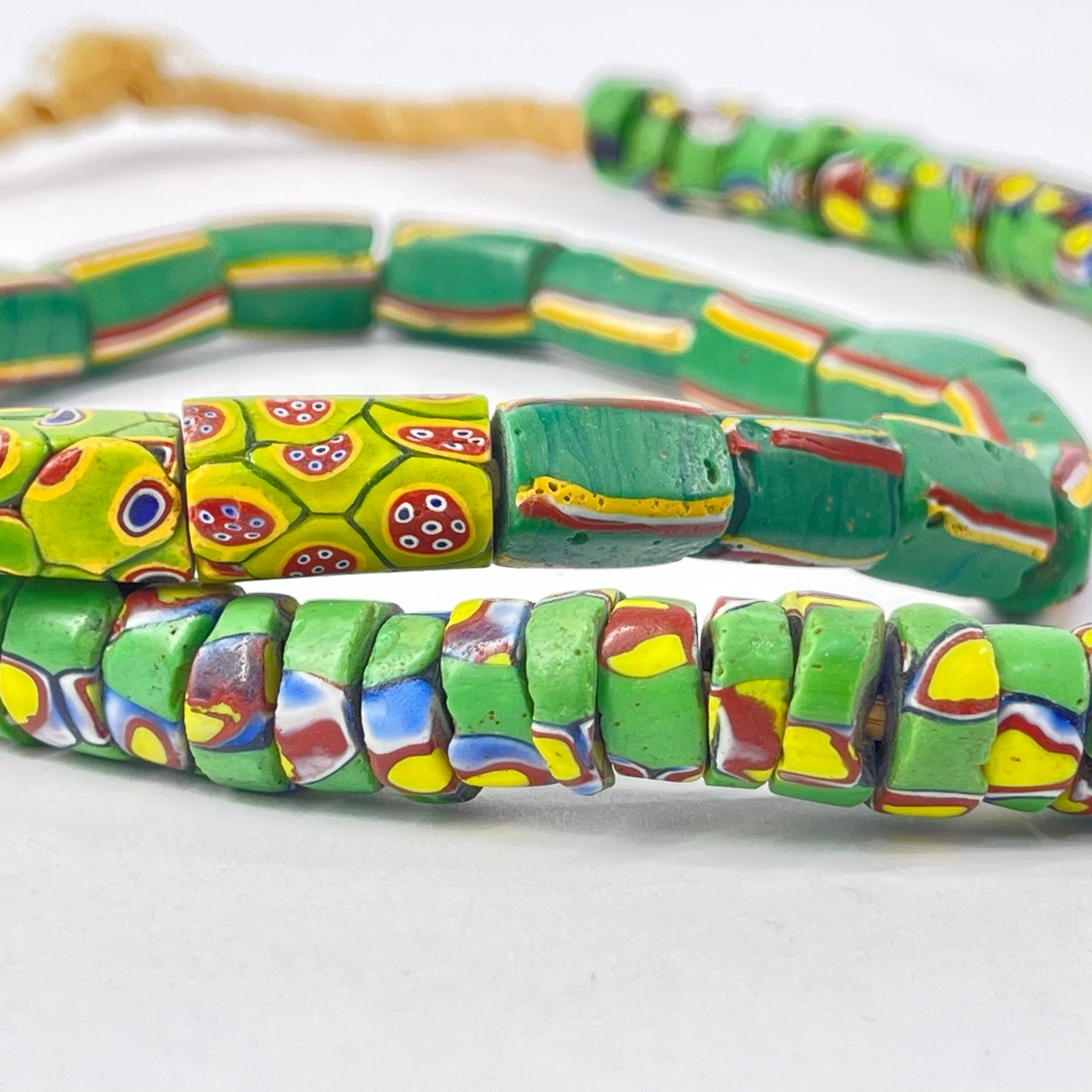 This beautiful strand has a mix of green Millefiori, Watermelon Millefiori, Venetian Striped, rectangle and slices.