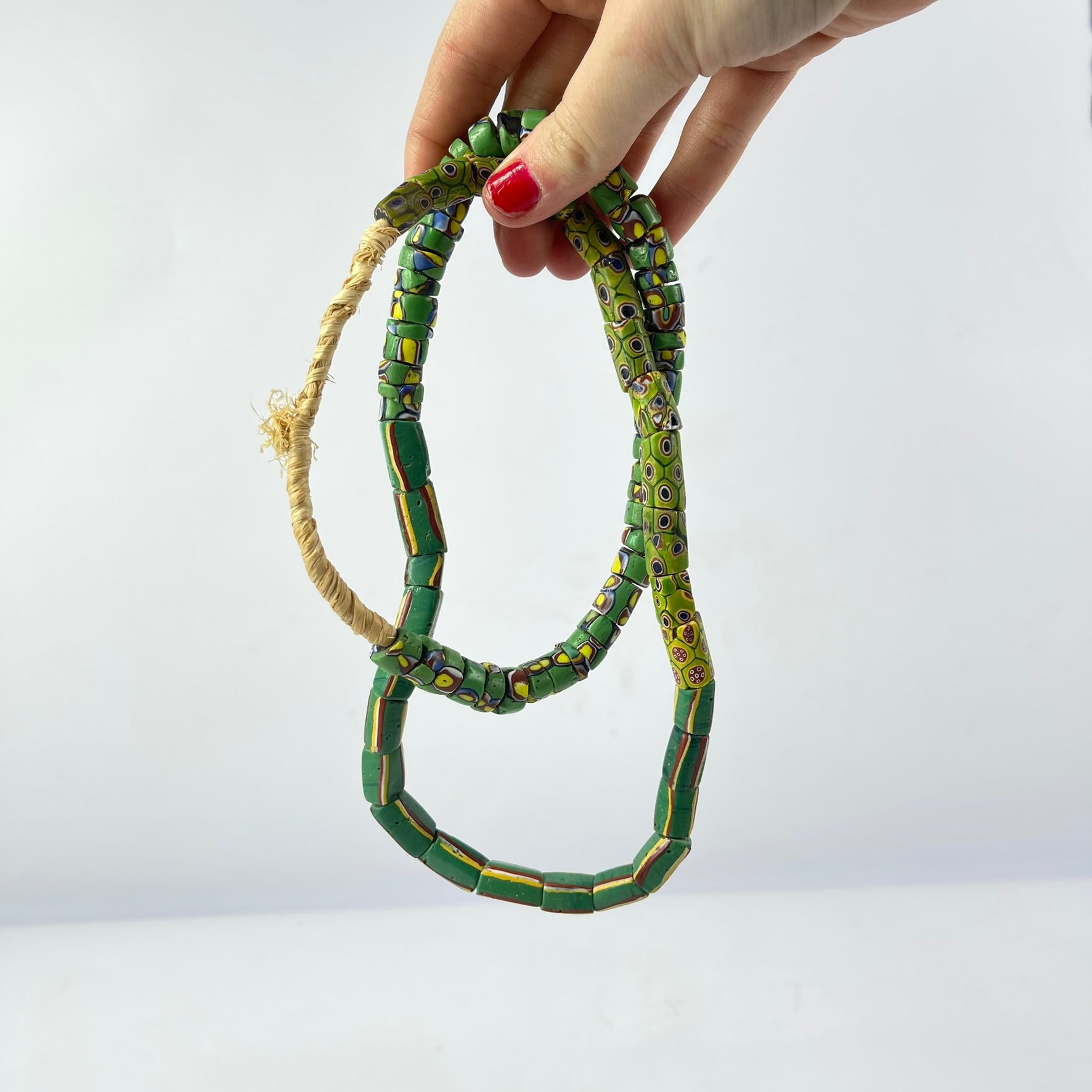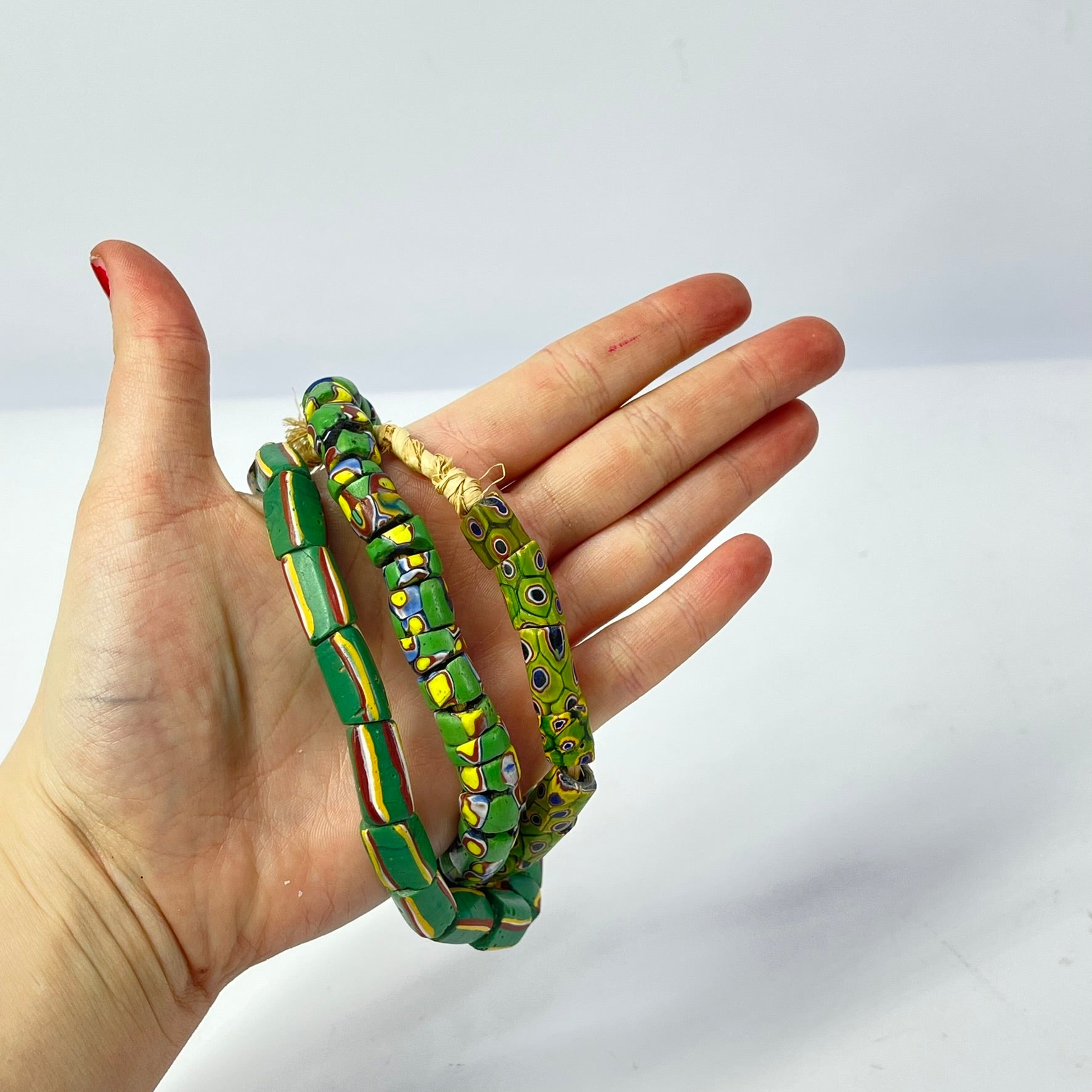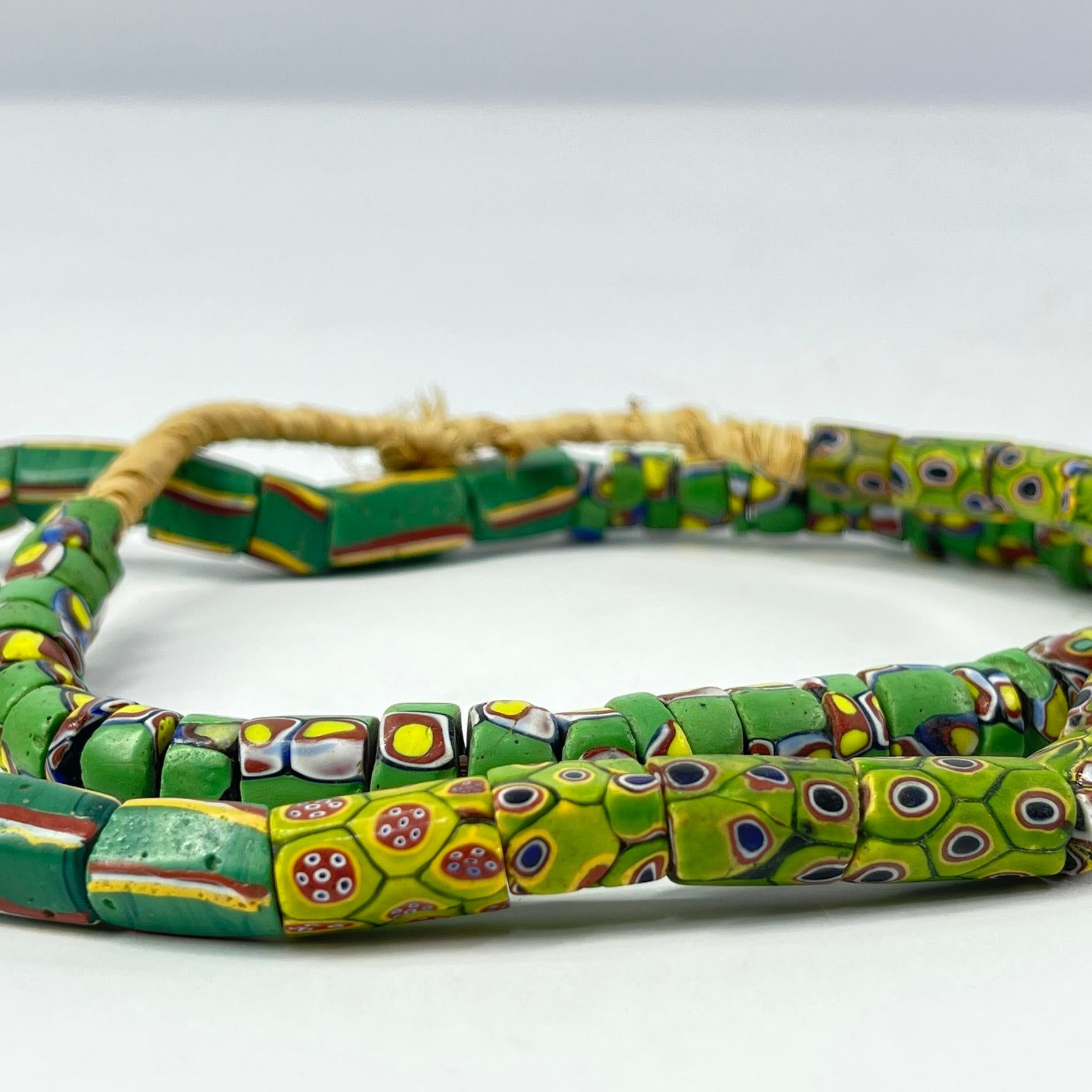 This beautiful strand has a mix of green Millefiori, Watermelon Millefiori, Venetian Striped, rectangle and slices.