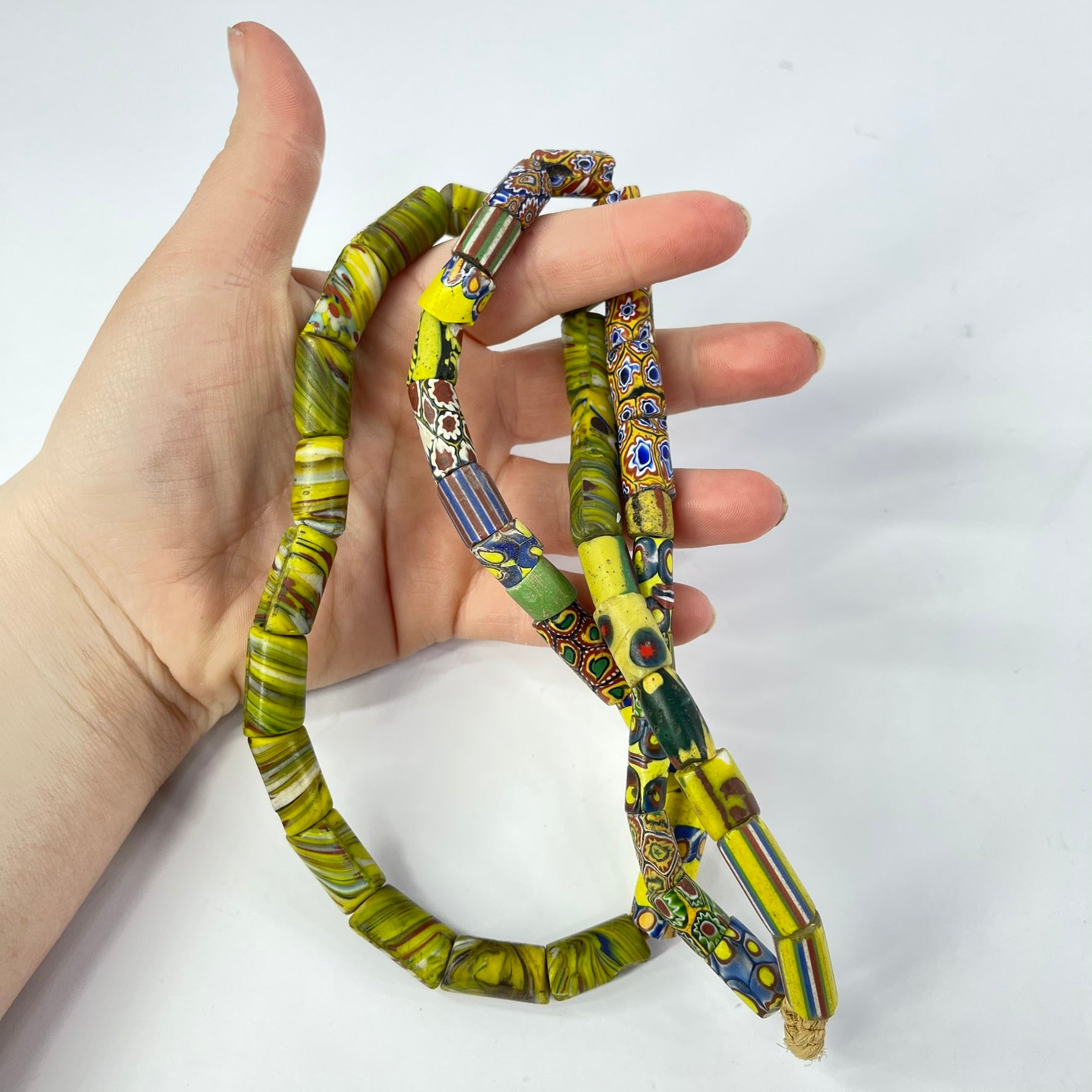 A 26-inch strand of mixed Venetian trade beads is a fascinating collection of diverse colors, shapes, and patterns, each bead telling a unique story of craftsmanship and trade. Crafted in Venice, Italy, these beads showcase the mastery of Venetian glass artisans, who skillfully combined vibrant hues and intricate designs to create stunning works of art. From bold stripes to delicate millefiori patterns, each bead reflects the cultural exchanges and global trade networks that shaped the world's history. These beads were not only prized for their beauty but also served as valuable commodities, exchanged across continents and cultures. A strand of mixed Venetian trade beads is not just a piece of jewelry; it's a tangible link to the rich tapestry of human interaction and creativity that spans centuries.