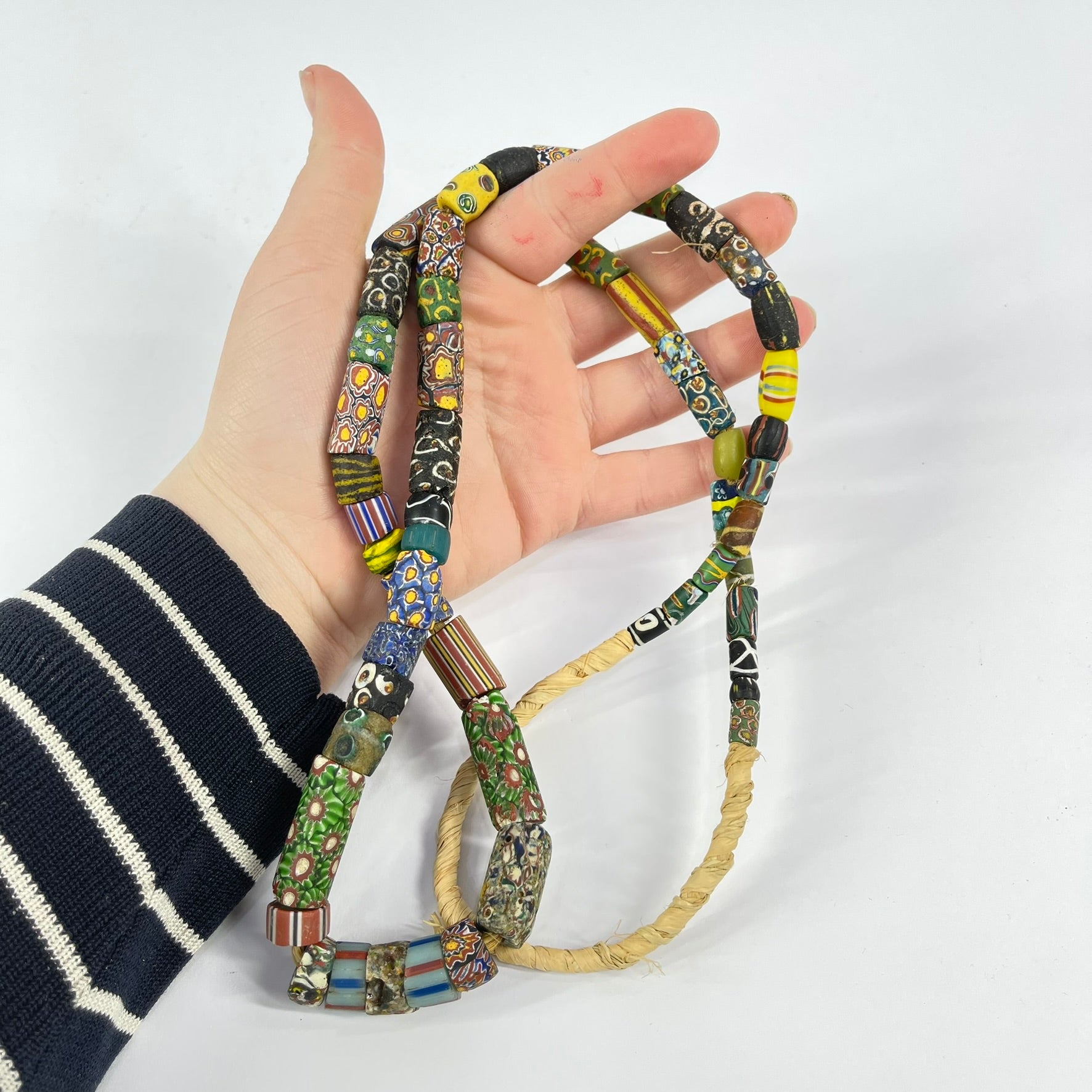 A 34-inch strand of mixed Venetian trade beads is a fascinating collection of diverse colors, shapes, and patterns, each bead telling a unique story of craftsmanship and trade. Crafted in Venice, Italy, these beads showcase the mastery of Venetian glass artisans, who skillfully combined vibrant hues and intricate designs to create stunning works of art. From bold stripes to delicate millefiori patterns, each bead reflects the cultural exchanges and global trade networks that shaped the world's history. These beads were not only prized for their beauty but also served as valuable commodities, exchanged across continents and cultures. A strand of mixed Venetian trade beads is not just a piece of jewelry; it's a tangible link to the rich tapestry of human interaction and creativity that spans centuries.