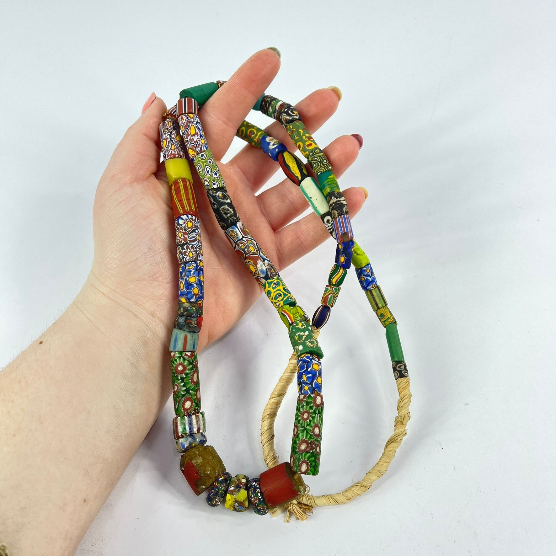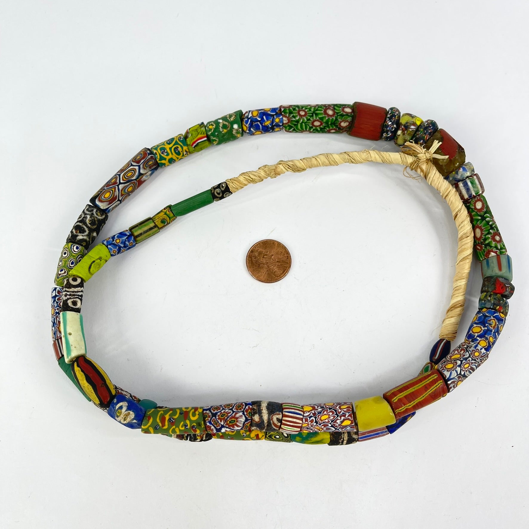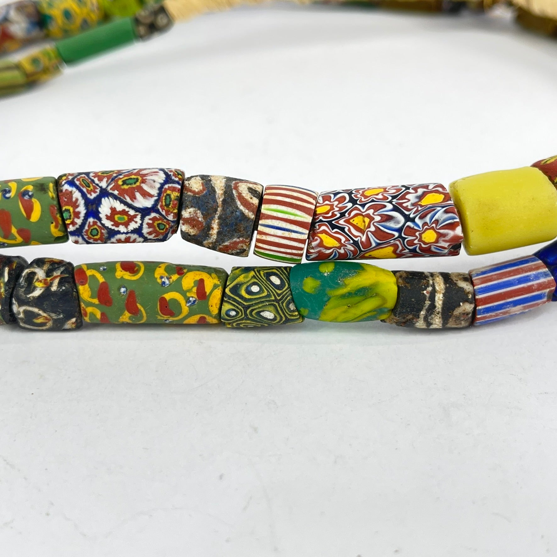 A 34-inch strand of mixed Venetian trade beads is a fascinating collection of diverse colors, shapes, and patterns, each bead telling a unique story of craftsmanship and trade. Crafted in Venice, Italy, these beads showcase the mastery of Venetian glass artisans, who skillfully combined vibrant hues and intricate designs to create stunning works of art. From bold stripes to delicate millefiori patterns, each bead reflects the cultural exchanges and global trade networks that shaped the world's history. These beads were not only prized for their beauty but also served as valuable commodities, exchanged across continents and cultures. A strand of mixed Venetian trade beads is not just a piece of jewelry; it's a tangible link to the rich tapestry of human interaction and creativity that spans centuries.