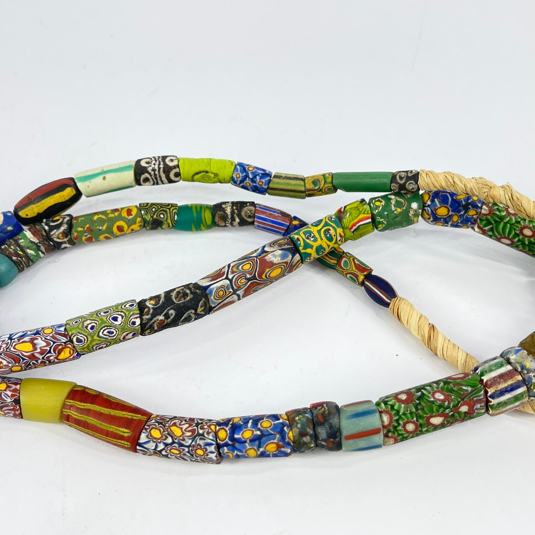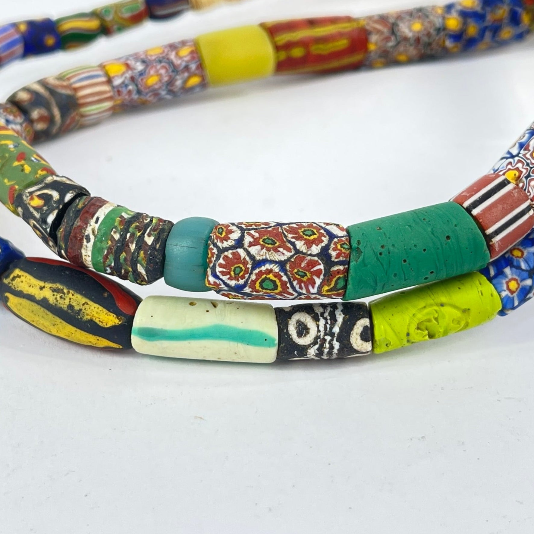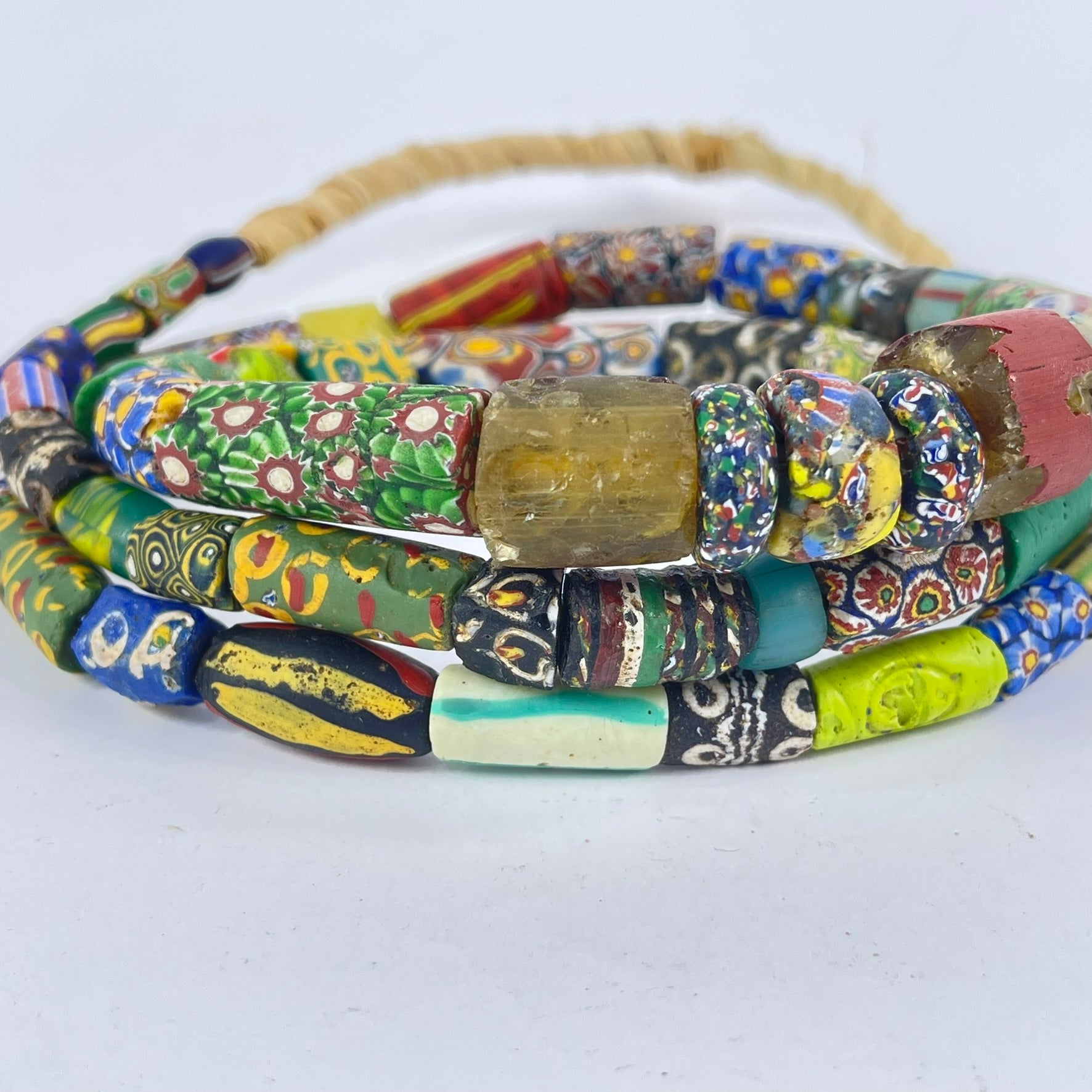 A 34-inch strand of mixed Venetian trade beads is a fascinating collection of diverse colors, shapes, and patterns, each bead telling a unique story of craftsmanship and trade. Crafted in Venice, Italy, these beads showcase the mastery of Venetian glass artisans, who skillfully combined vibrant hues and intricate designs to create stunning works of art. From bold stripes to delicate millefiori patterns, each bead reflects the cultural exchanges and global trade networks that shaped the world's history. These beads were not only prized for their beauty but also served as valuable commodities, exchanged across continents and cultures. A strand of mixed Venetian trade beads is not just a piece of jewelry; it's a tangible link to the rich tapestry of human interaction and creativity that spans centuries.