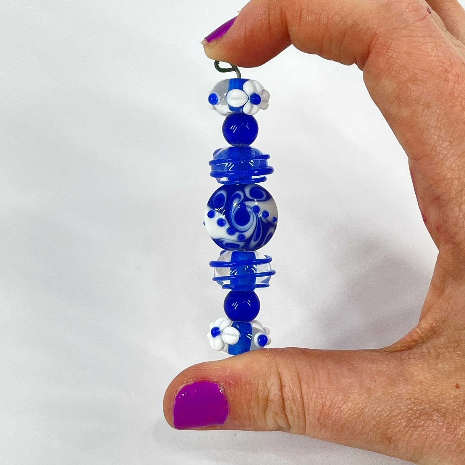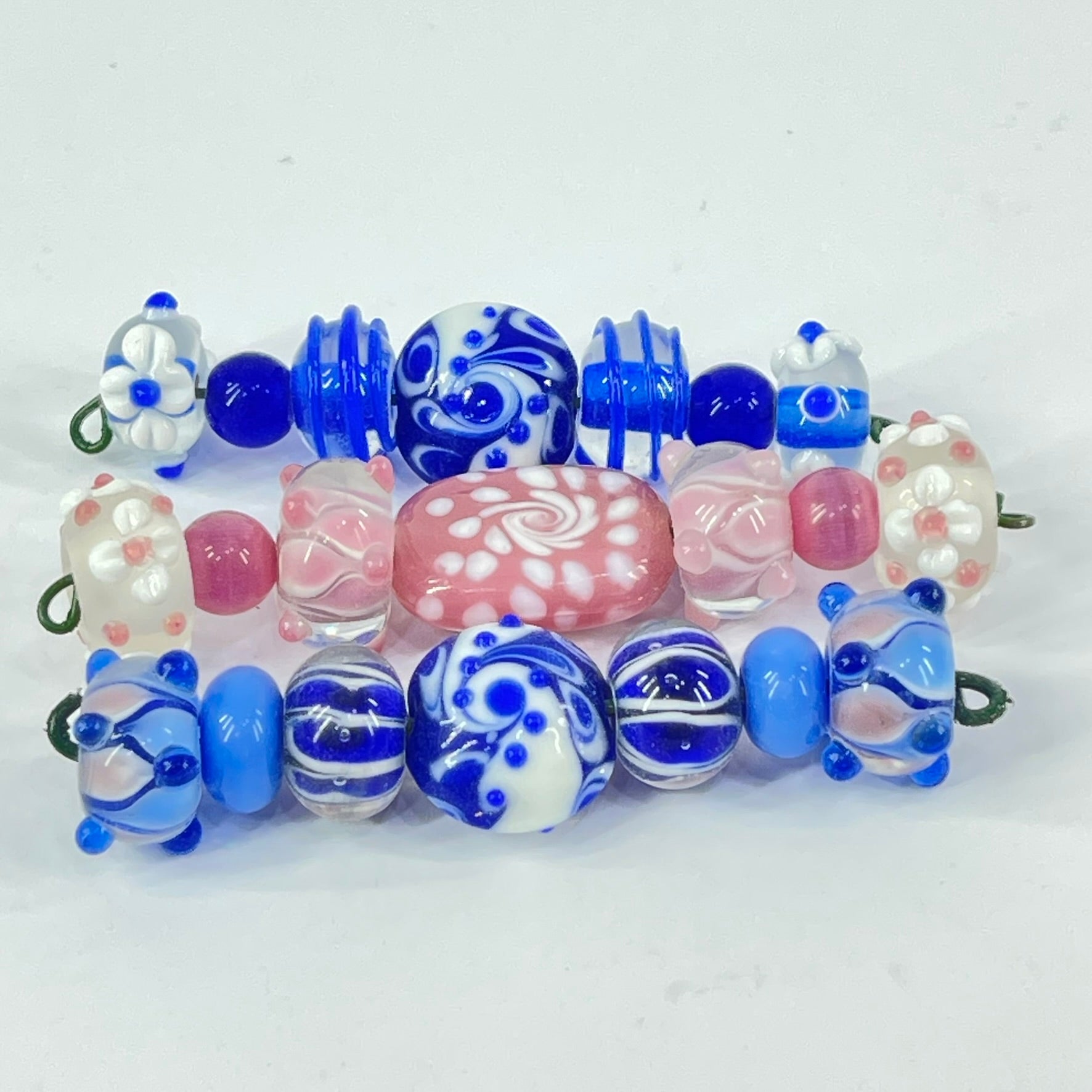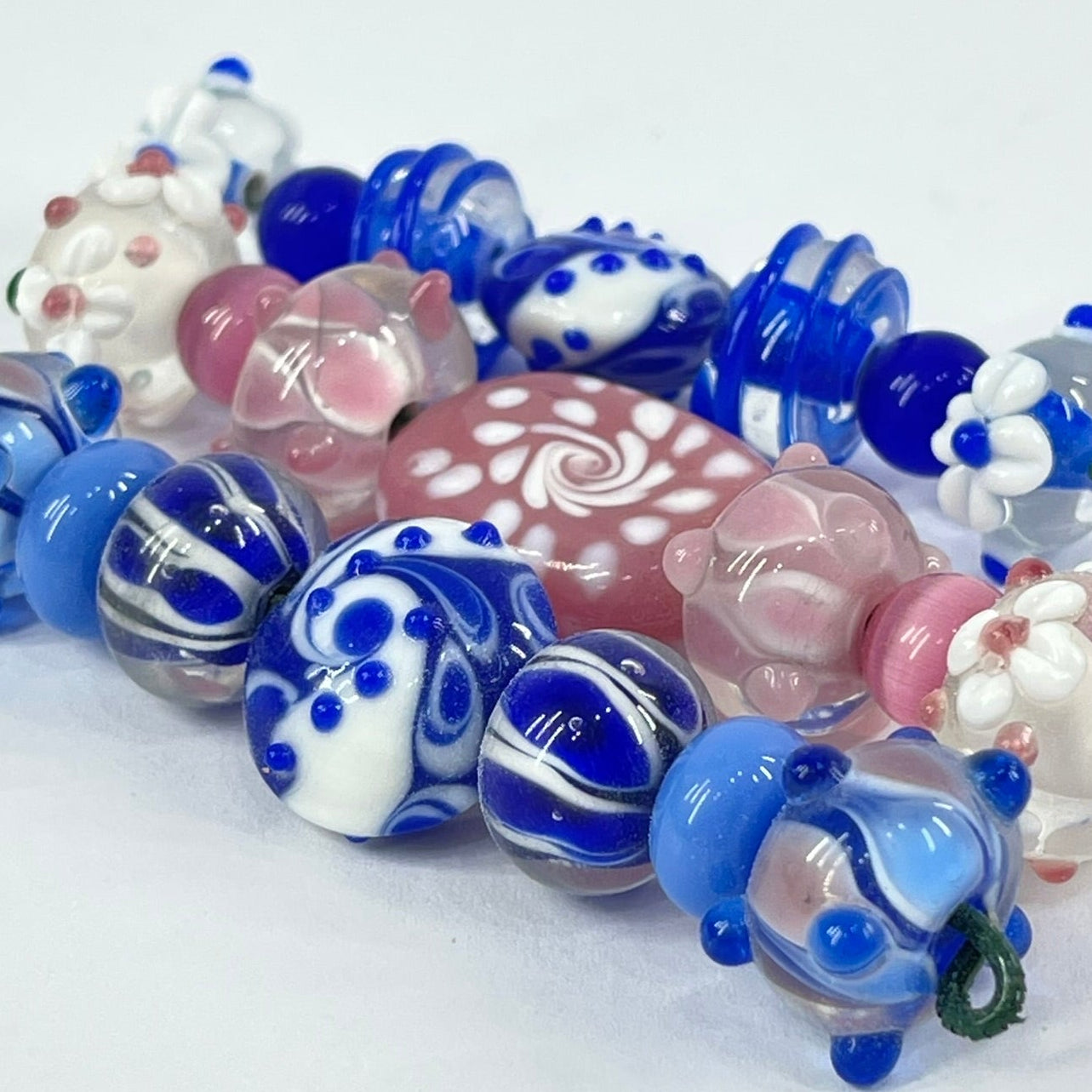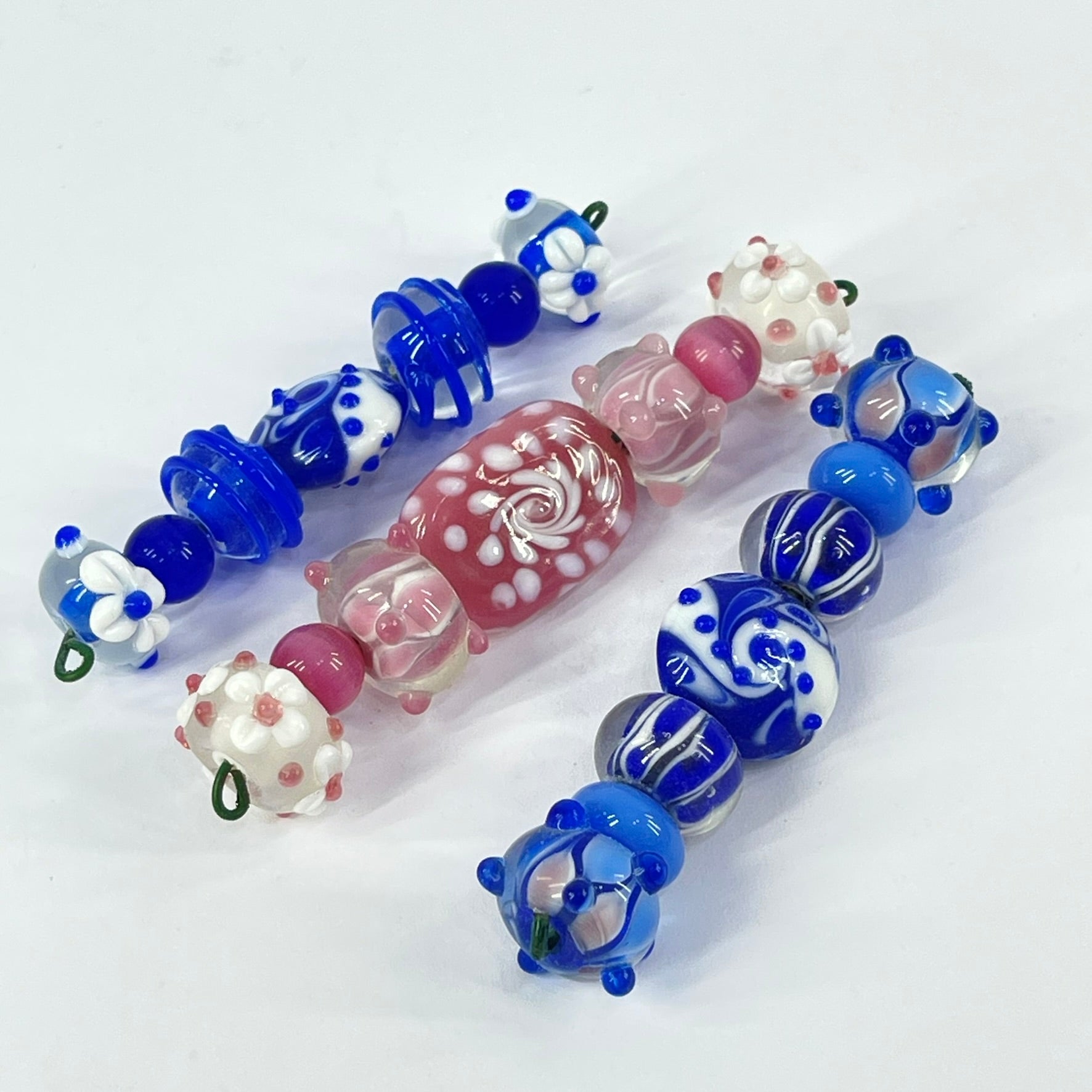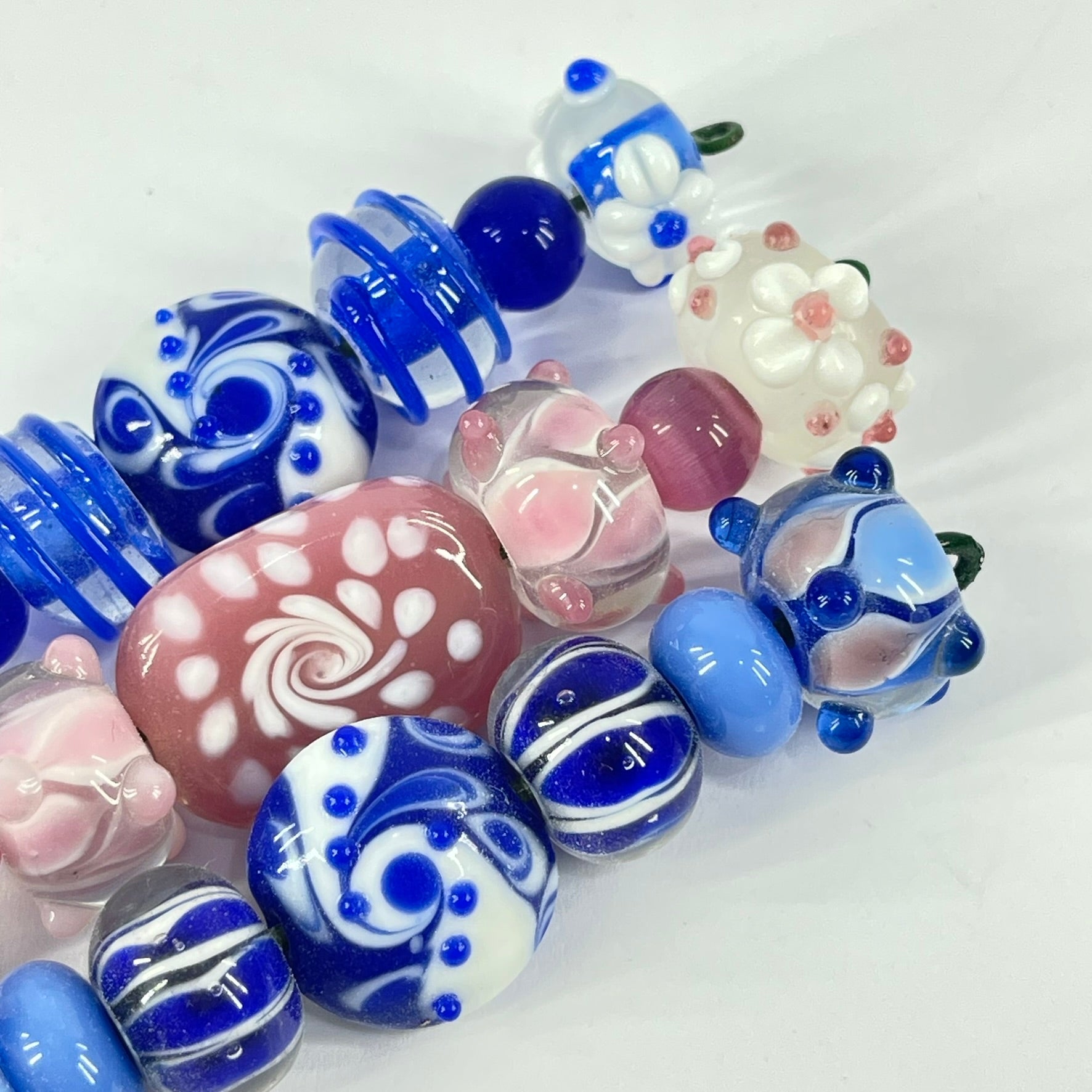 A colorful assortment of handmade lampwork glass beads featuring delicate floral motifs, swirls, and raised decorative details. Crafted by melting and shaping glass over a flame, each bead displays unique patterns in soft pinks, deep cobalt blues, and milky whites. Their glossy finish and dimensional designs make them perfect for creating eye-catching necklaces, bracelets, or other one-of-a-kind jewelry pieces.