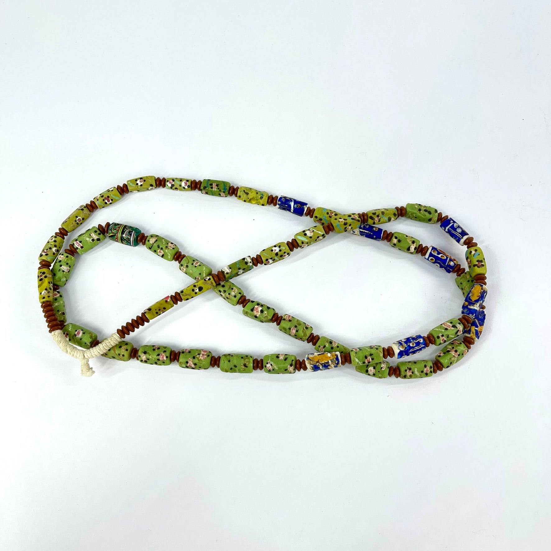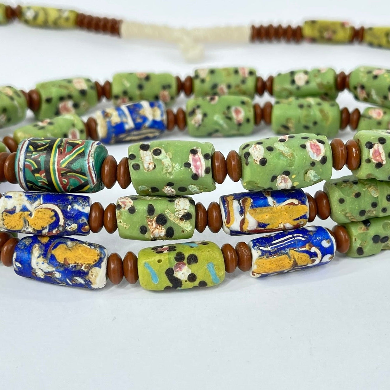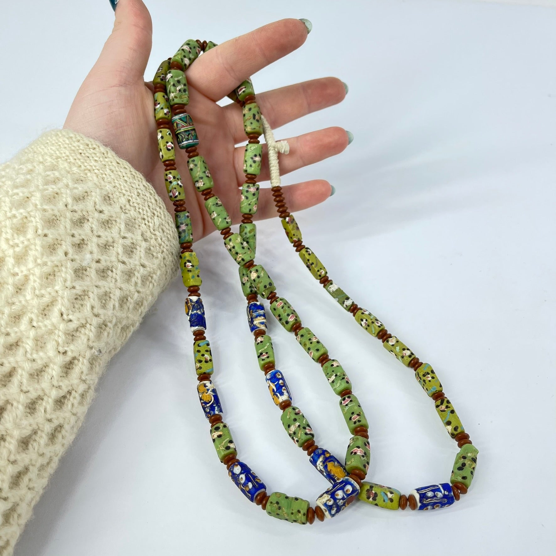 A 40-inch strand of mixed Venetian trade beads is a fascinating collection of diverse colors, shapes, and patterns, each bead telling a unique story of craftsmanship and trade. Crafted in Venice, Italy, these beads showcase the mastery of Venetian glass artisans, who skillfully combined vibrant hues and intricate designs to create stunning works of art. From bold stripes to delicate millefiori patterns, each bead reflects the cultural exchanges and global trade networks that shaped the world's history. These beads were not only prized for their beauty but also served as valuable commodities, exchanged across continents and cultures. A strand of mixed Venetian trade beads is not just a piece of jewelry; it's a tangible link to the rich tapestry of human interaction and creativity that spans centuries.