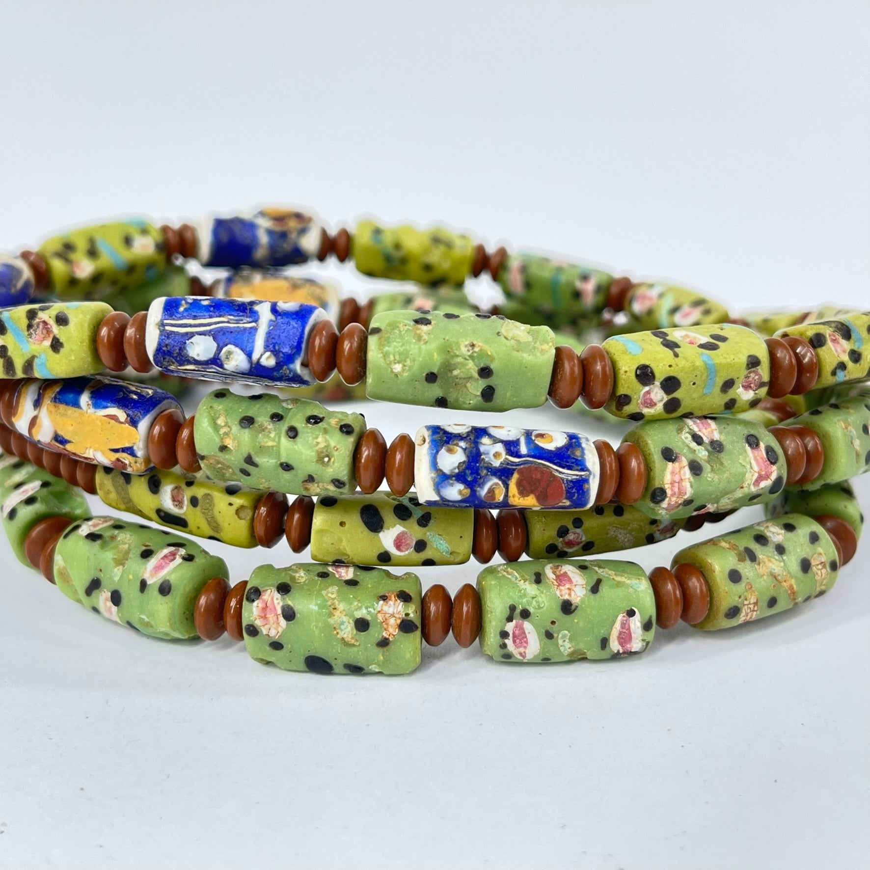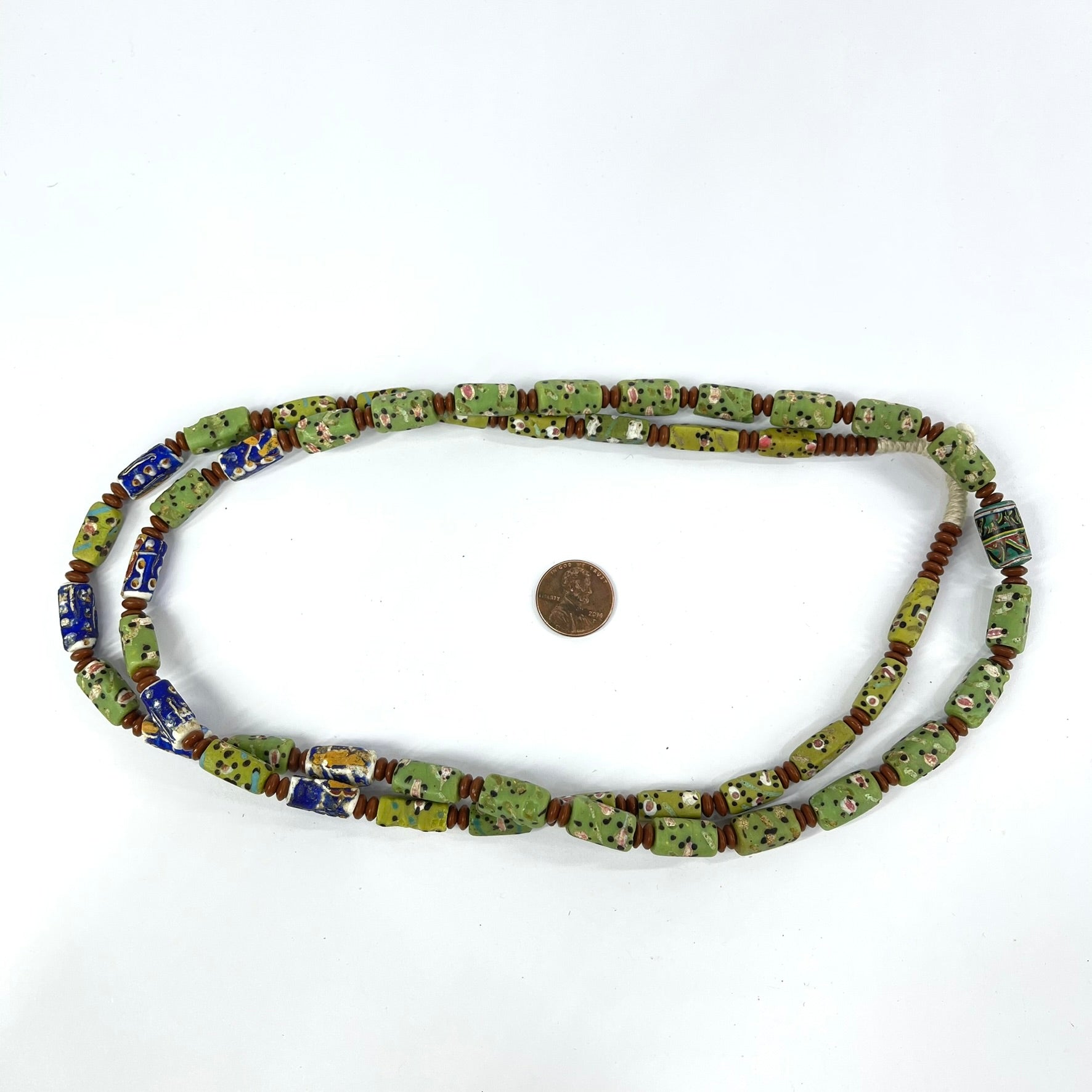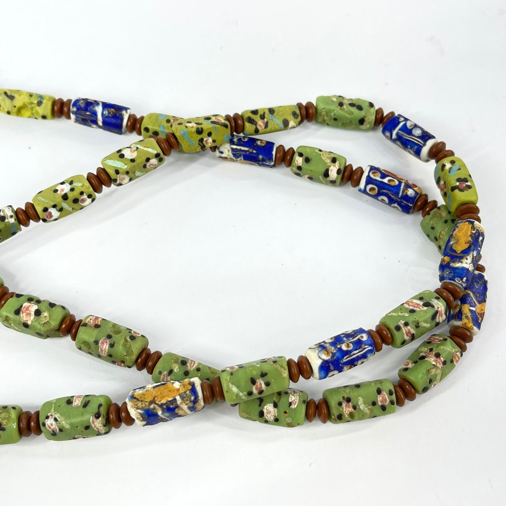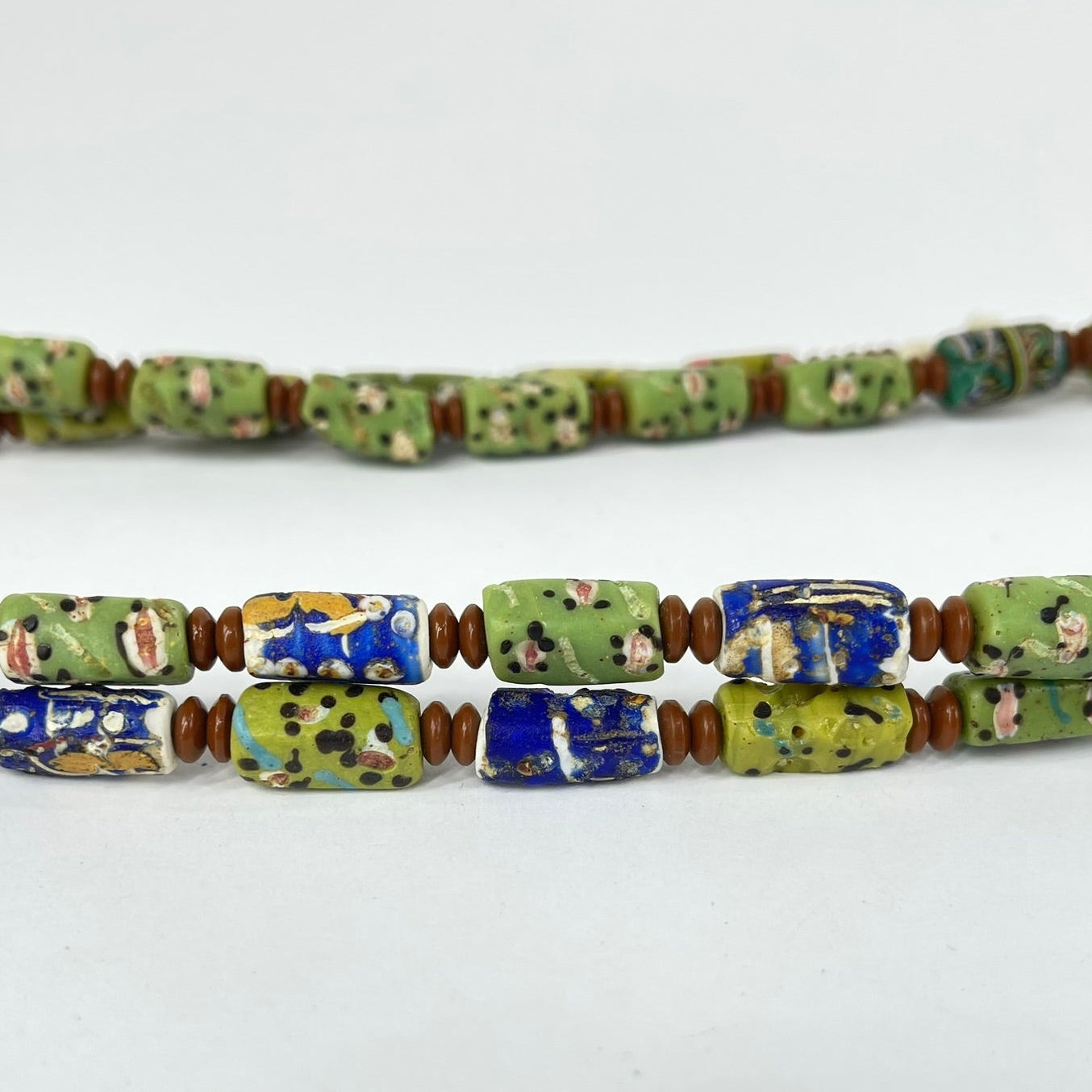 A 40-inch strand of mixed Venetian trade beads is a fascinating collection of diverse colors, shapes, and patterns, each bead telling a unique story of craftsmanship and trade. Crafted in Venice, Italy, these beads showcase the mastery of Venetian glass artisans, who skillfully combined vibrant hues and intricate designs to create stunning works of art. From bold stripes to delicate millefiori patterns, each bead reflects the cultural exchanges and global trade networks that shaped the world's history. These beads were not only prized for their beauty but also served as valuable commodities, exchanged across continents and cultures. A strand of mixed Venetian trade beads is not just a piece of jewelry; it's a tangible link to the rich tapestry of human interaction and creativity that spans centuries.