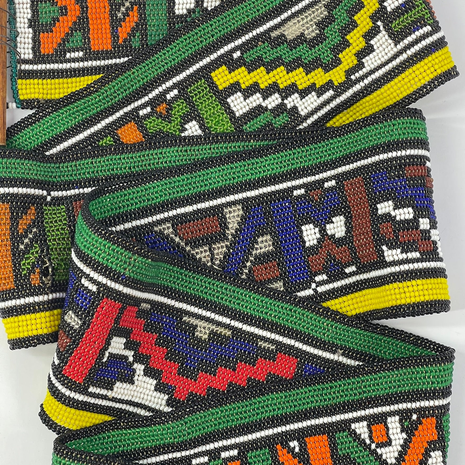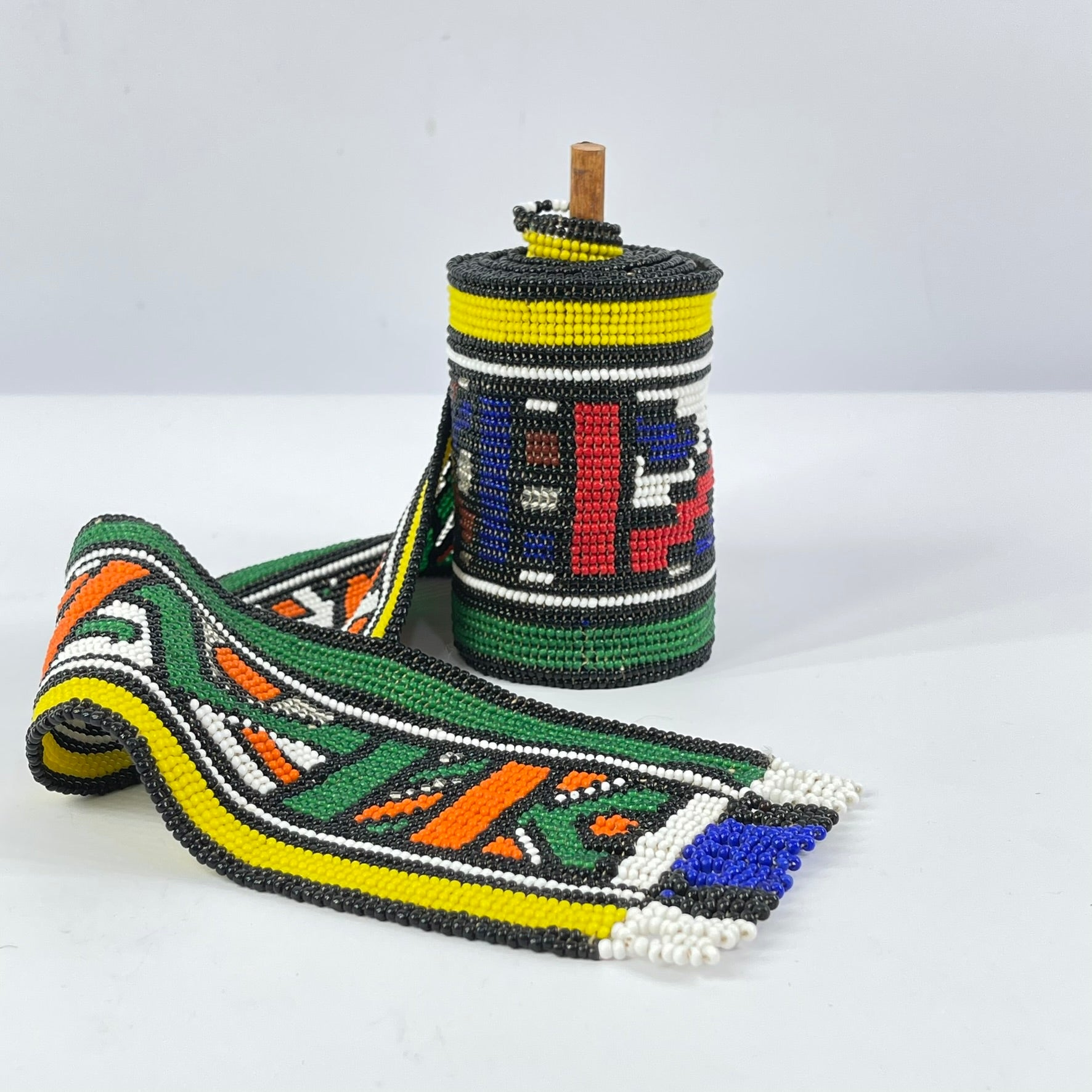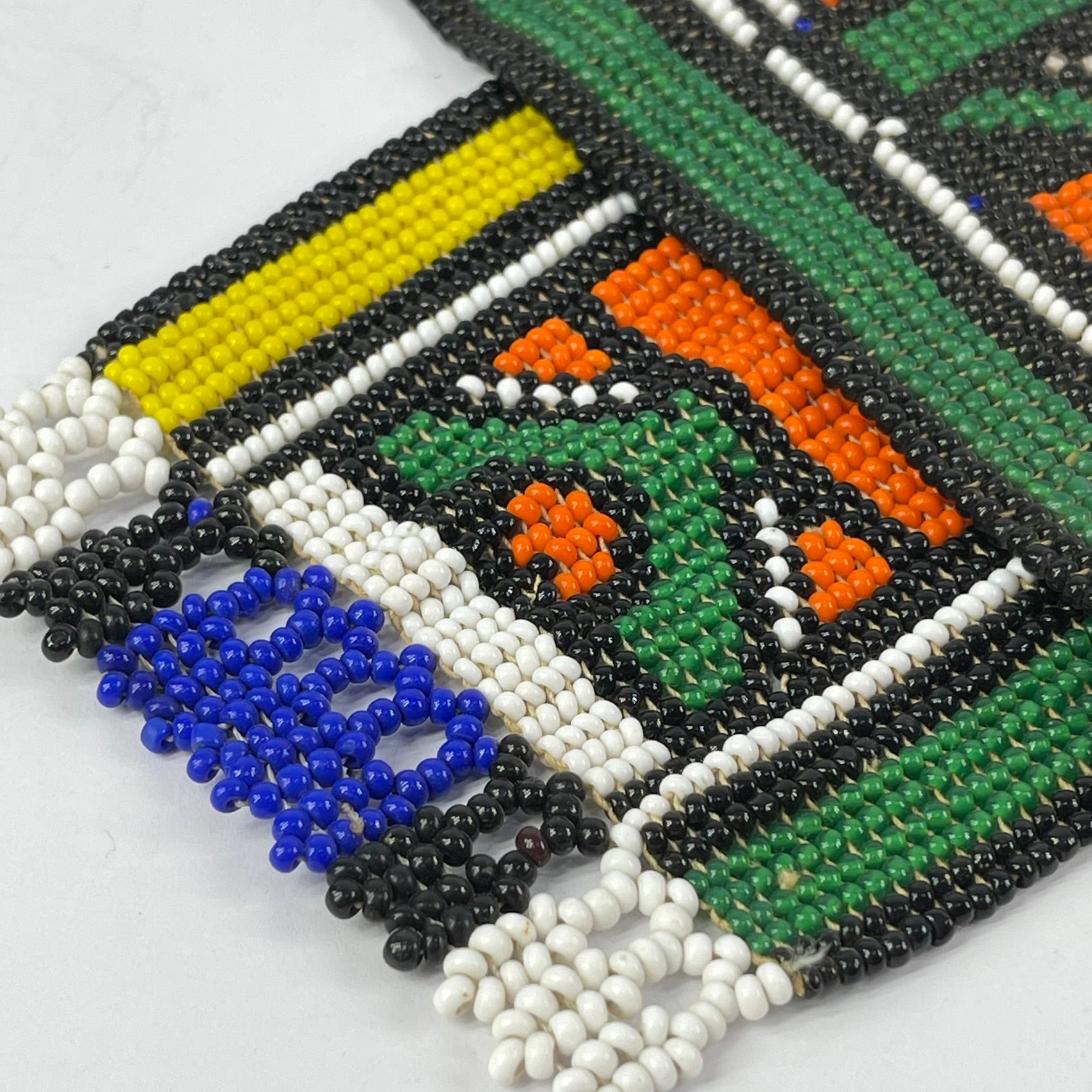 The meticulous hand-beading and strong graphic structure of this piece demonstrate the technical skill and creative vision of Ndebele women, who are the primary custodians of both beadwork and mural painting traditions within their communities.