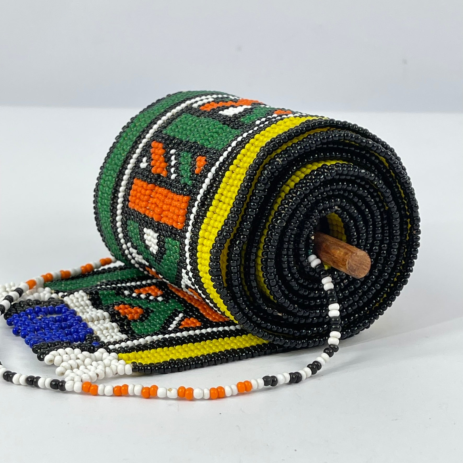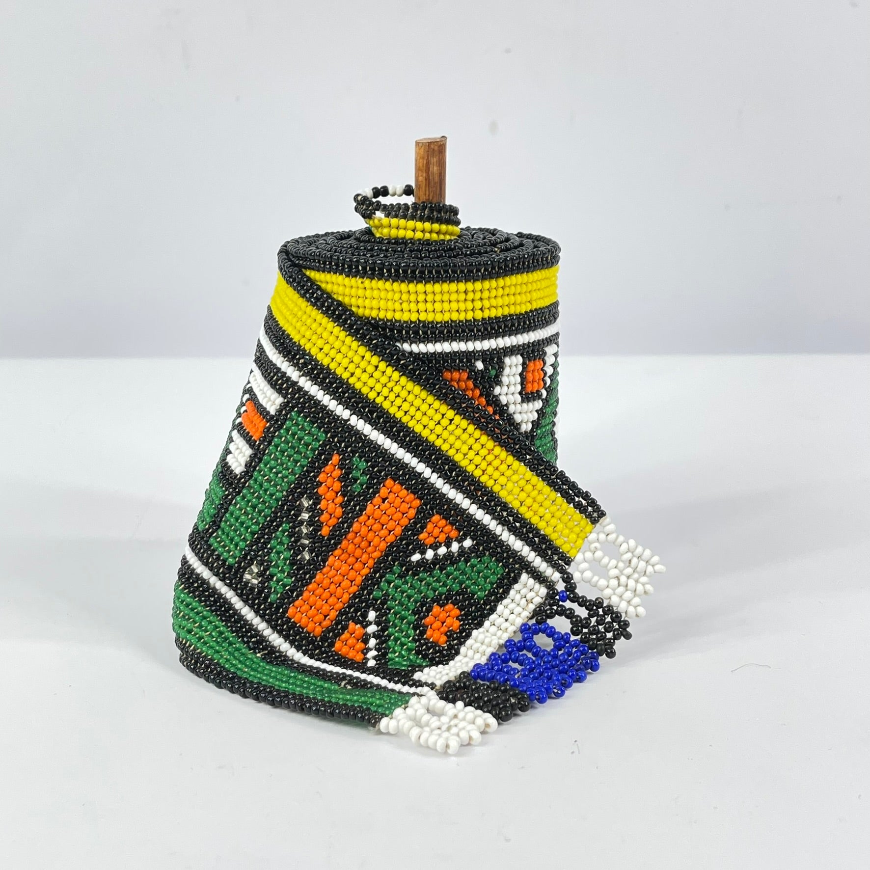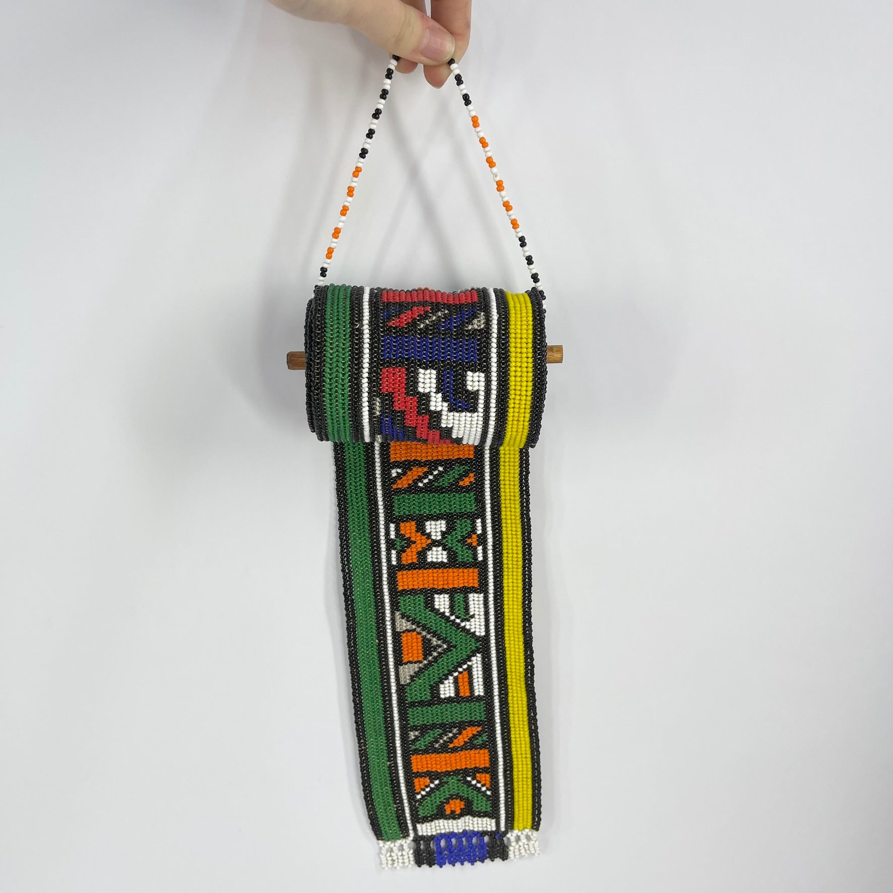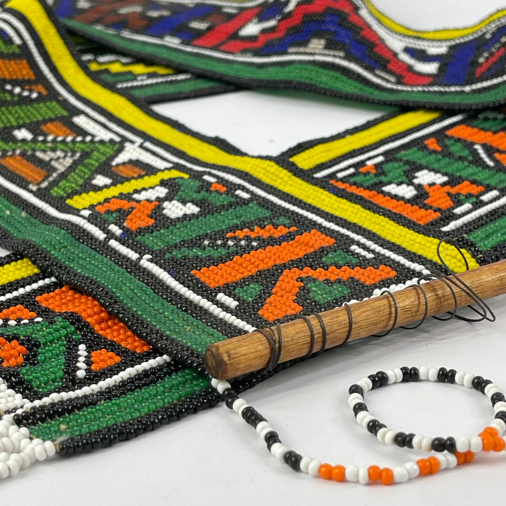 The meticulous hand-beading and strong graphic structure of this piece demonstrate the technical skill and creative vision of Ndebele women, who are the primary custodians of both beadwork and mural painting traditions within their communities.