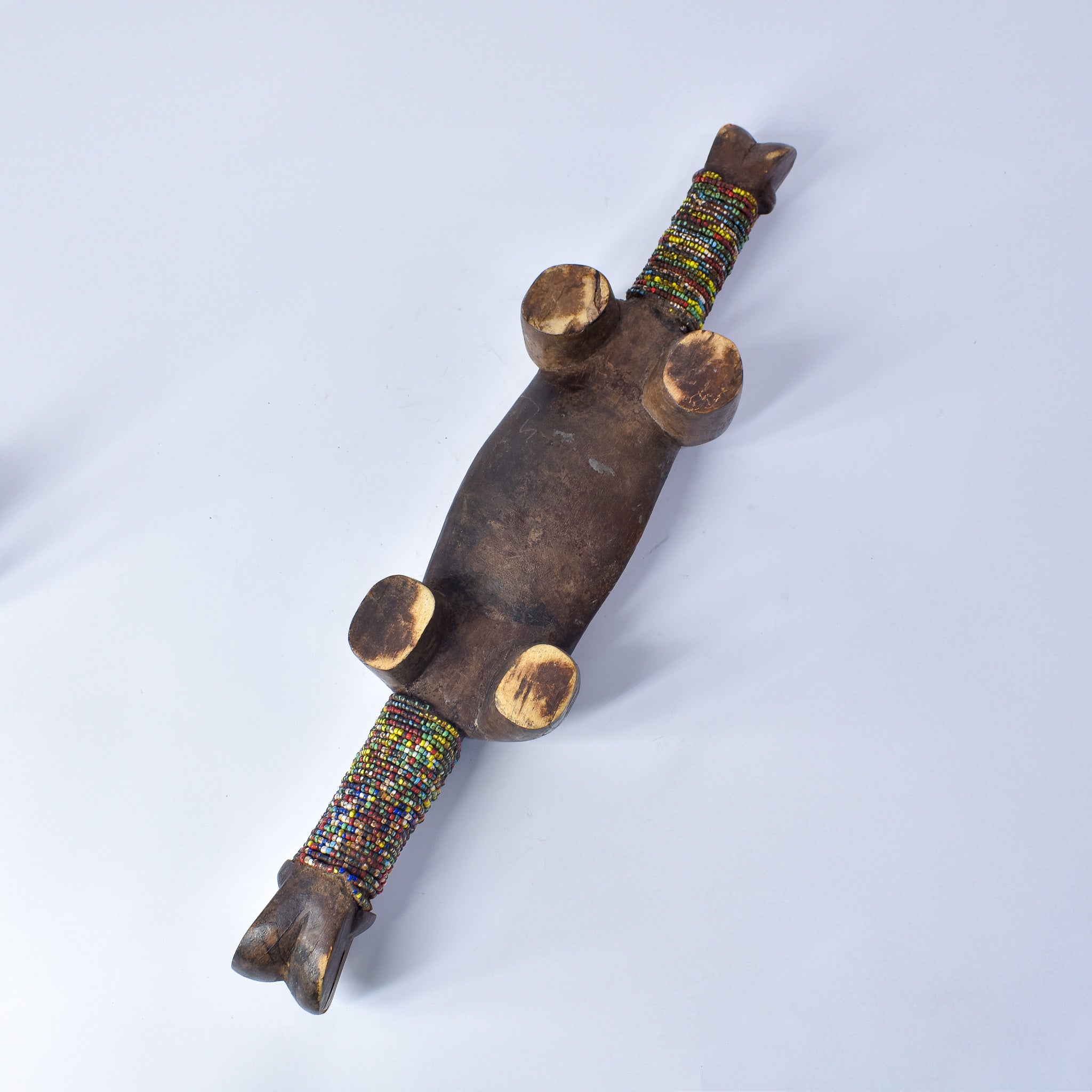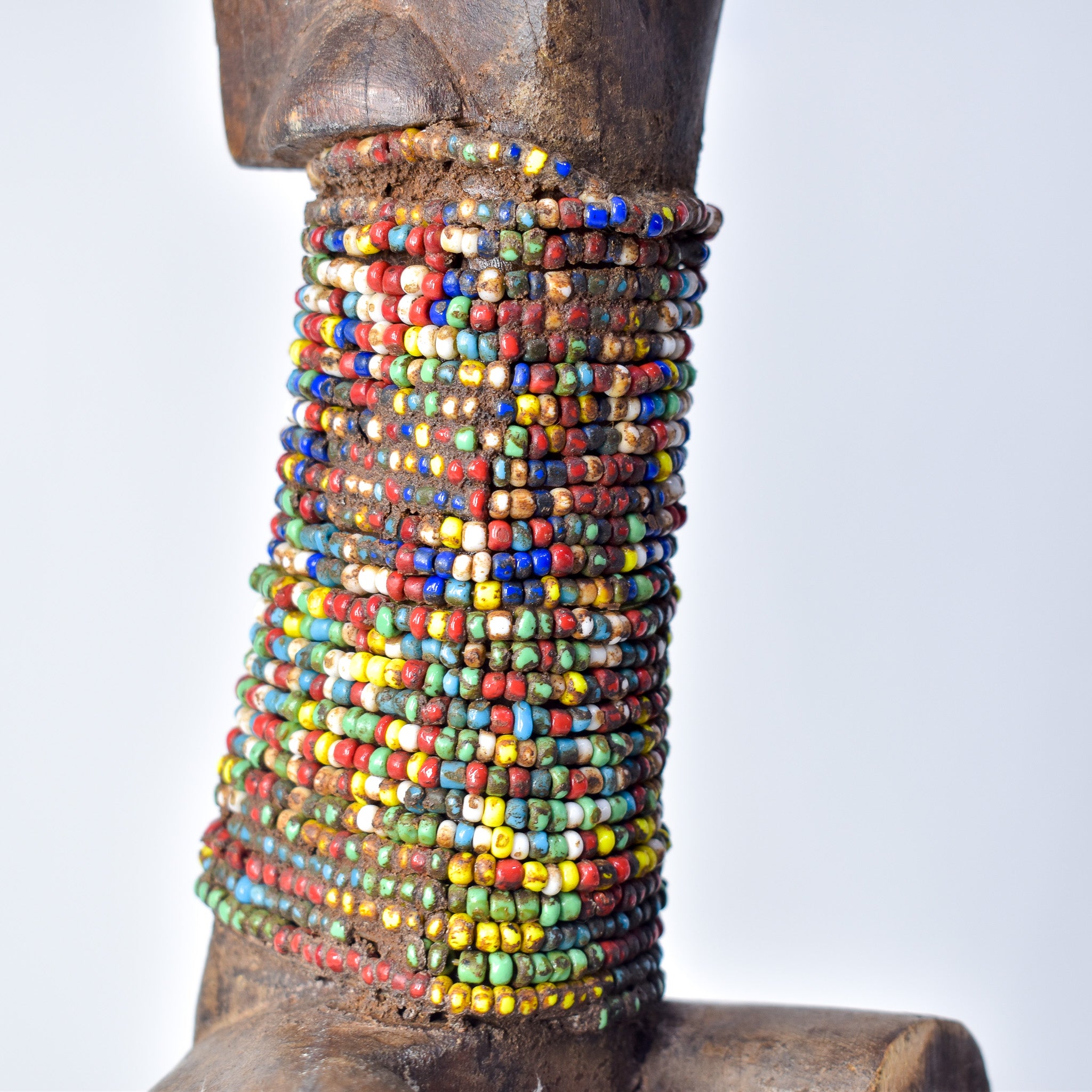 This example is particularly striking for its embellishment with colorful glass beads, carefully applied in decorative patterns. Beads were highly valued in East and Central Africa, often acquired through long-distance trade, and their inclusion here adds a vibrant aesthetic dimension as well as cultural meaning. The smooth patina of the wood reflects years of use, while the beads introduce a lively contrast, balancing practicality with artistry.