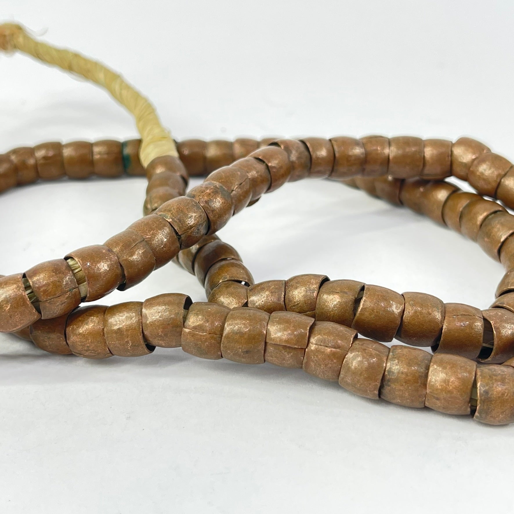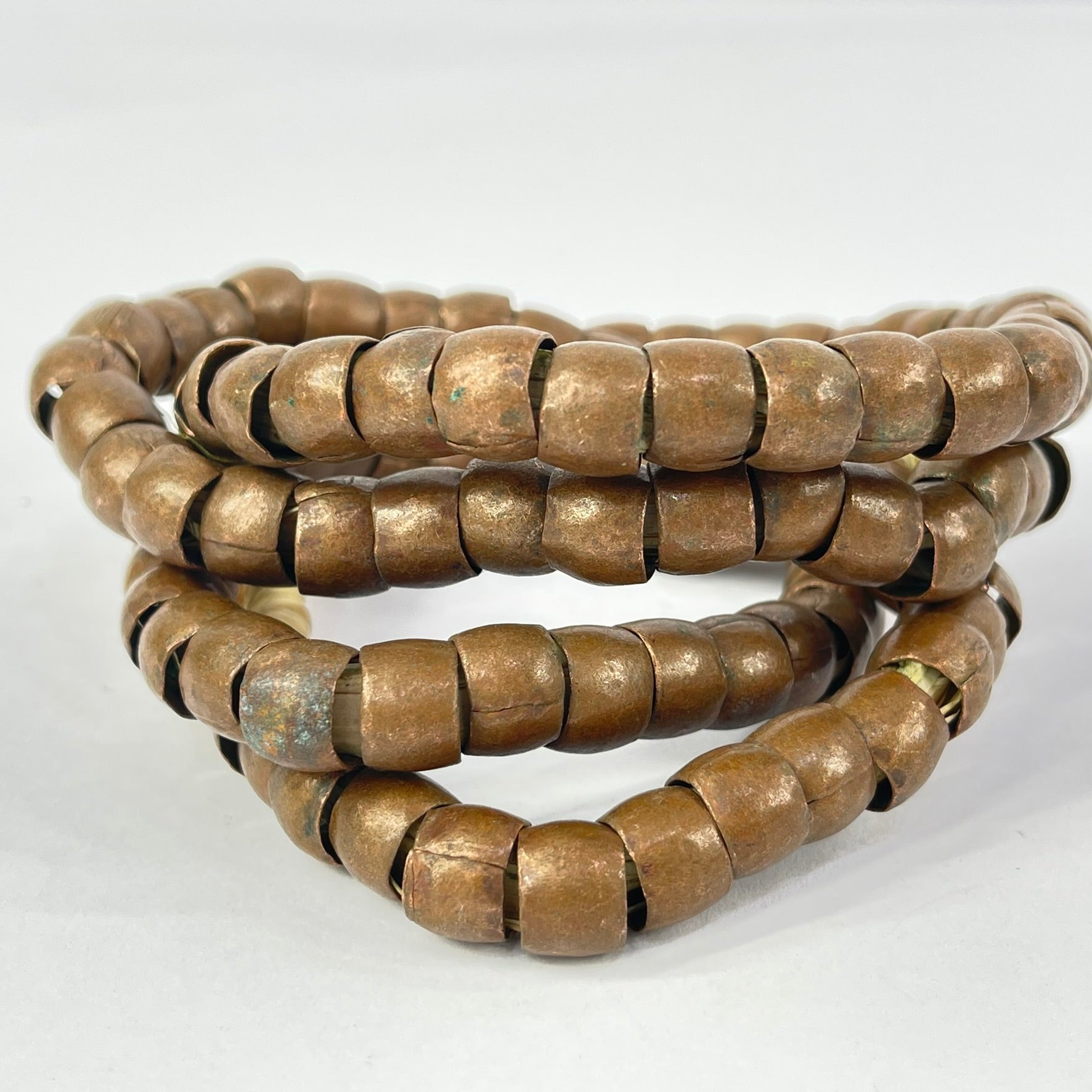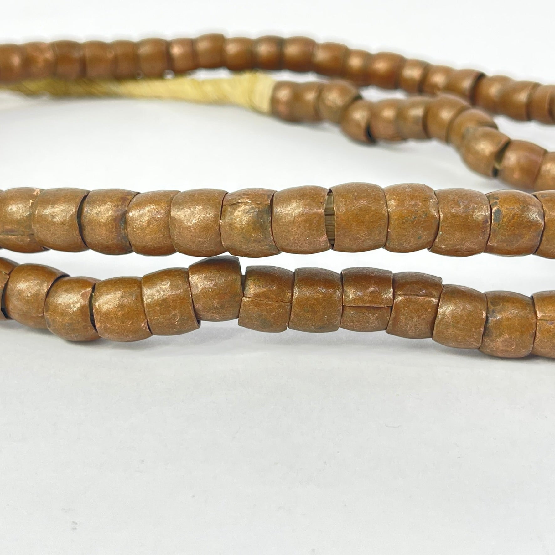 Each bead shows subtle variations in shape, surface texture, and patina, reflecting the handmade process and long use. The warm tone of aged copper develops naturally over time, giving the beads a rich character that collectors value.