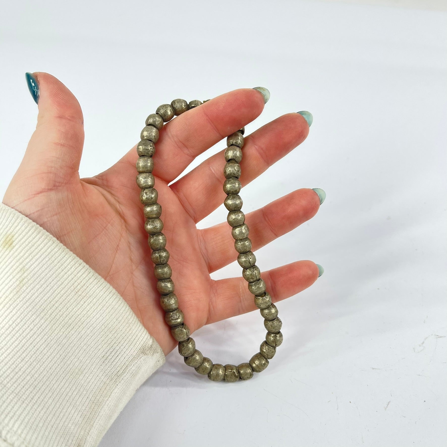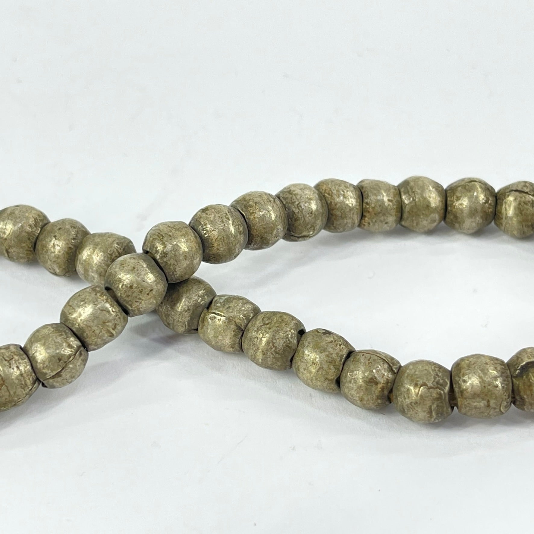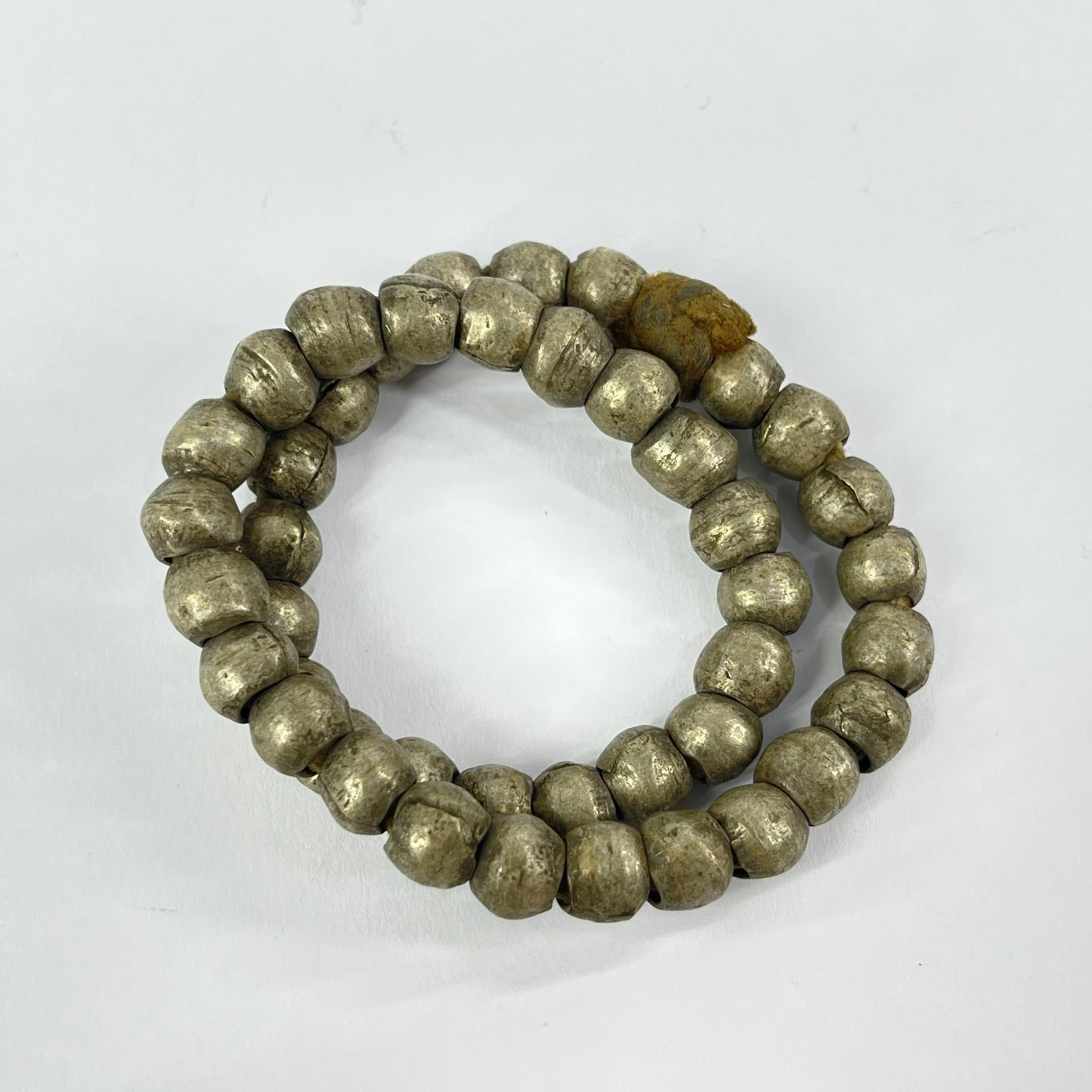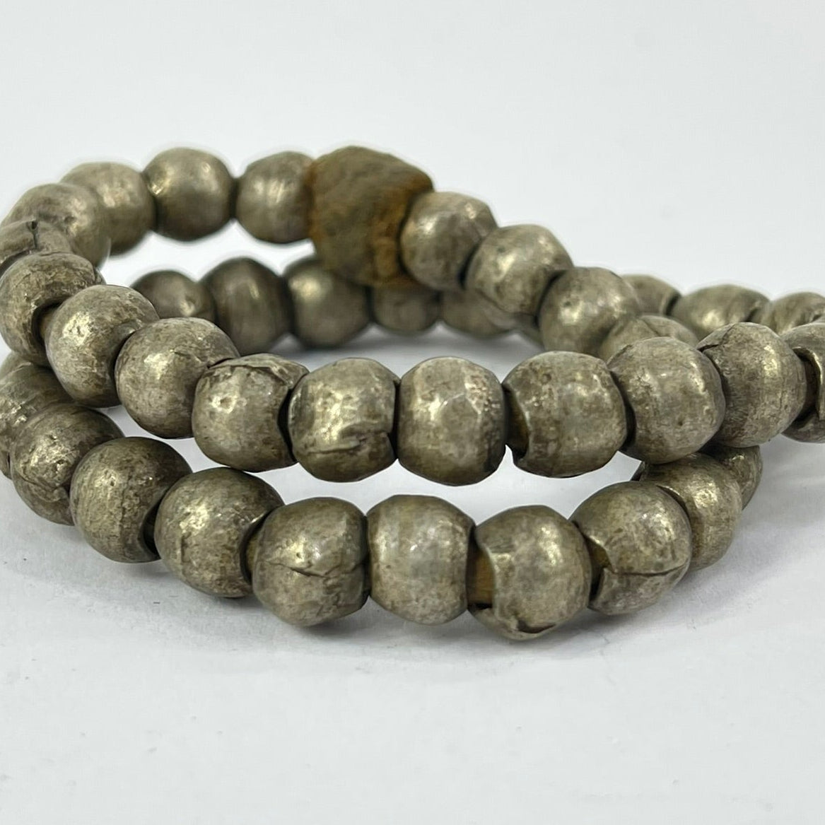 Ethiopian metal beads with a silver-colored finish, handcrafted using traditional techniques. Most Ethiopian beads are made from white metals like tin, antimony, or nickel, and these are finished to resemble aged silver. Hollow and lightweight, they show natural variation in texture and shape. Commonly used in jewelry and craft projects, their irregular forms make them especially popular as spacer beads in modern ethnic-inspired designs.