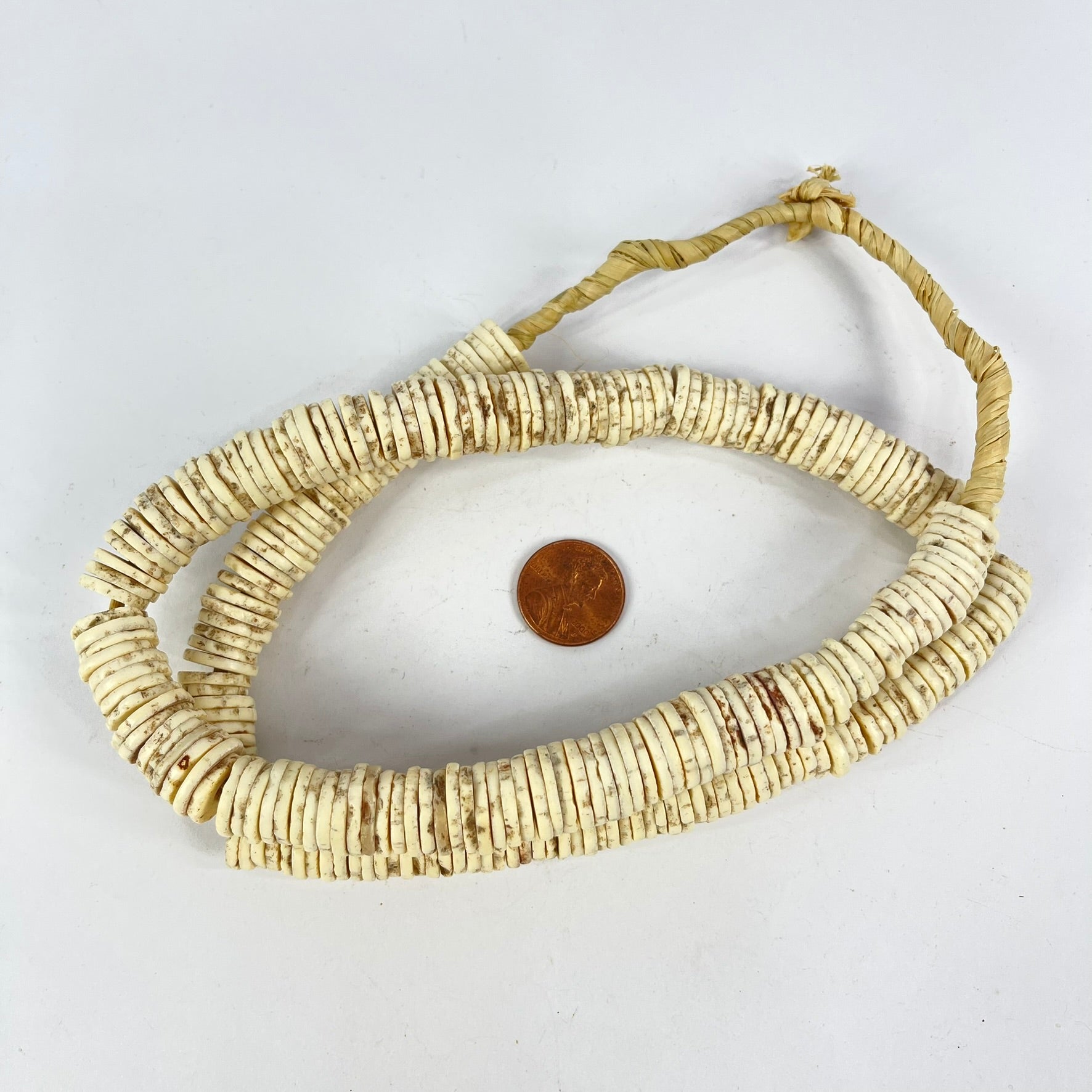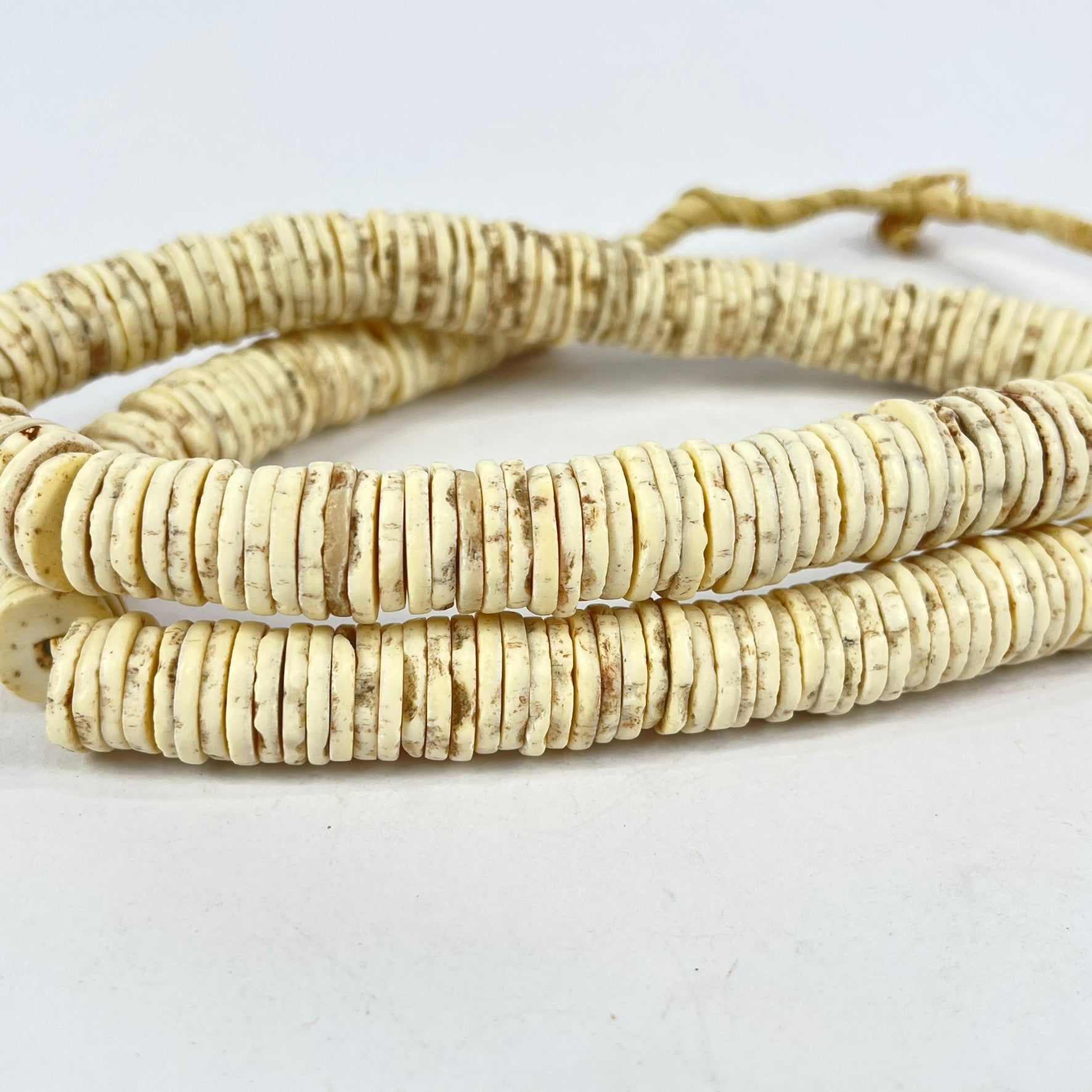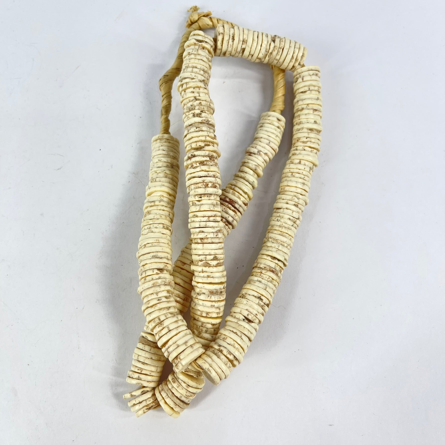 Ostrich eggshell heishi beads are a distinctive type of beadwork crafted from the shells of ostrich eggs. Indigenous to Africa, these beads have a rich cultural history and are particularly associated with the San people, who have been creating them for centuries. The term "heishi" refers to the bead's disc-like shape, and the beads are meticulously handcrafted by grinding and shaping pieces of ostrich eggshell into small, uniform discs. The resulting beads are often strung together to form intricate necklaces or jewelry pieces. Ostrich eggshell heishi beads are prized for their unique texture, natural hues, and cultural significance, making them a fascinating and sought-after component of African traditional adornments.
