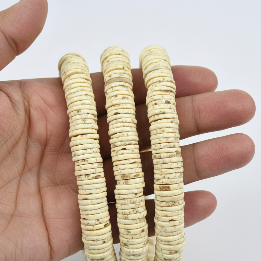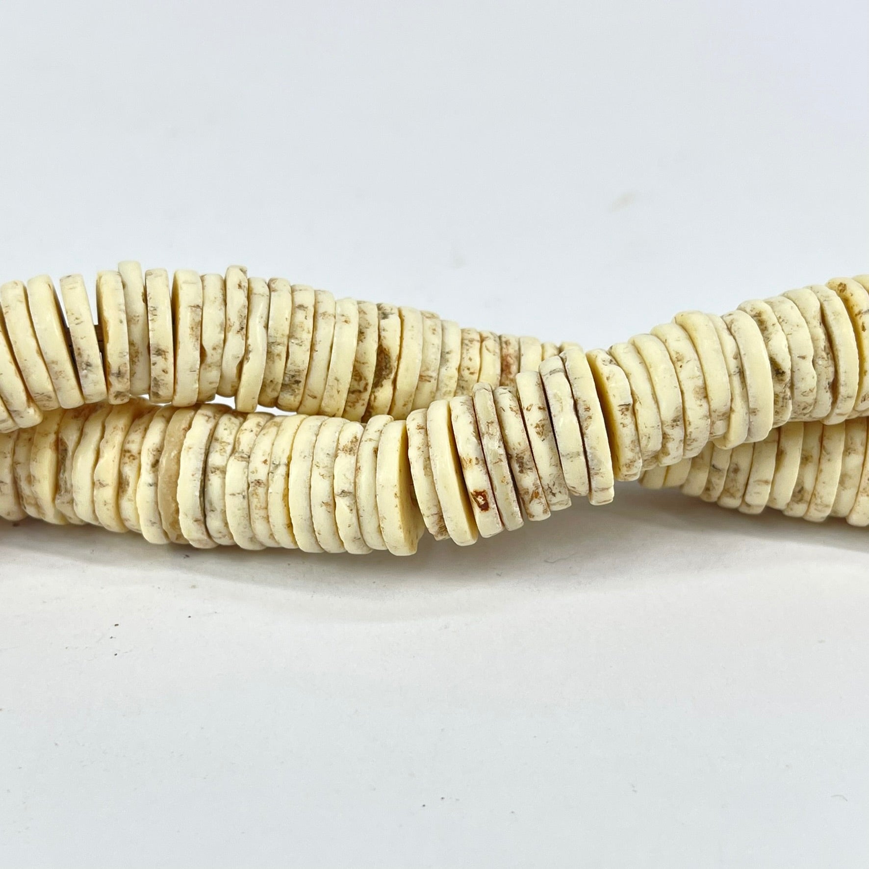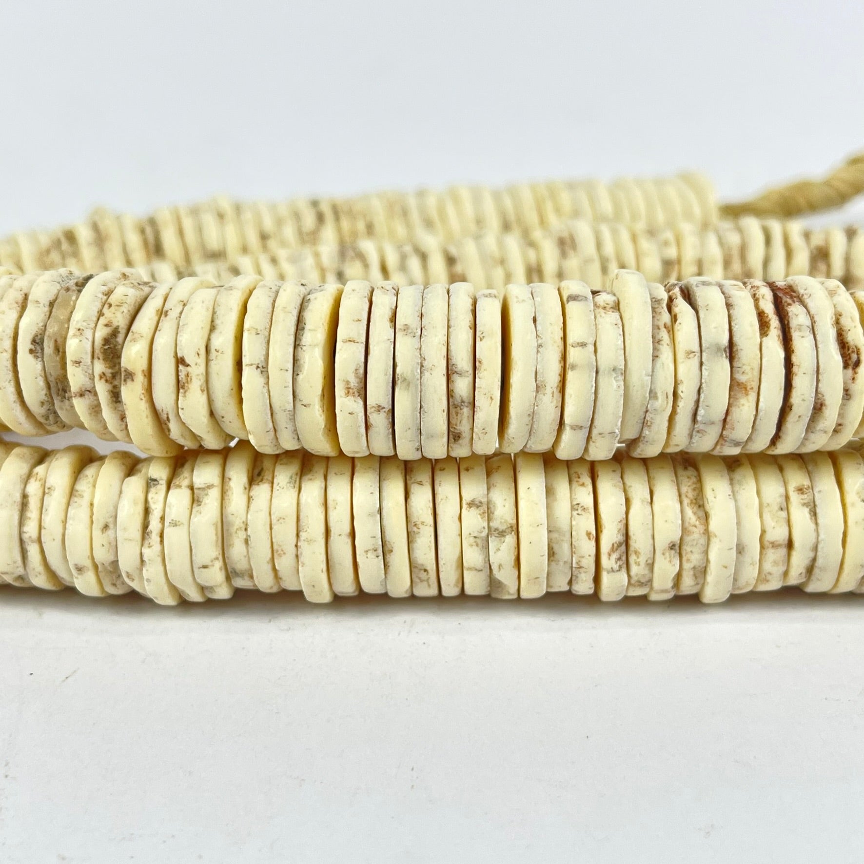 Ostrich eggshell heishi beads are a distinctive type of beadwork crafted from the shells of ostrich eggs. Indigenous to Africa, these beads have a rich cultural history and are particularly associated with the San people, who have been creating them for centuries. The term "heishi" refers to the bead's disc-like shape, and the beads are meticulously handcrafted by grinding and shaping pieces of ostrich eggshell into small, uniform discs. The resulting beads are often strung together to form intricate necklaces or jewelry pieces. Ostrich eggshell heishi beads are prized for their unique texture, natural hues, and cultural significance, making them a fascinating and sought-after component of African traditional adornments.