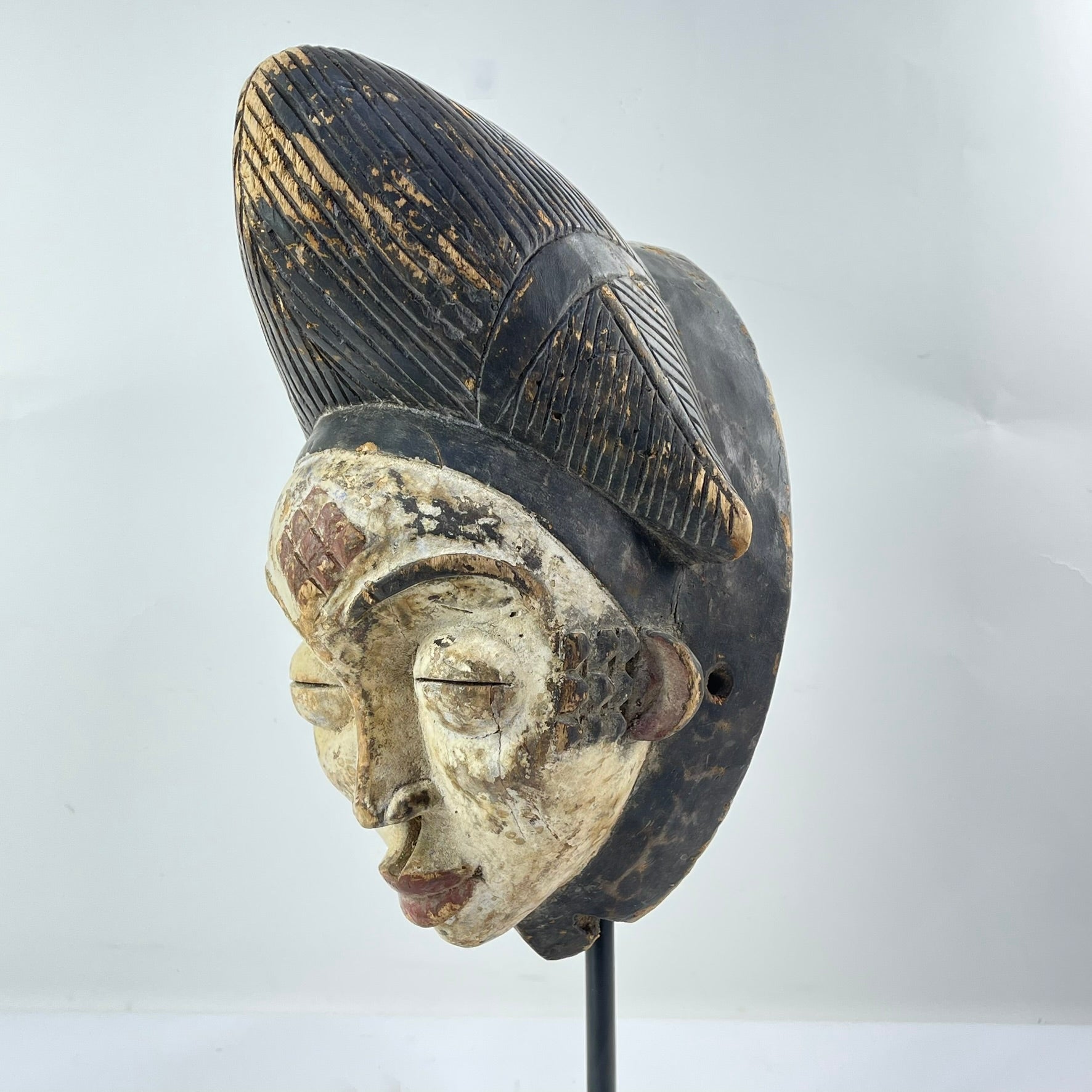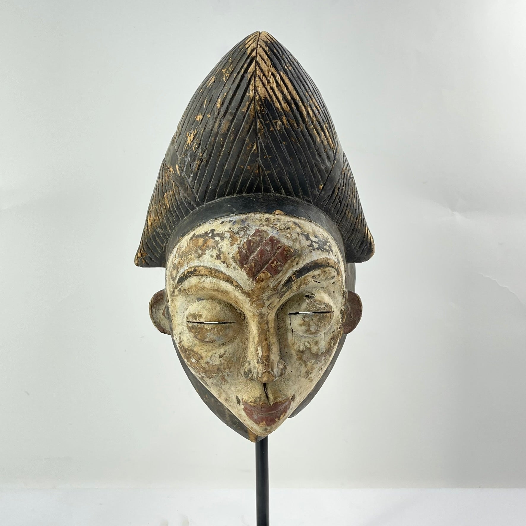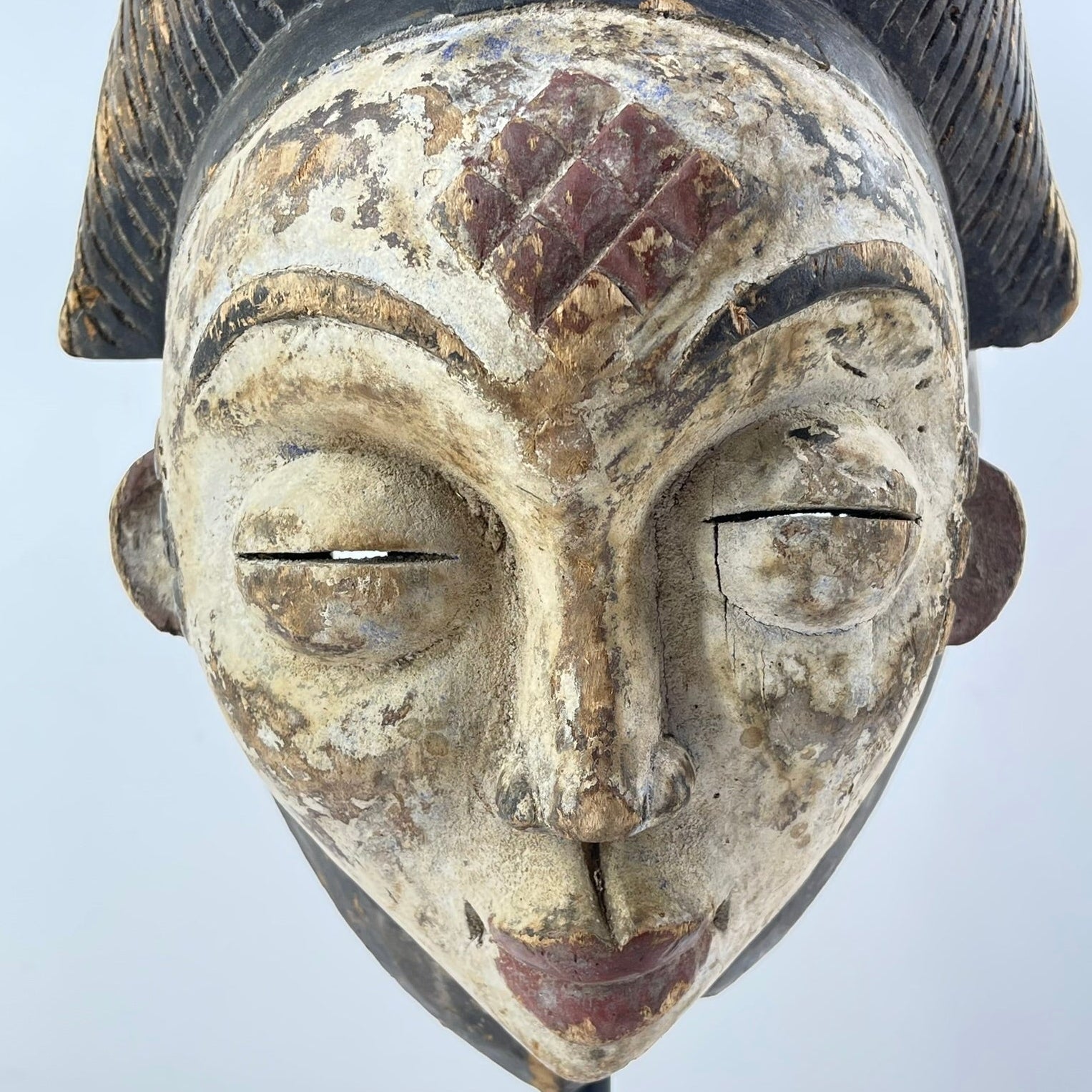The Mmwo mask's design, with its smooth, symmetrical features, evokes the appearance of tribal women and is said to represent a female ancestor, particularly during the Punu’s burial ceremonies. In the Mukui (also known as Moukouj or Mukuji) society, the mask’s wearer—often performing on stilts—participates in the full moon dance, an event that holds both spiritual and communal significance. The refined features and stylized coiffure found on the Punu masks mirror the aesthetic ideals of the community, further reinforcing the mask’s connection to the social and cultural ideals of beauty, ancestry, and protection.